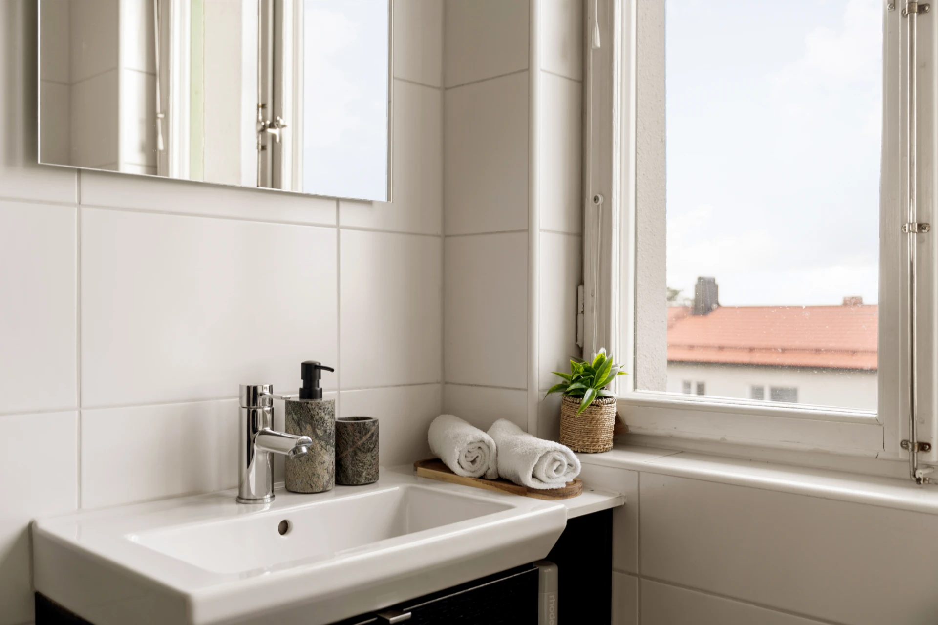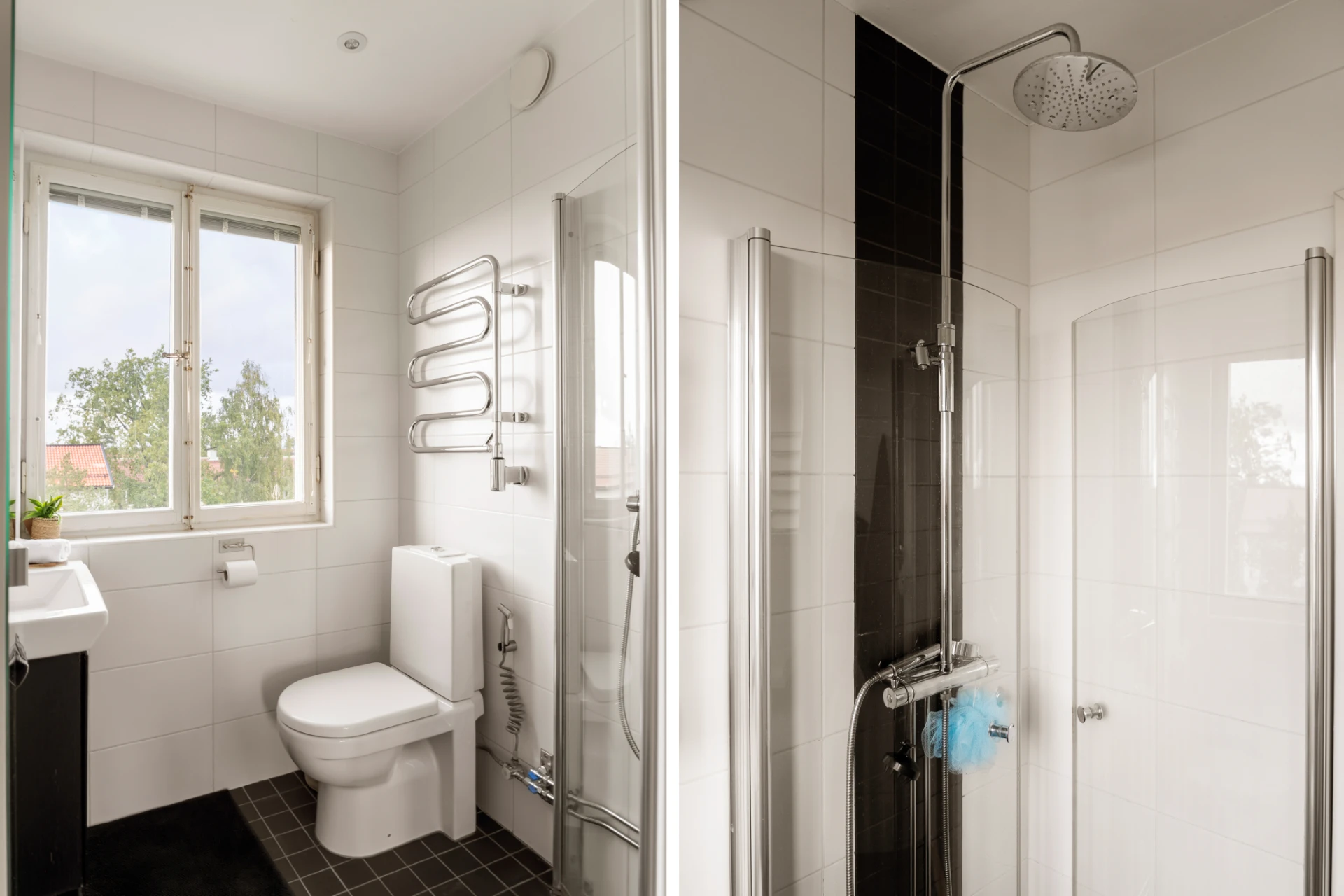 Klinkergolv och kaklade väggar. WC, handduksvärmare, handfat med kommod och spegelskåp samt golvvärme. Dusch med vikbara duschväggar. Infällda spotlights i taket. Fönster.