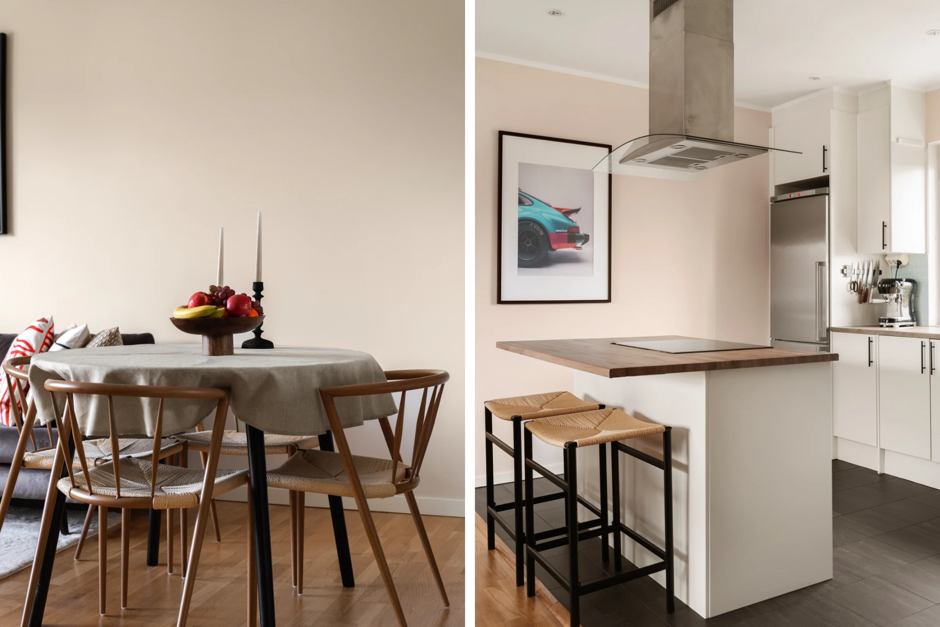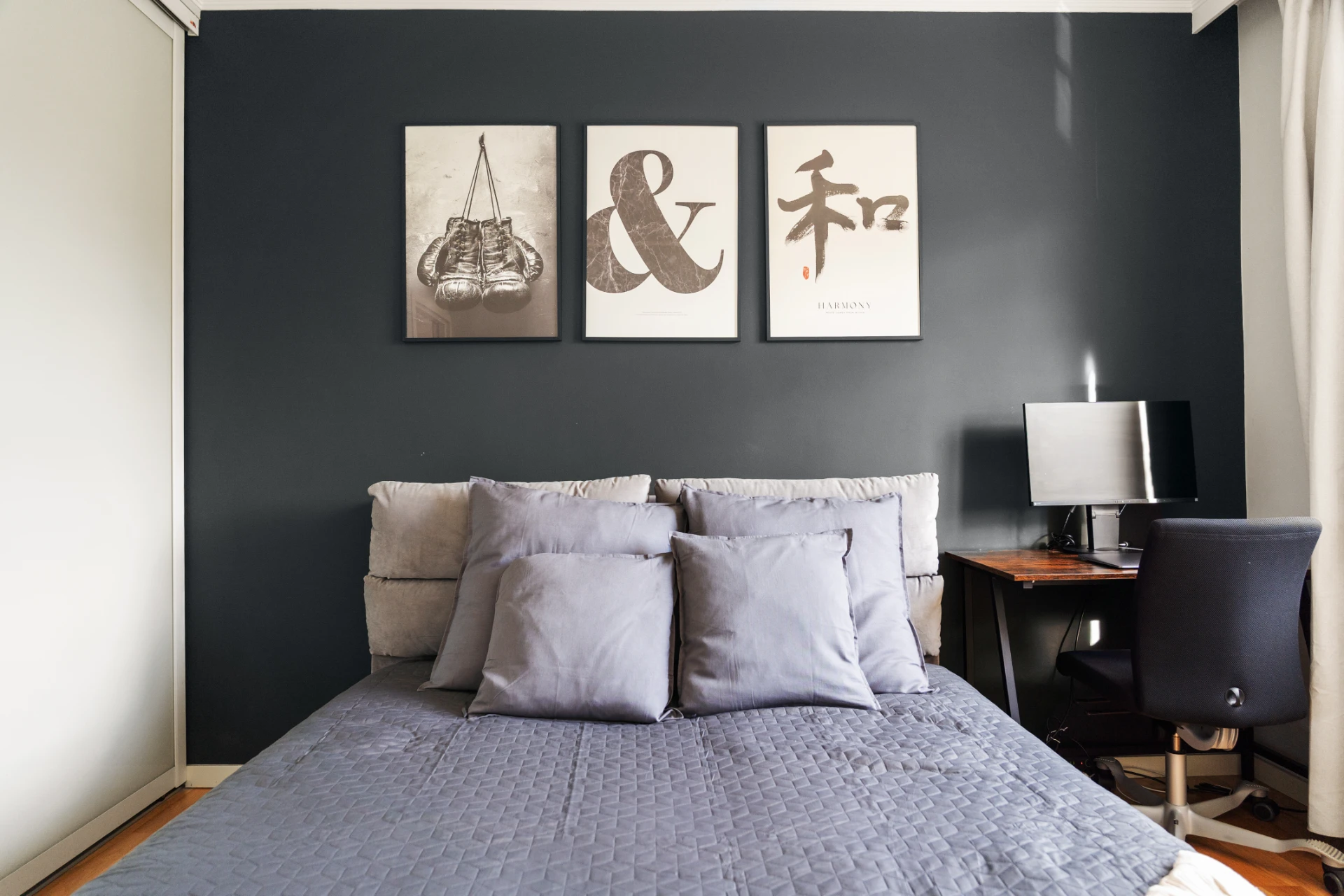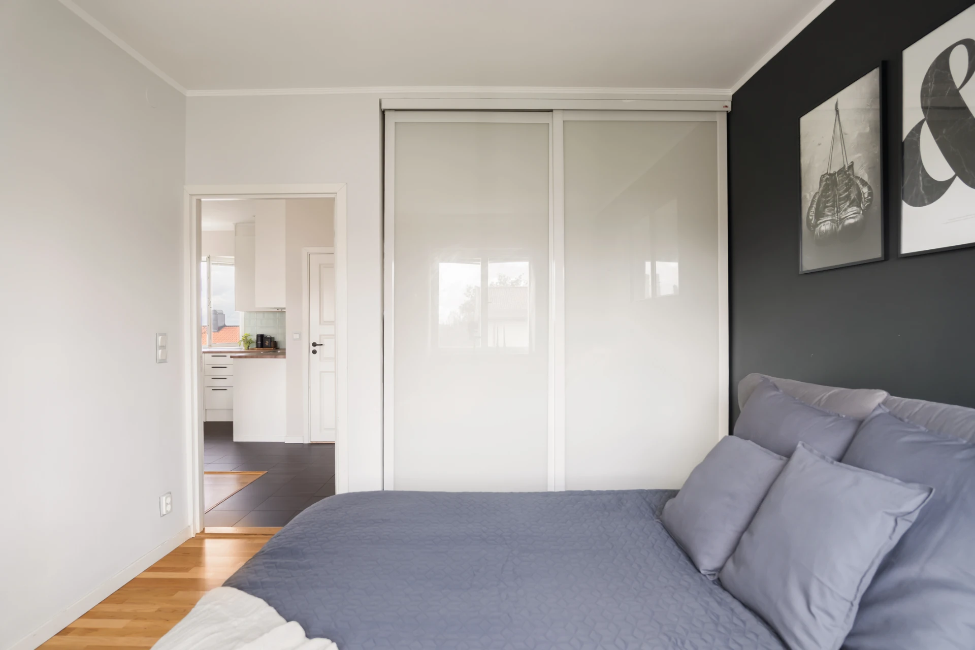 Parkettgolv och målade väggar. Kornischer i taket vid garderinerna som ramar in de fint. Fönster och utgång till lägenhetens balkong i soligt söderläge. Infällda spotlights i taket.