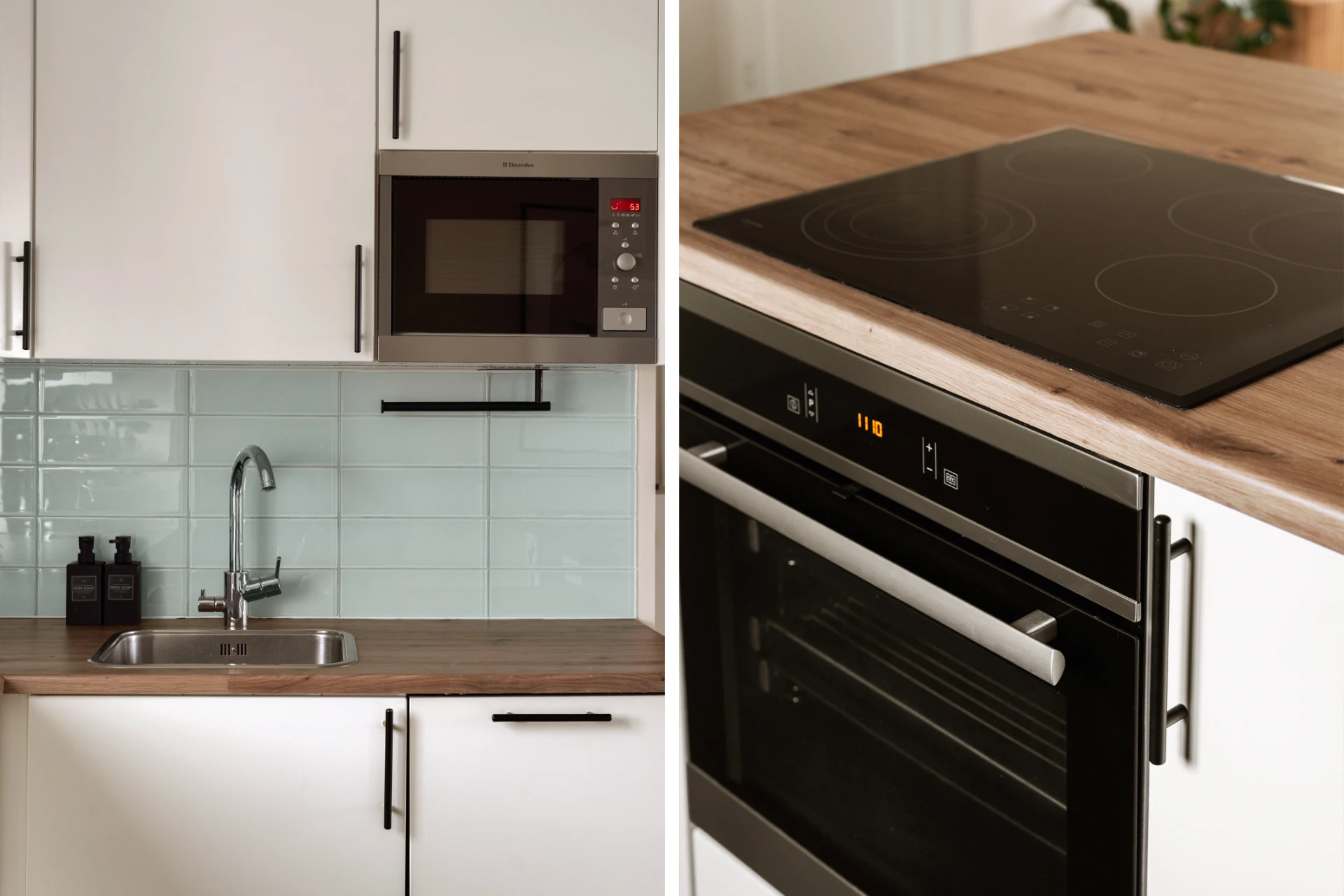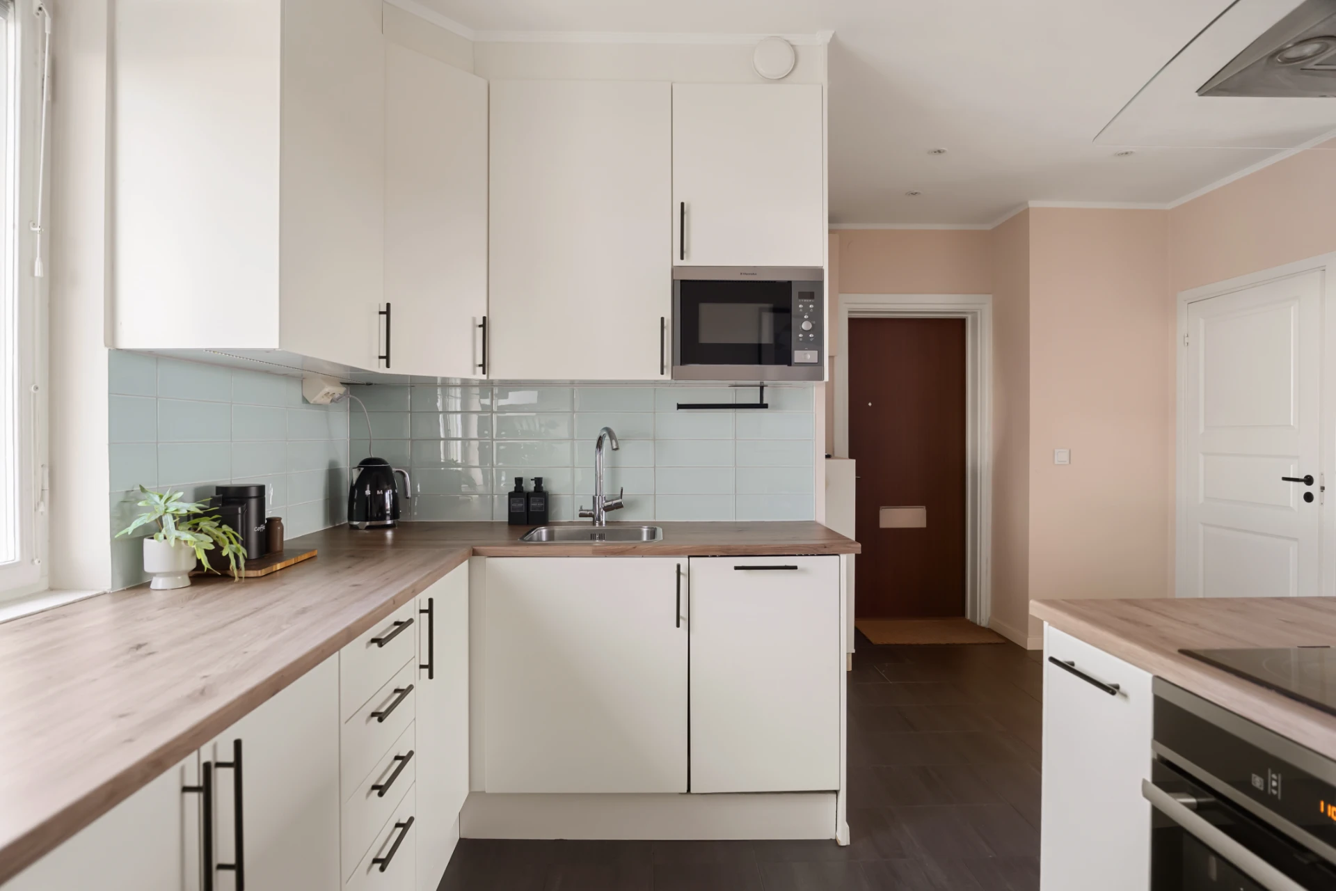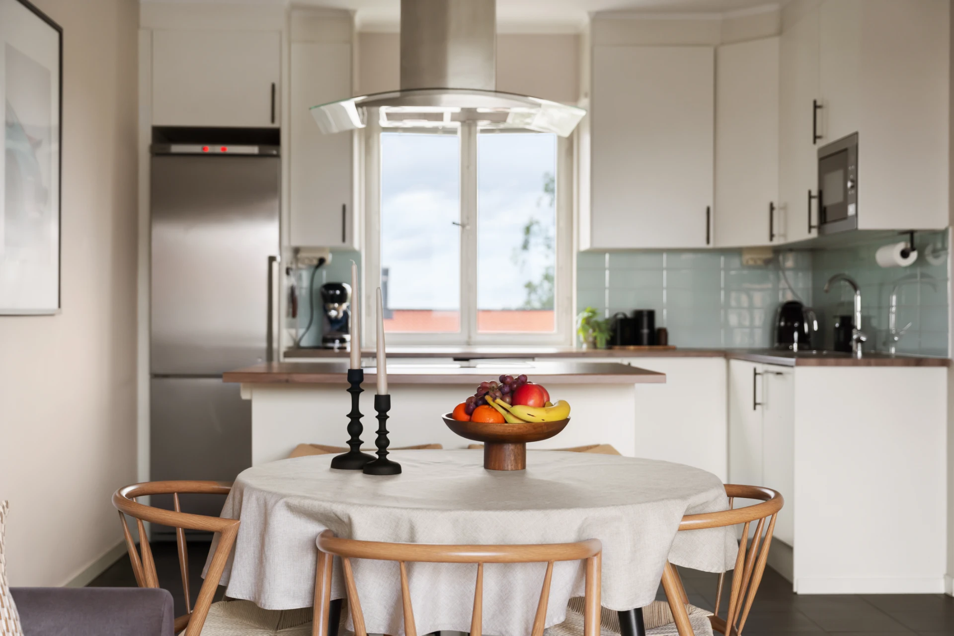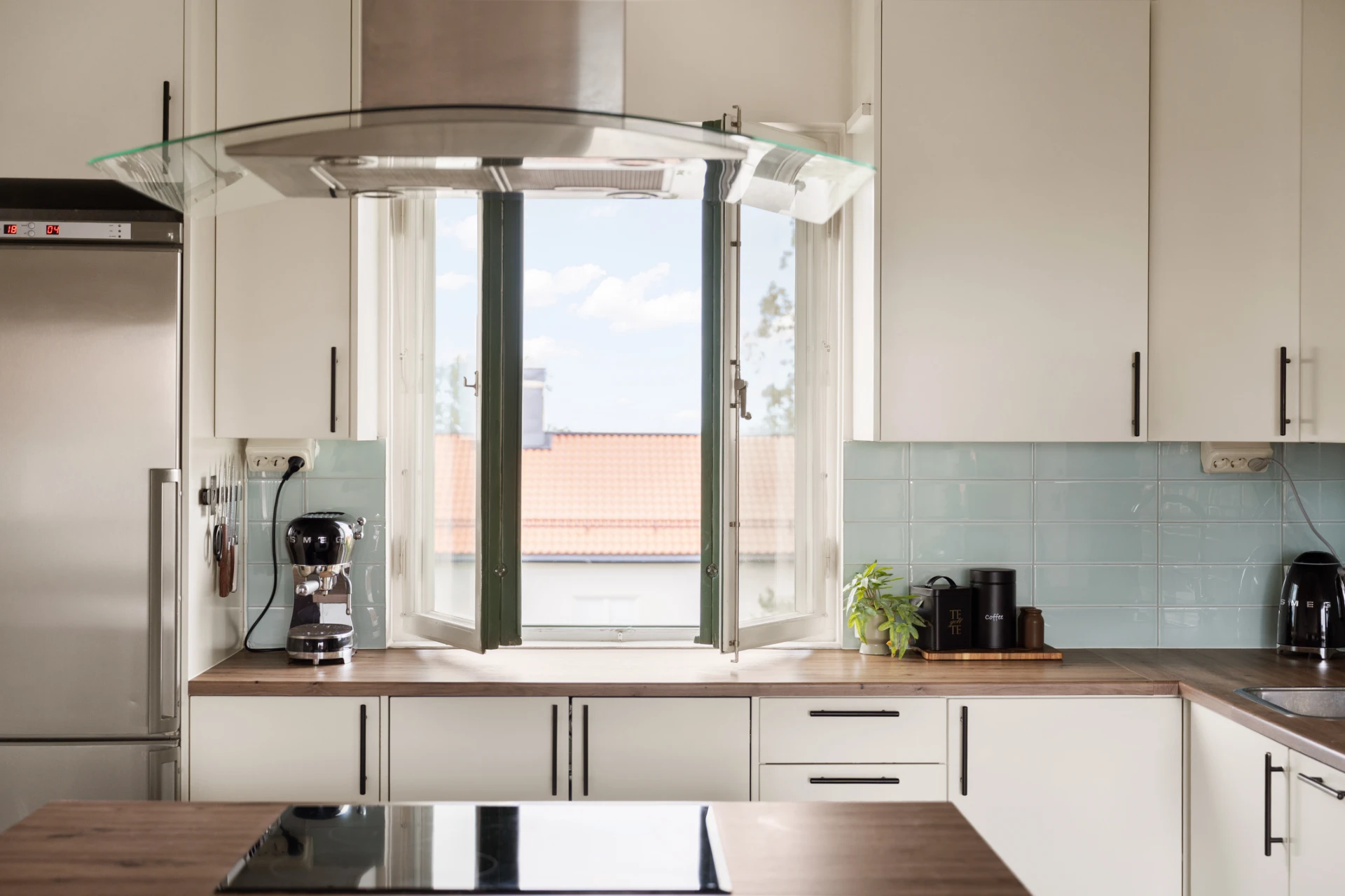 Klinkergolv och ljusa väggar. Vita skåpsluckor med svarta handtag. Kakel ovan arbetsytor. Rostfri kyl/frys, diskmaskin och tvättmaskin. Köksö med förvaring, inbyggnadsugn och häll samt fläkt. Fönster och infällda spotlights i taket.