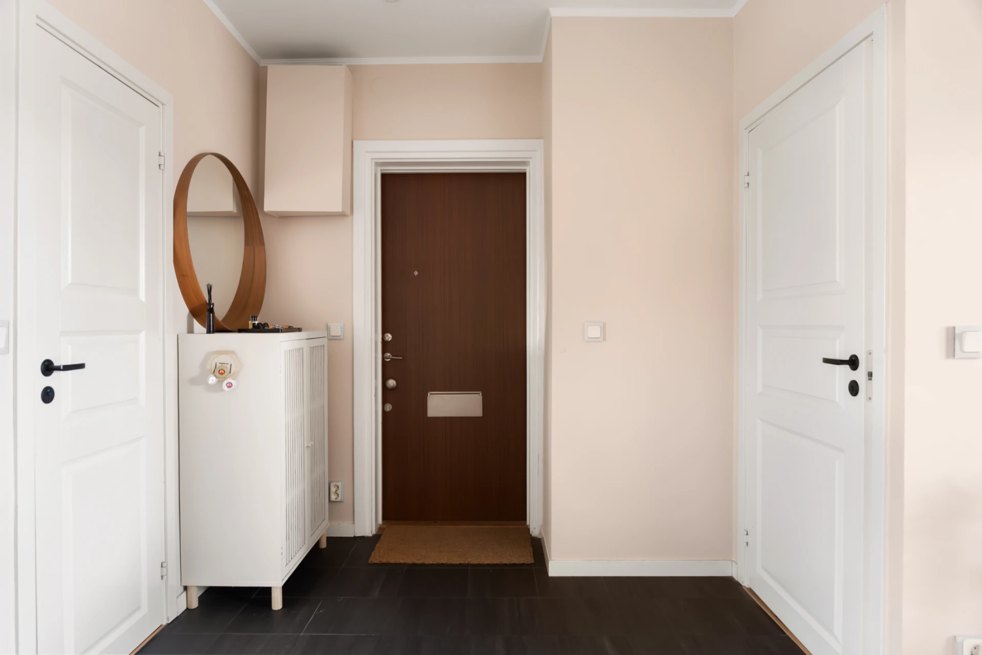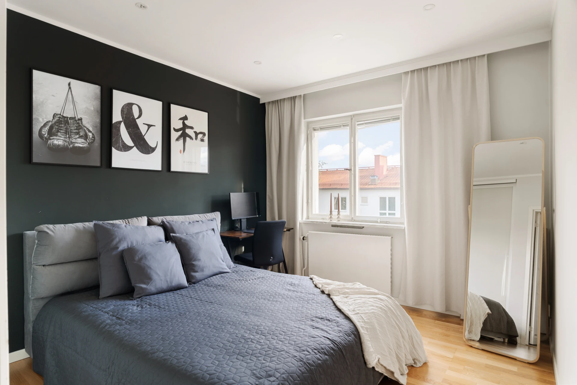Parkettgolv och målade väggar. Kornischer i taket vid gardinerna som ramar in det fint. Garderob med skjutdörrar och infällda spotlights i taket. Fönster.