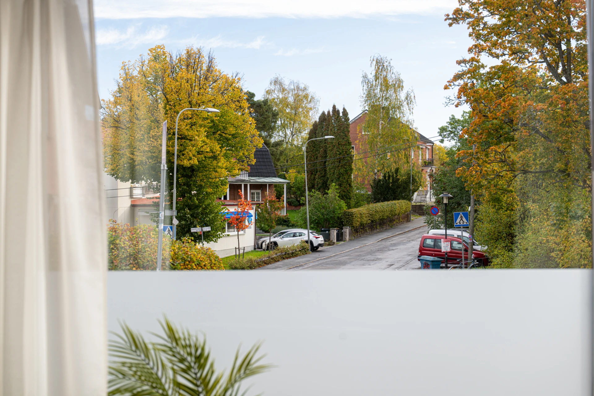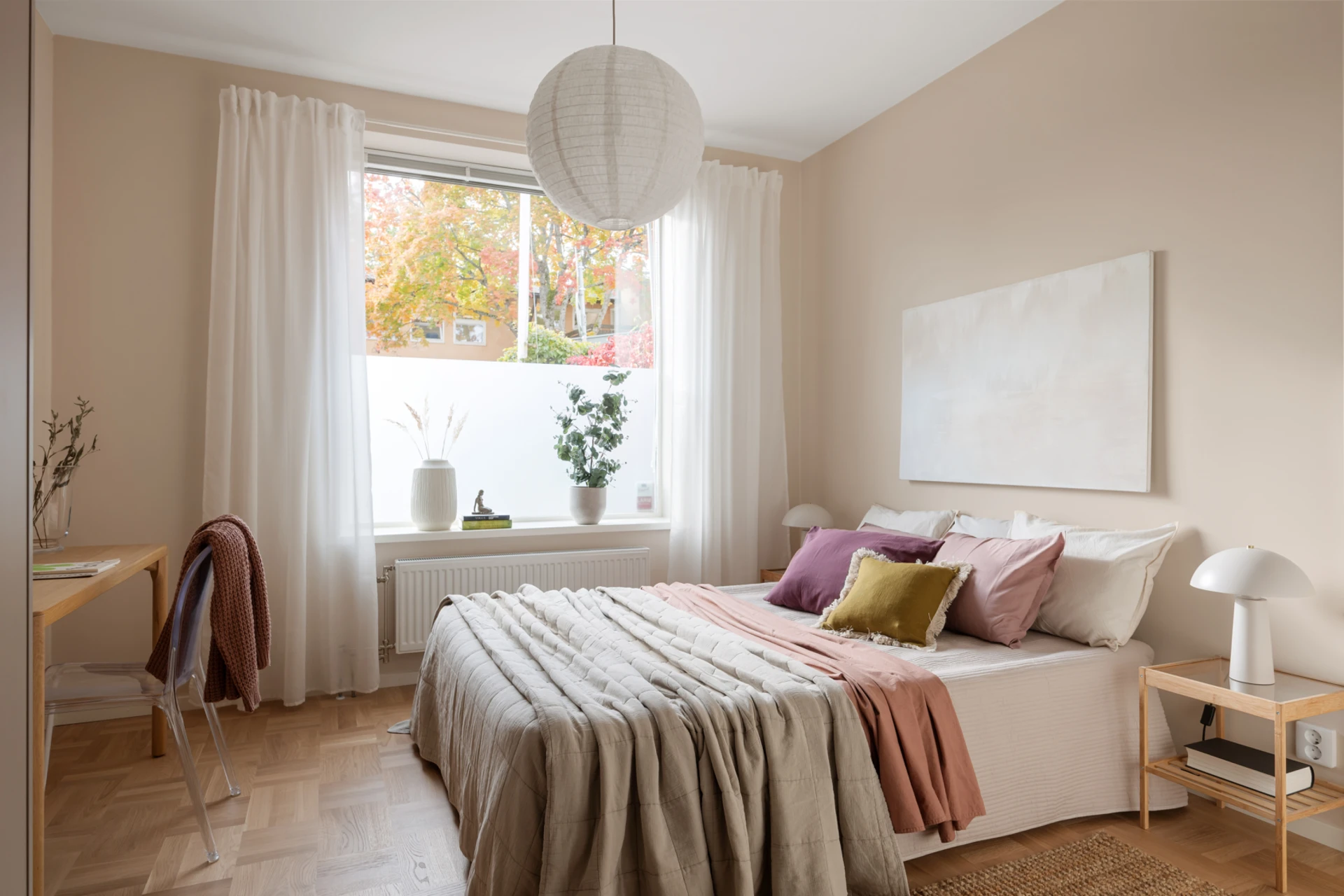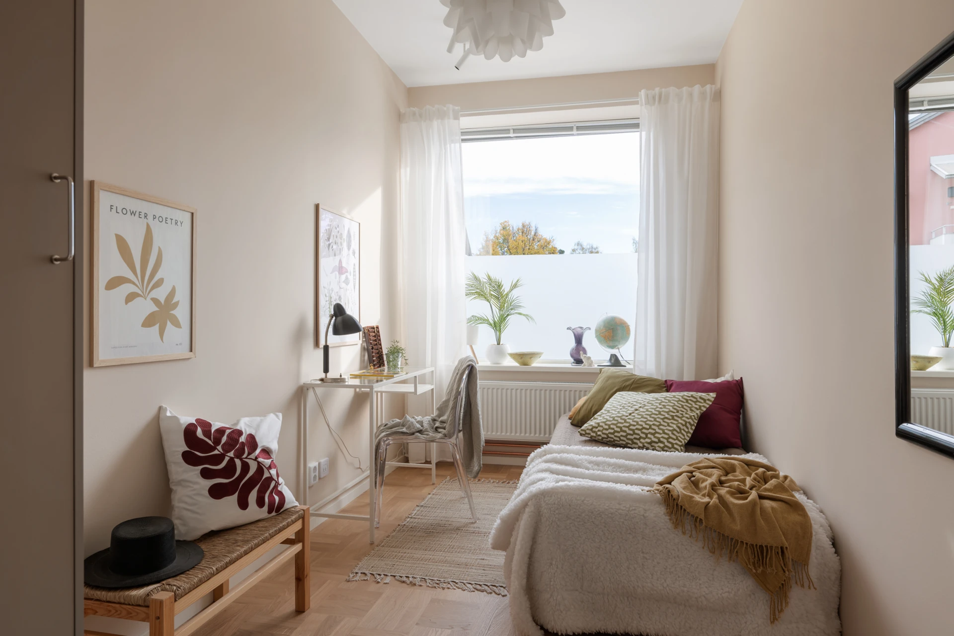 Ljust och smart planerat rum med stort fönster. Perfekt som barnrum, gästrum eller hemmakontor. Här ryms enkelt säng/soffa, skrivbord och förvaring, och de varma väggarna tillsammans med parketten skapar en ombonad känsla.