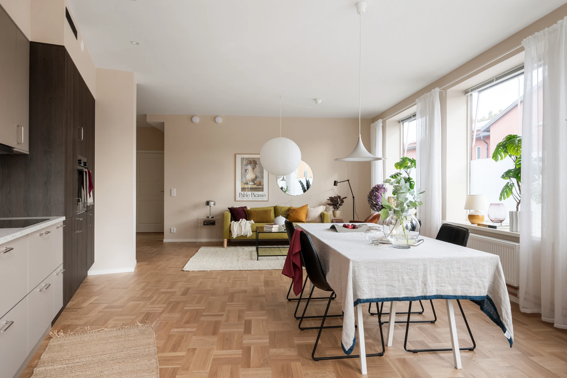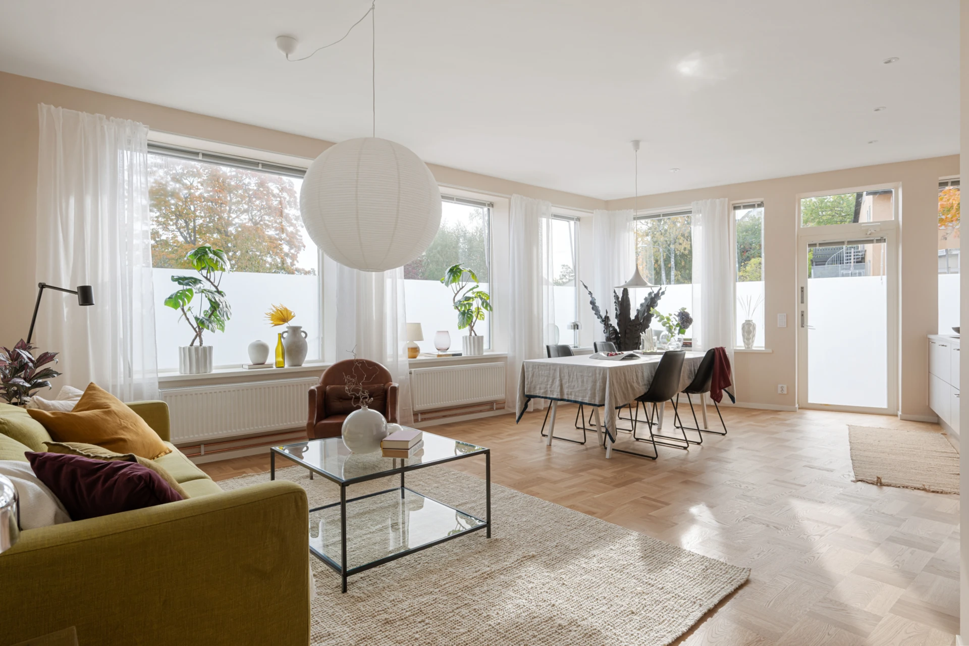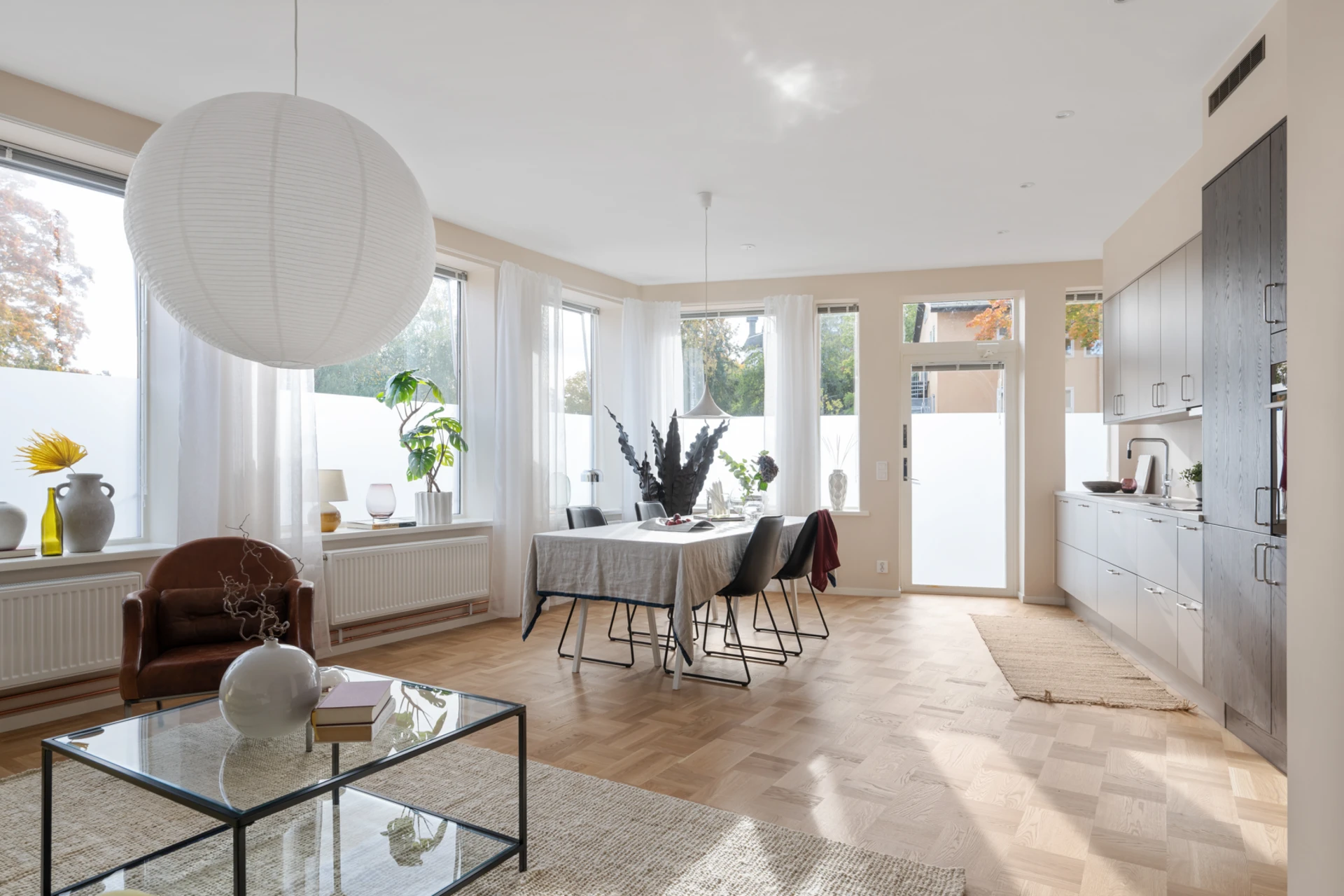 Det luftiga vardagsrummet och köket i öppen planlösning blir hemmets självklara samlingspunkt. Här flödar ljuset in genom flera stora fönster som vetter mot uteplatsen, vilket skapar en härlig rymd och trivsam atmosfär. Köket är smakfullt inrett med släta luckor i mjuka nyanser och gott om arbetsyta. Plats finns för både stort matbord och soffgrupp, perfekt för middagar och umgänge med familj och vänner.
