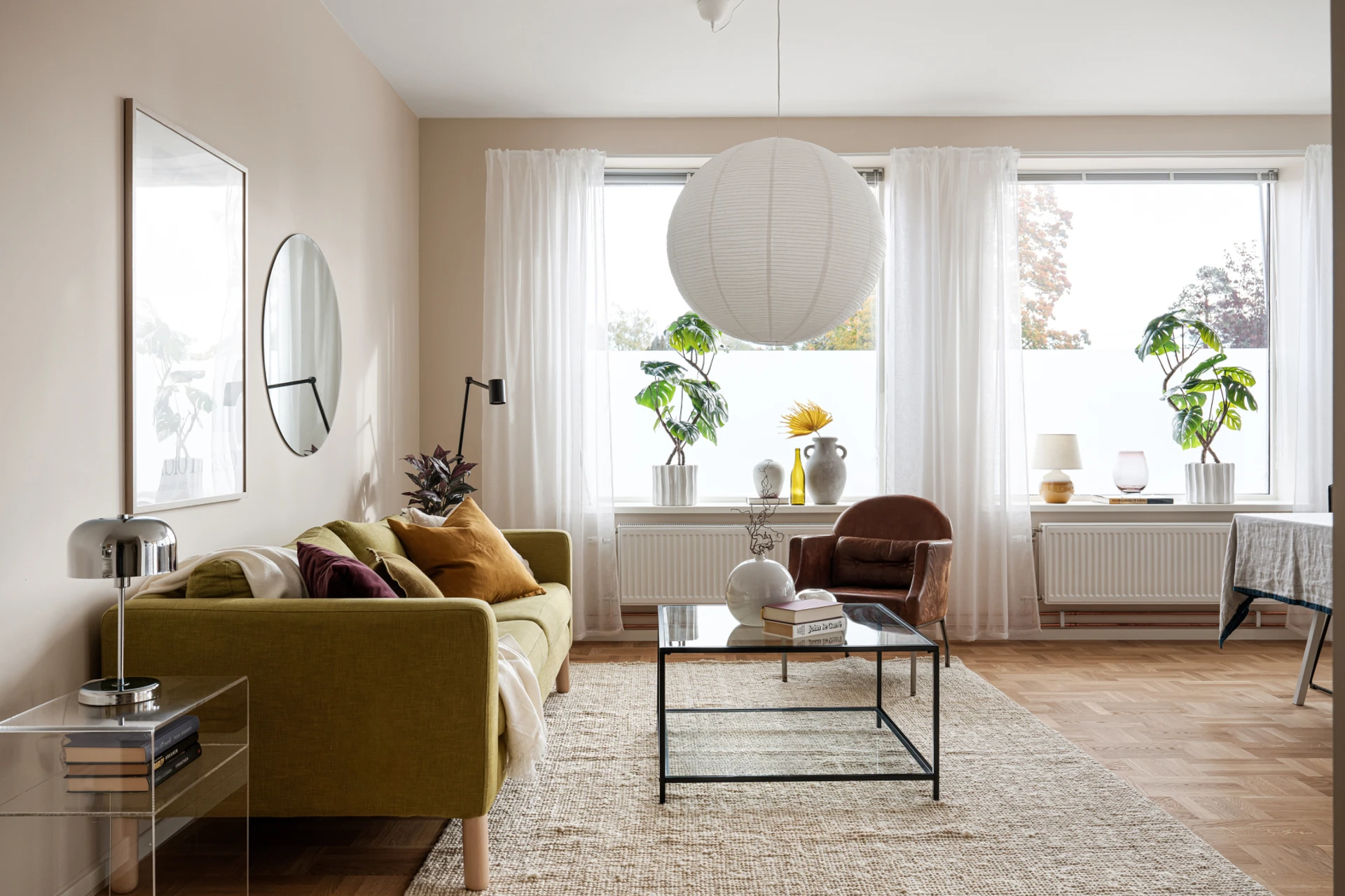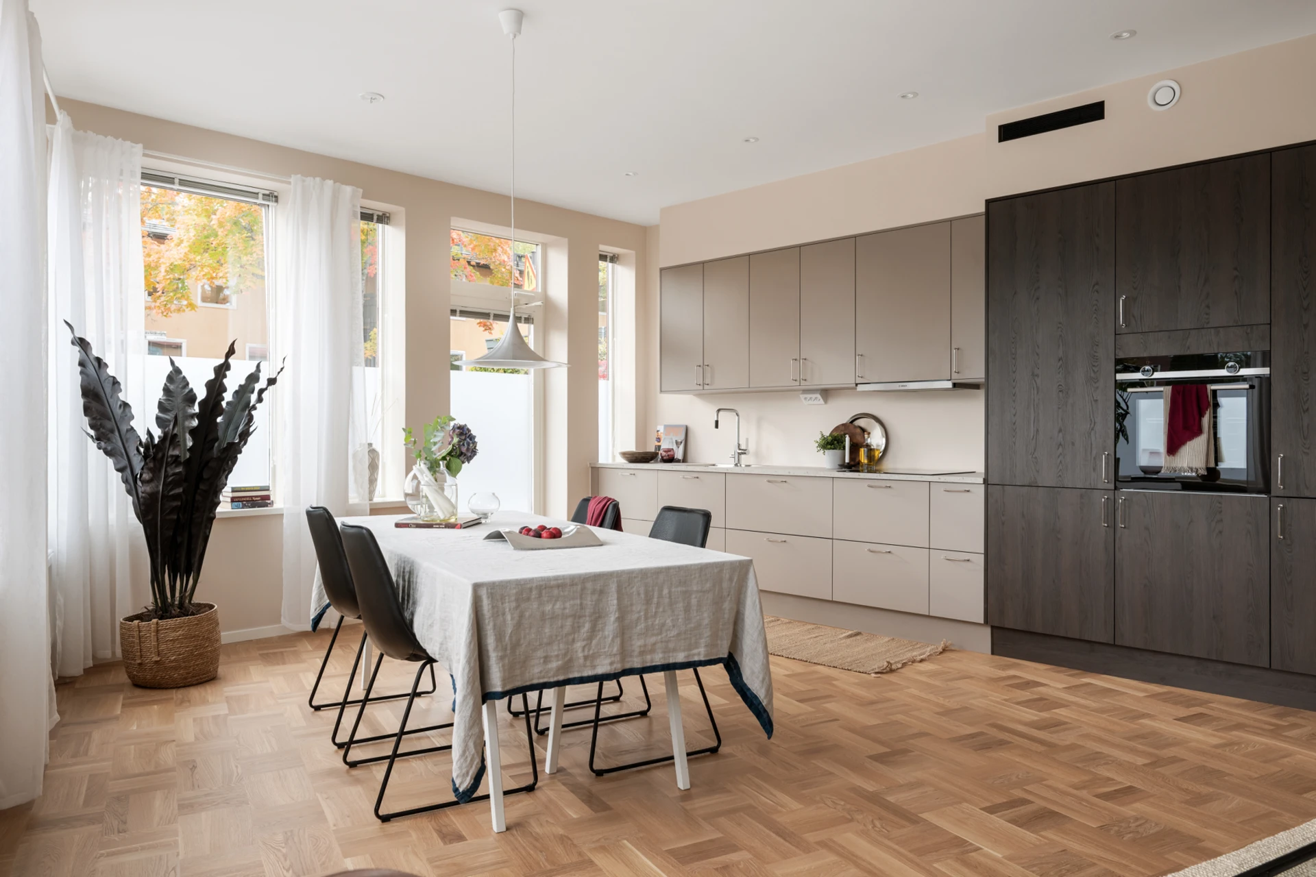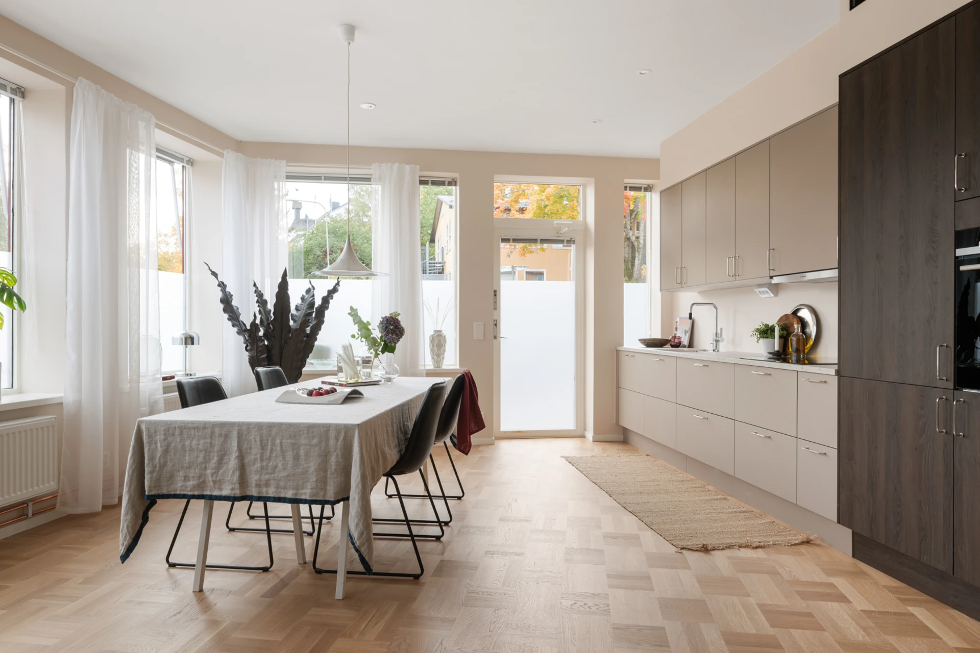 Det luftiga vardagsrummet och köket i öppen planlösning blir hemmets självklara samlingspunkt. Här flödar ljuset in genom flera stora fönster som vetter mot uteplatsen, vilket skapar en härlig rymd och trivsam atmosfär. Köket är smakfullt inrett med släta luckor i mjuka nyanser och gott om arbetsyta. Plats finns för både stort matbord och soffgrupp, perfekt för middagar och umgänge med familj och vänner.