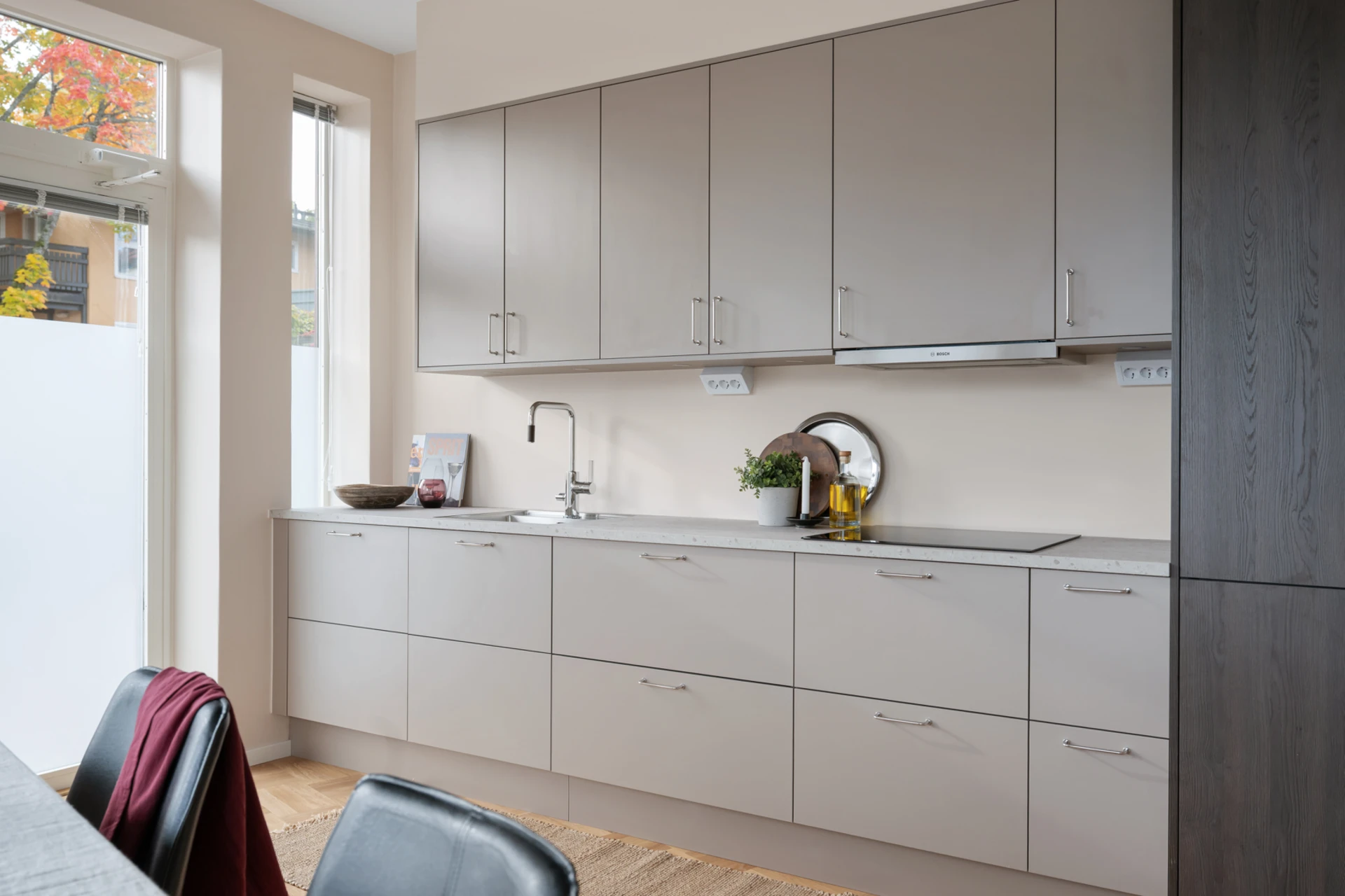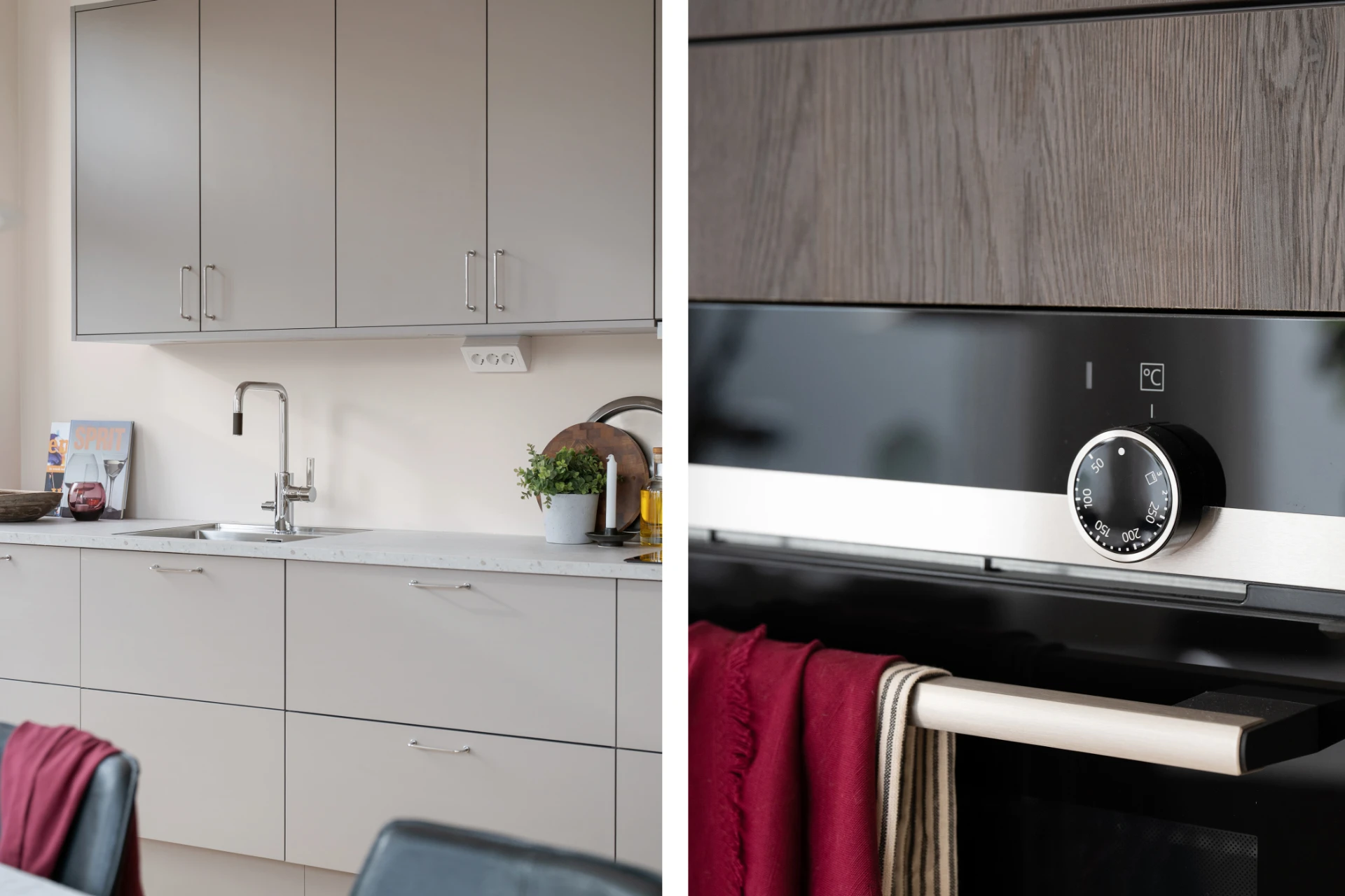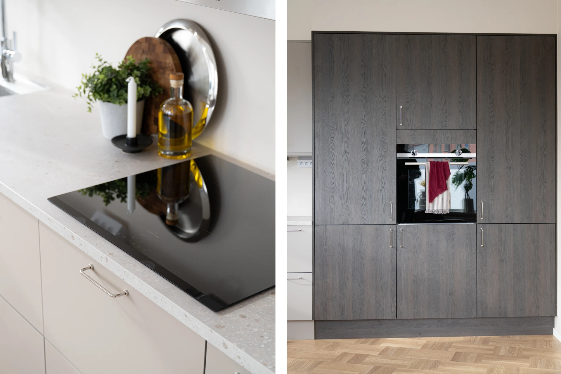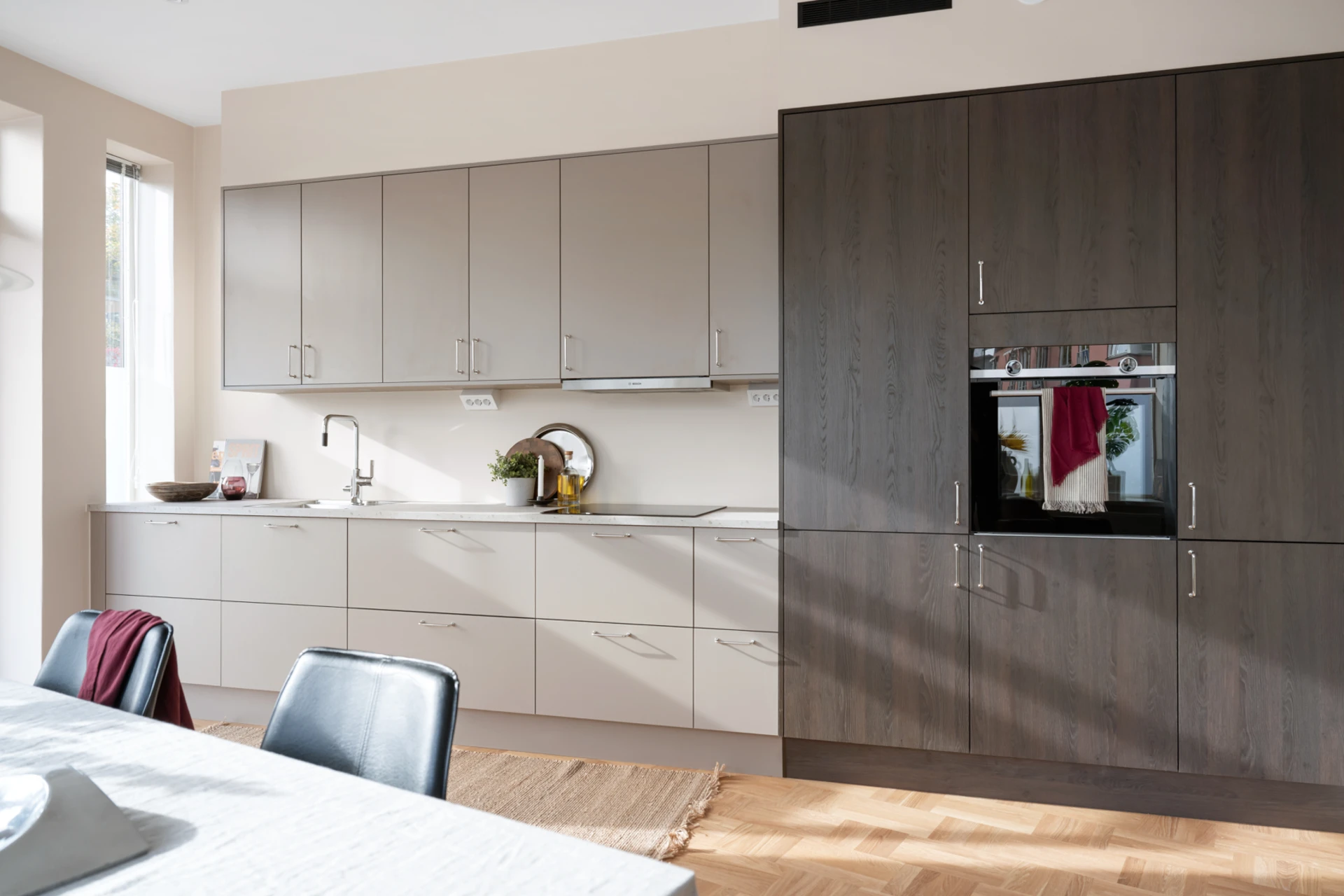Snickerier: HTH kök med luckor i modell Stockholm (ljus mocka) och MOOD (mörk trästruktur).