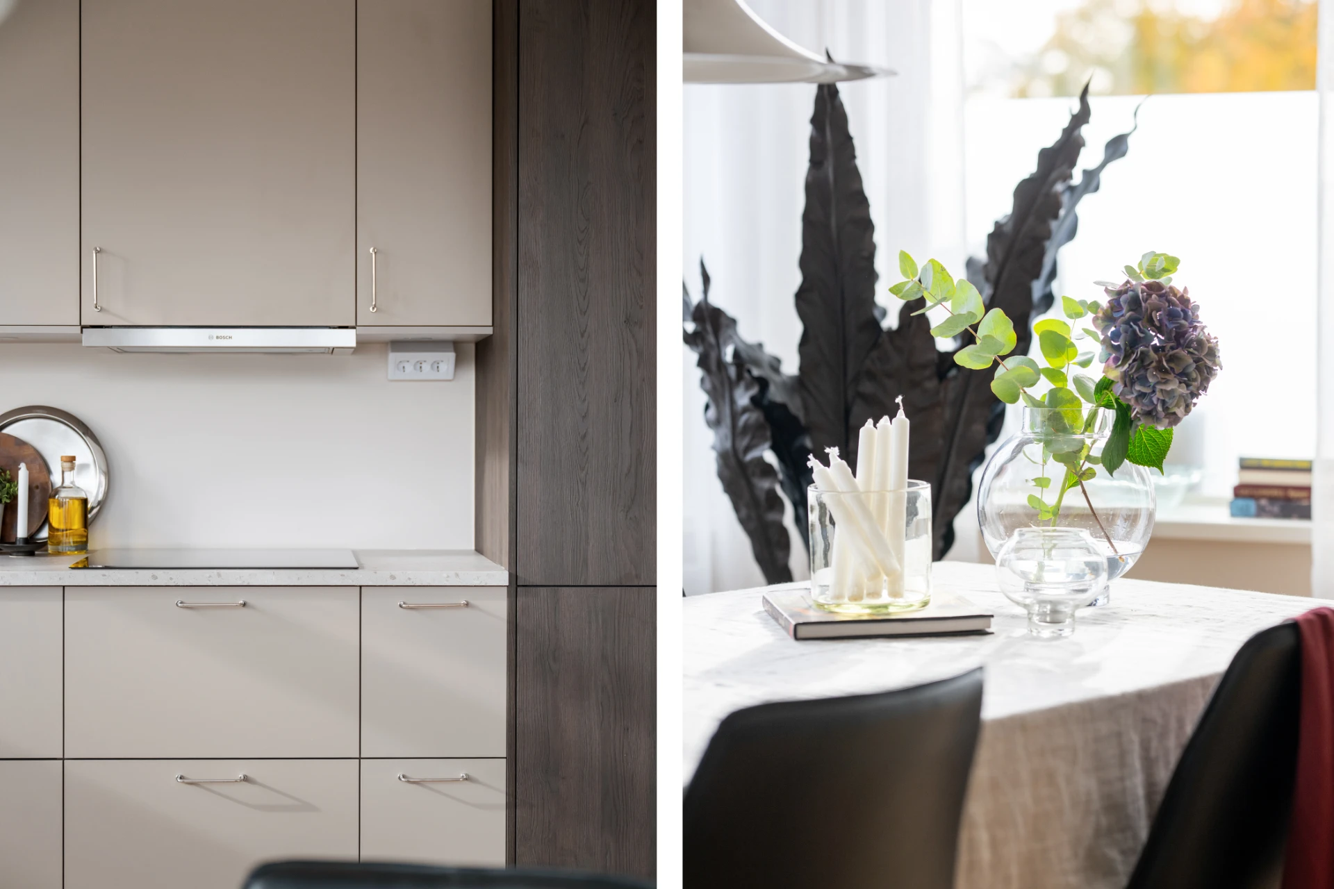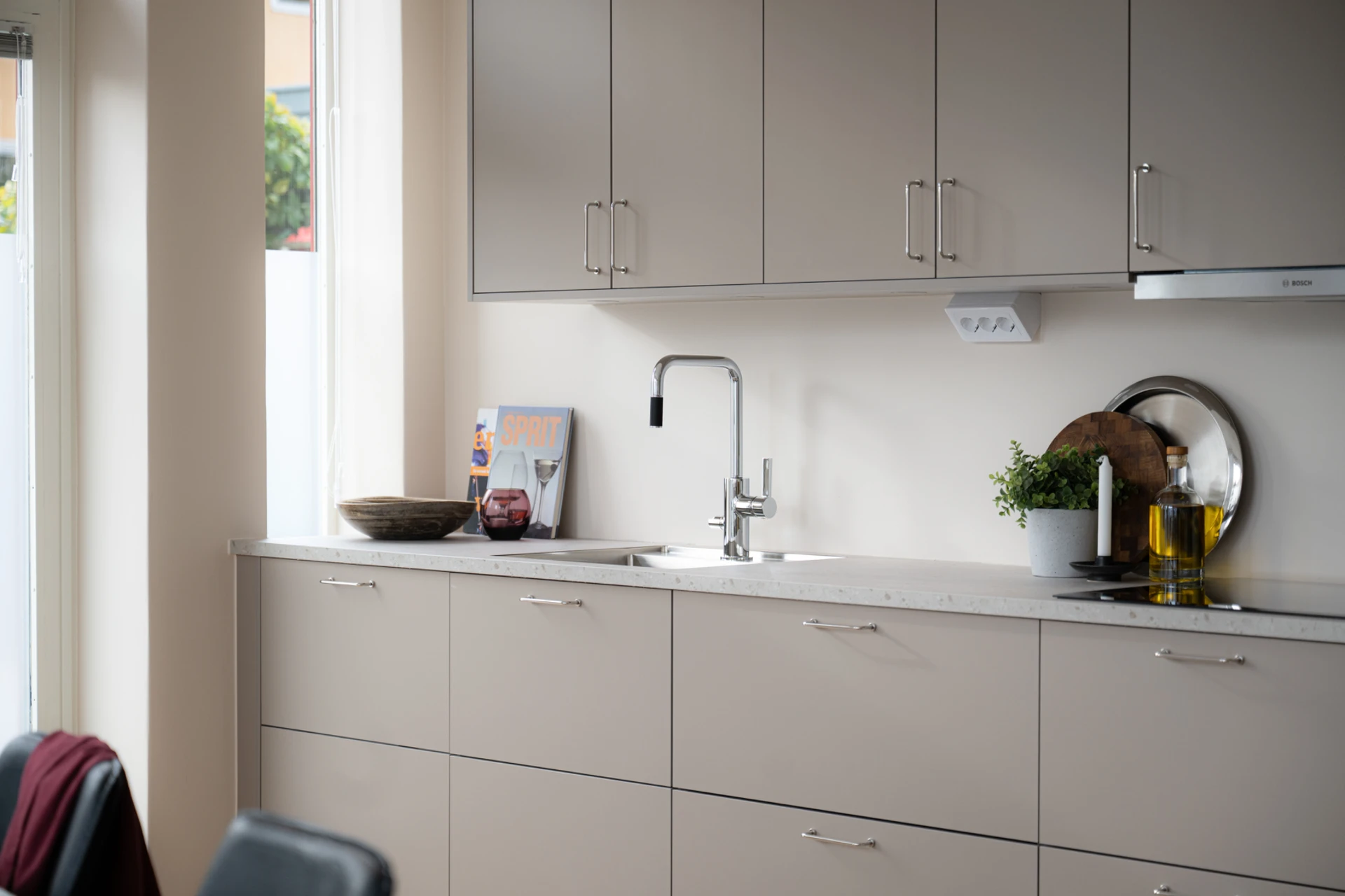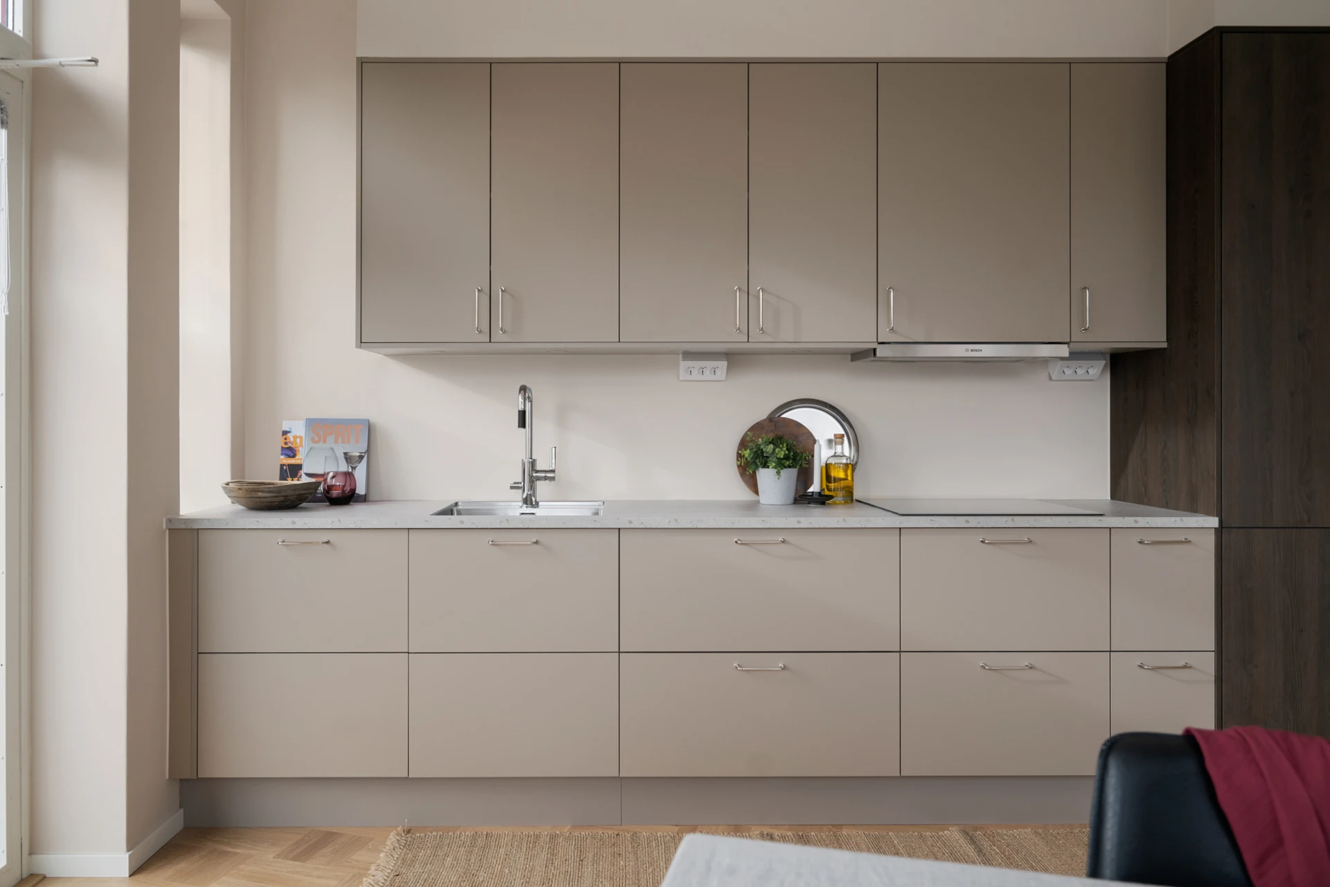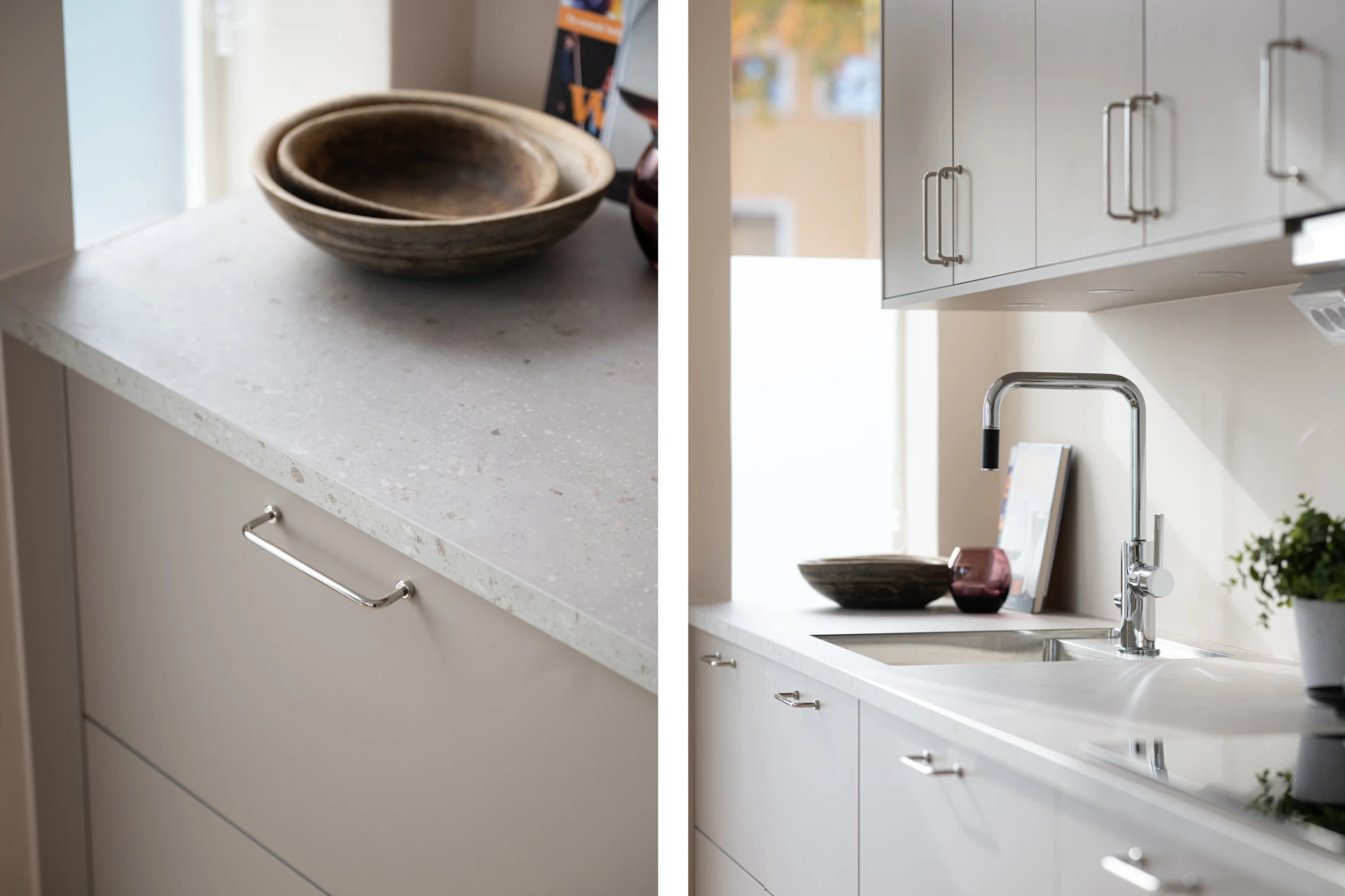 Snickerier: HTH kök med luckor i modell Stockholm (ljus mocka) och MOOD (mörk trästruktur).