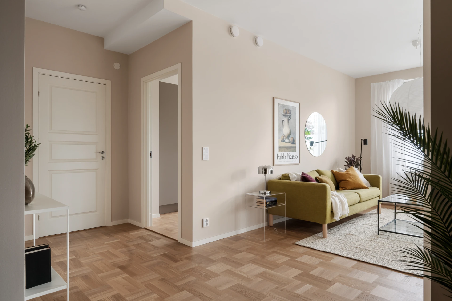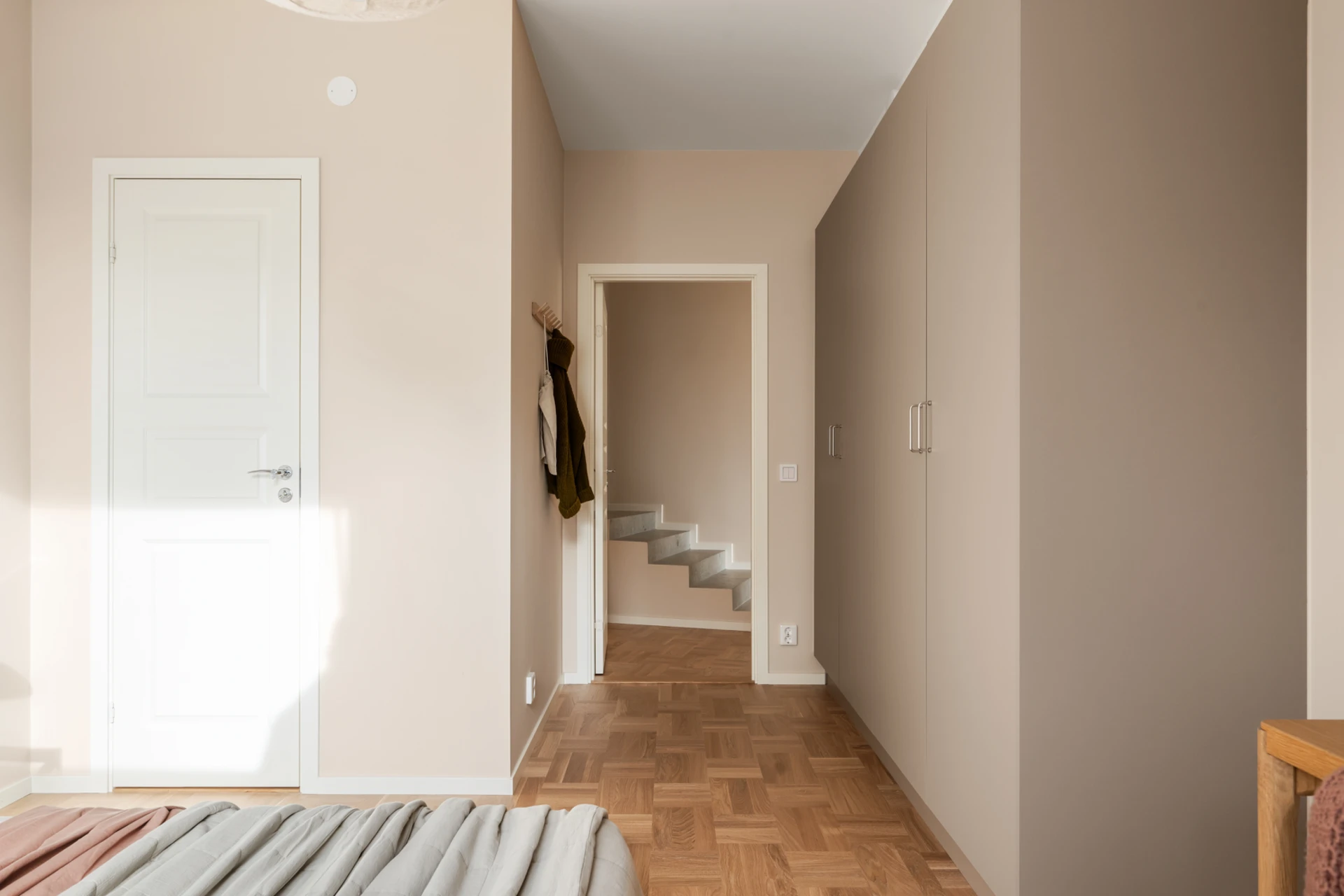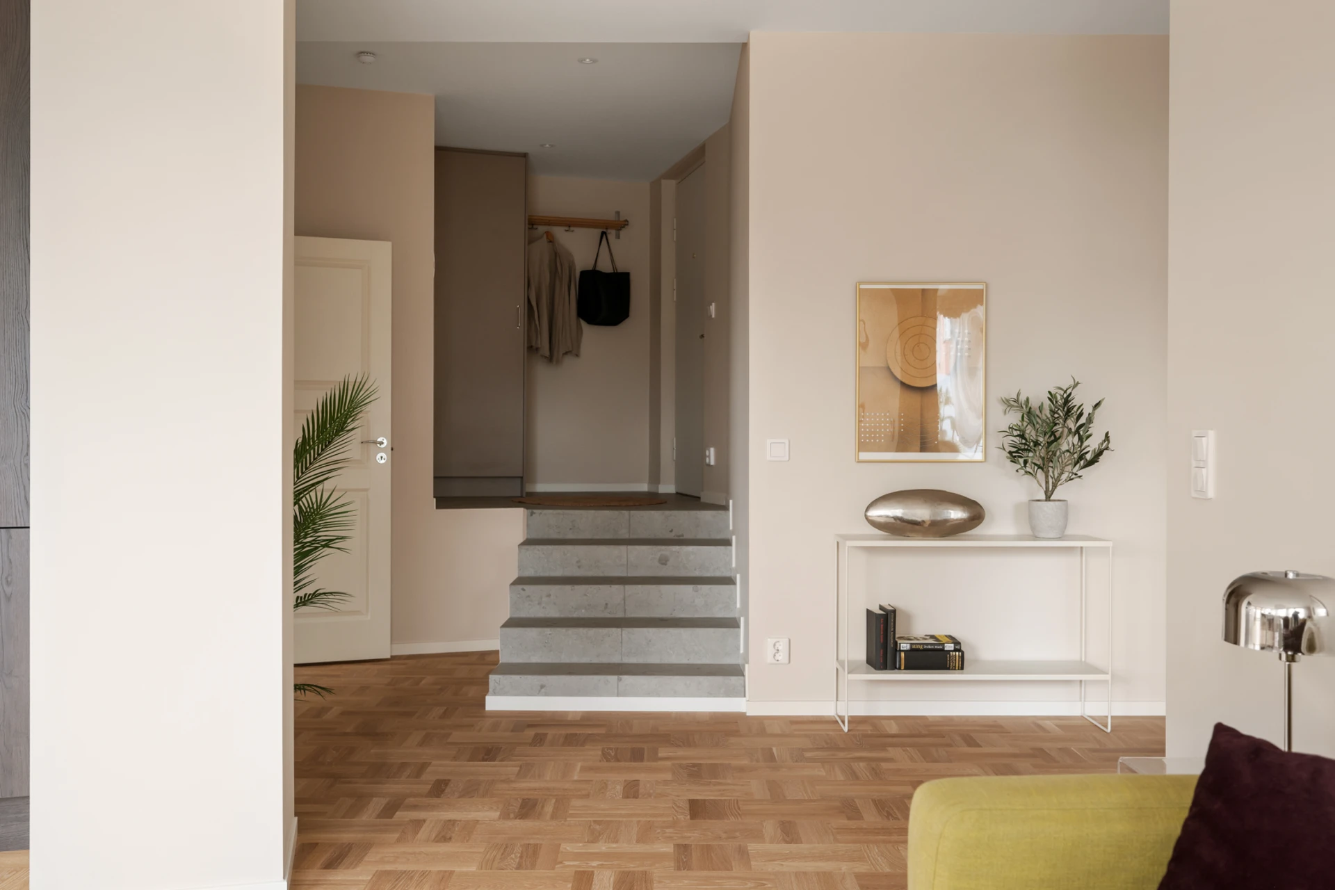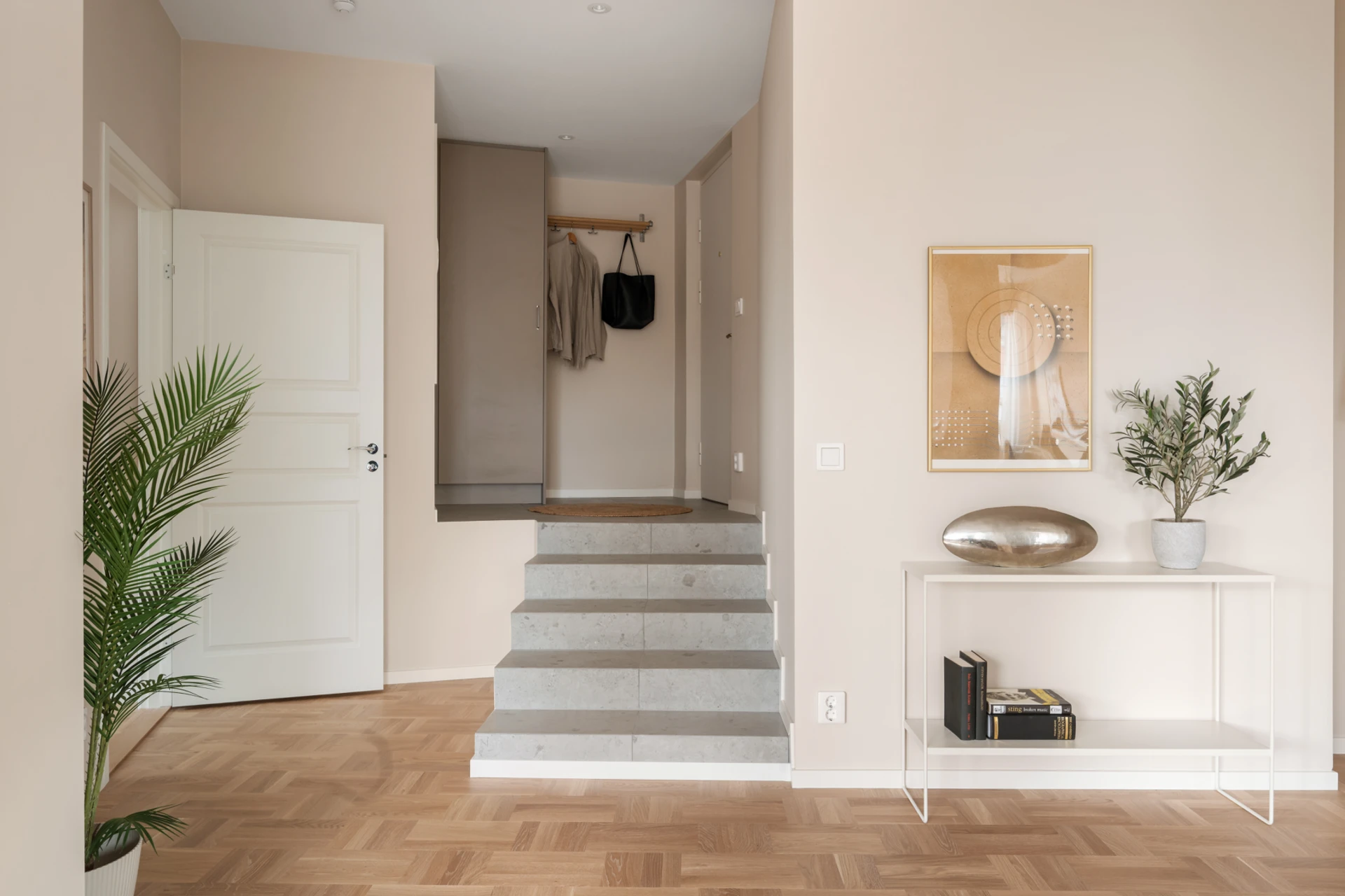 Entrén är välkomnande och praktisk med plats för ytterkläder och skor. De genomgående ljusa väggarna och det vackra parkettgolvet knyter ihop hela bostaden till en enhetlig och elegant helhet.