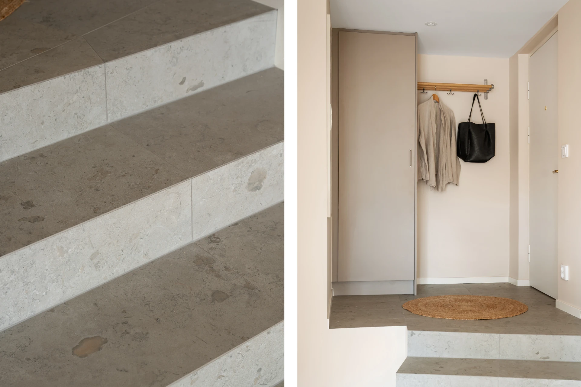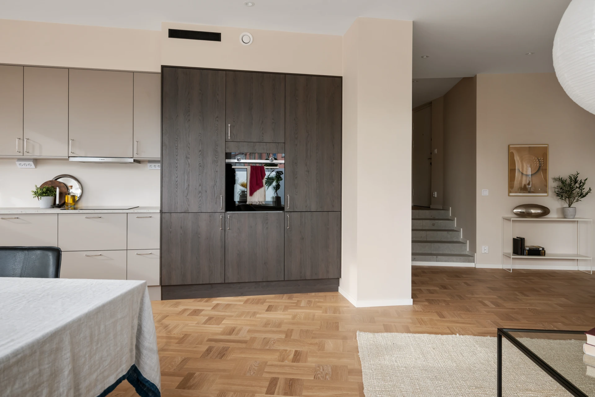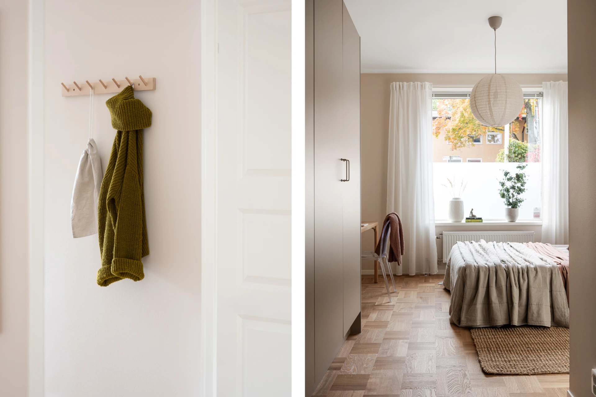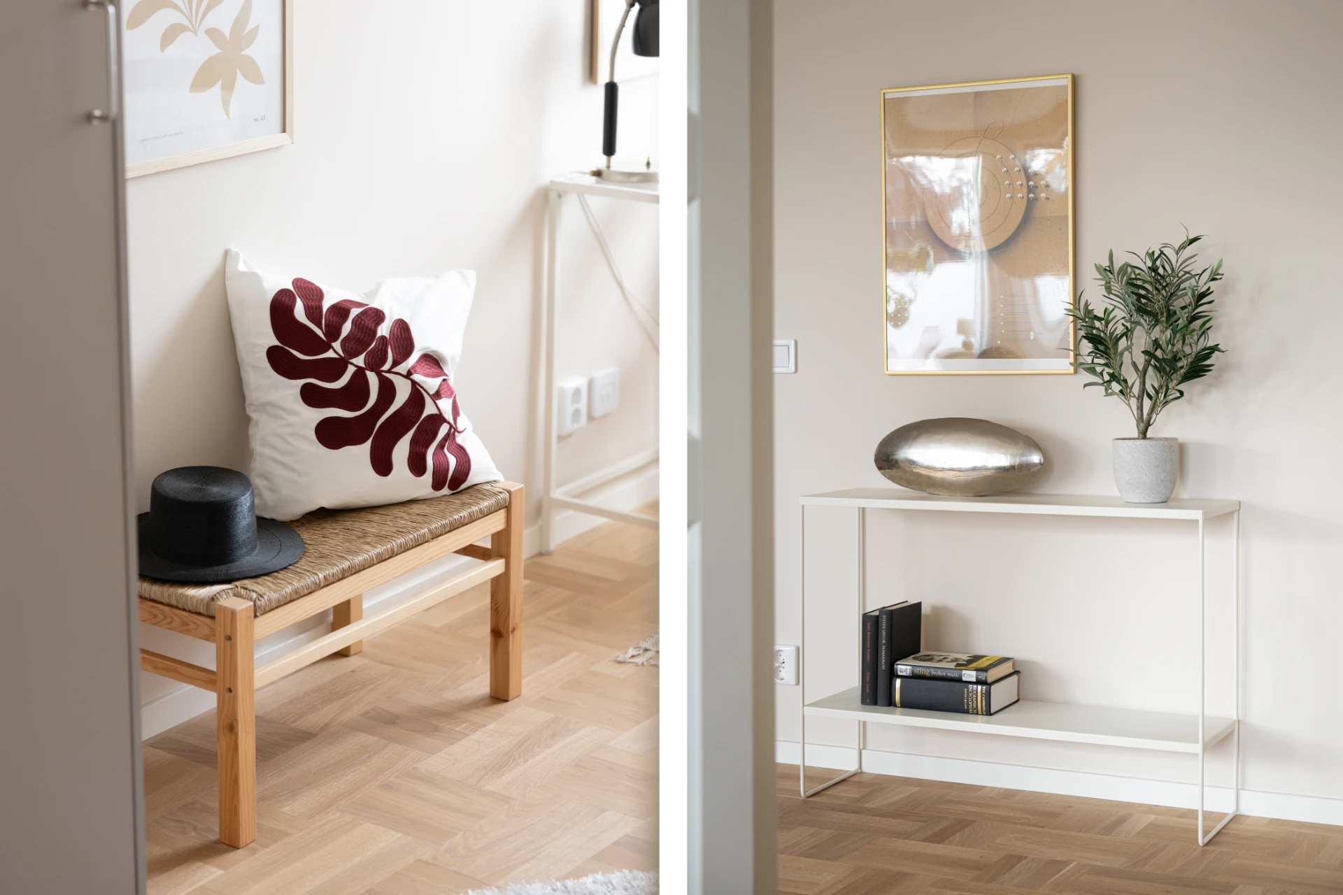 Entrén är välkomnande och praktisk med plats för ytterkläder och skor. De genomgående ljusa väggarna och det vackra parkettgolvet knyter ihop hela bostaden till en enhetlig och elegant helhet.