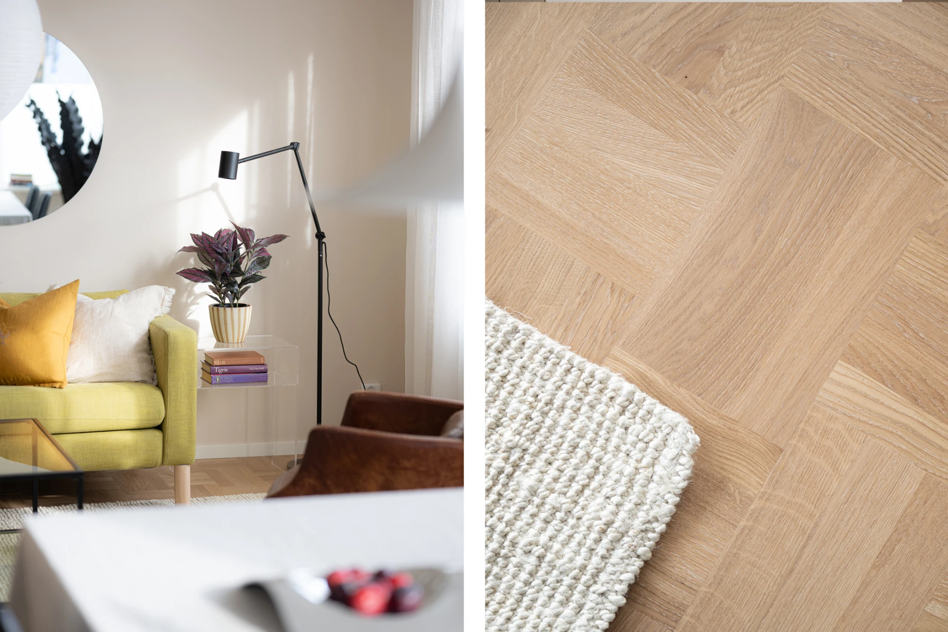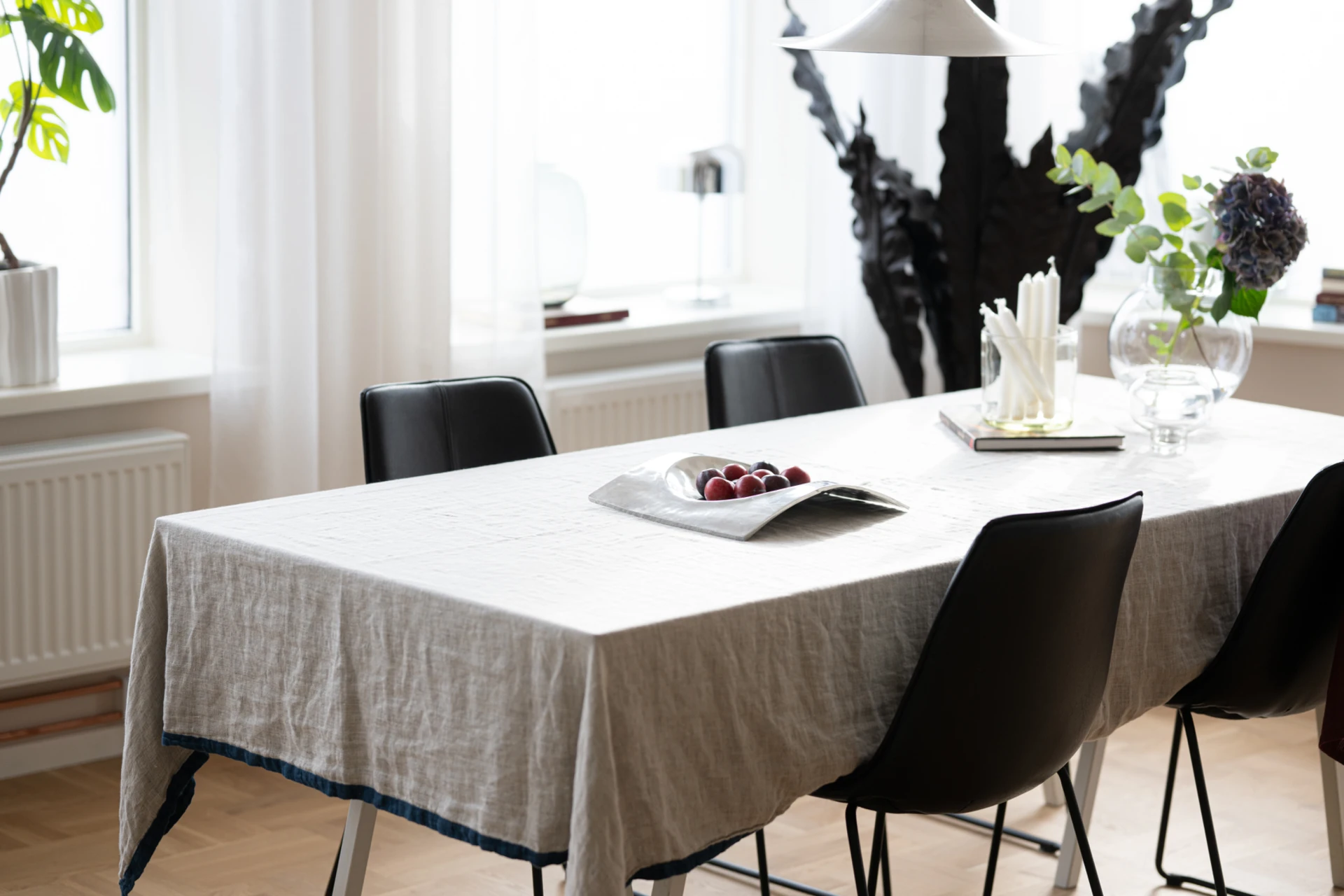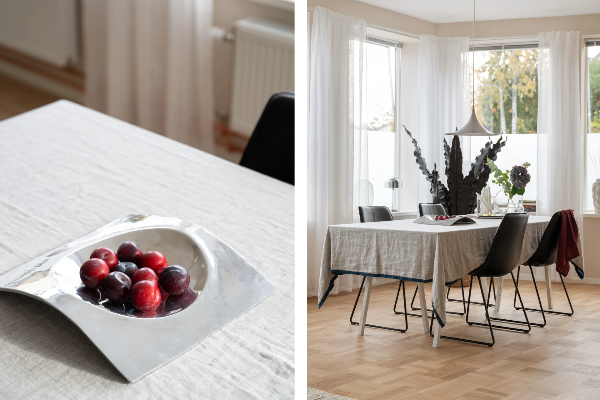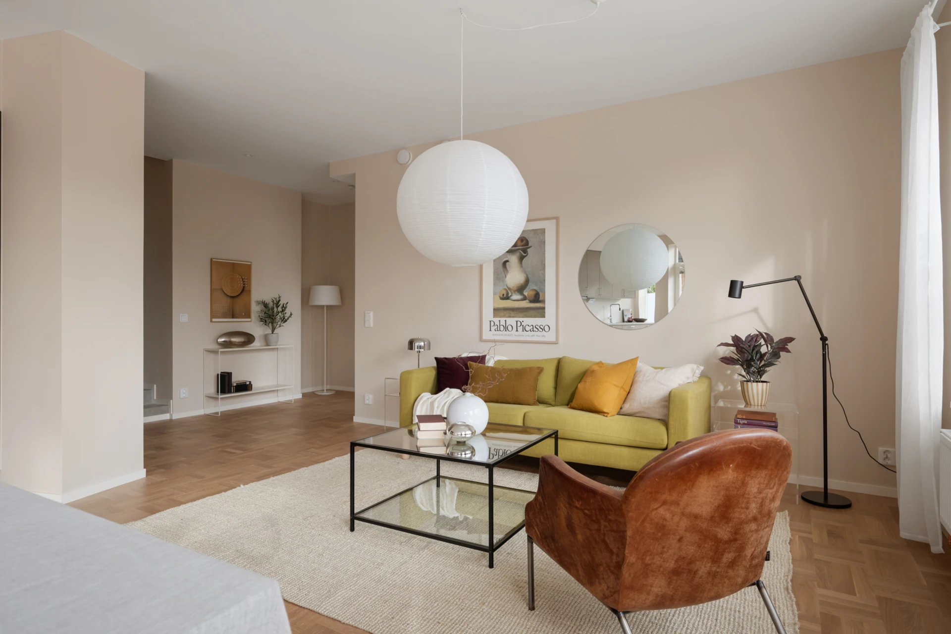 Entrén är välkomnande och praktisk med plats för ytterkläder och skor. De genomgående ljusa väggarna och det vackra parkettgolvet knyter ihop hela bostaden till en enhetlig och elegant helhet.