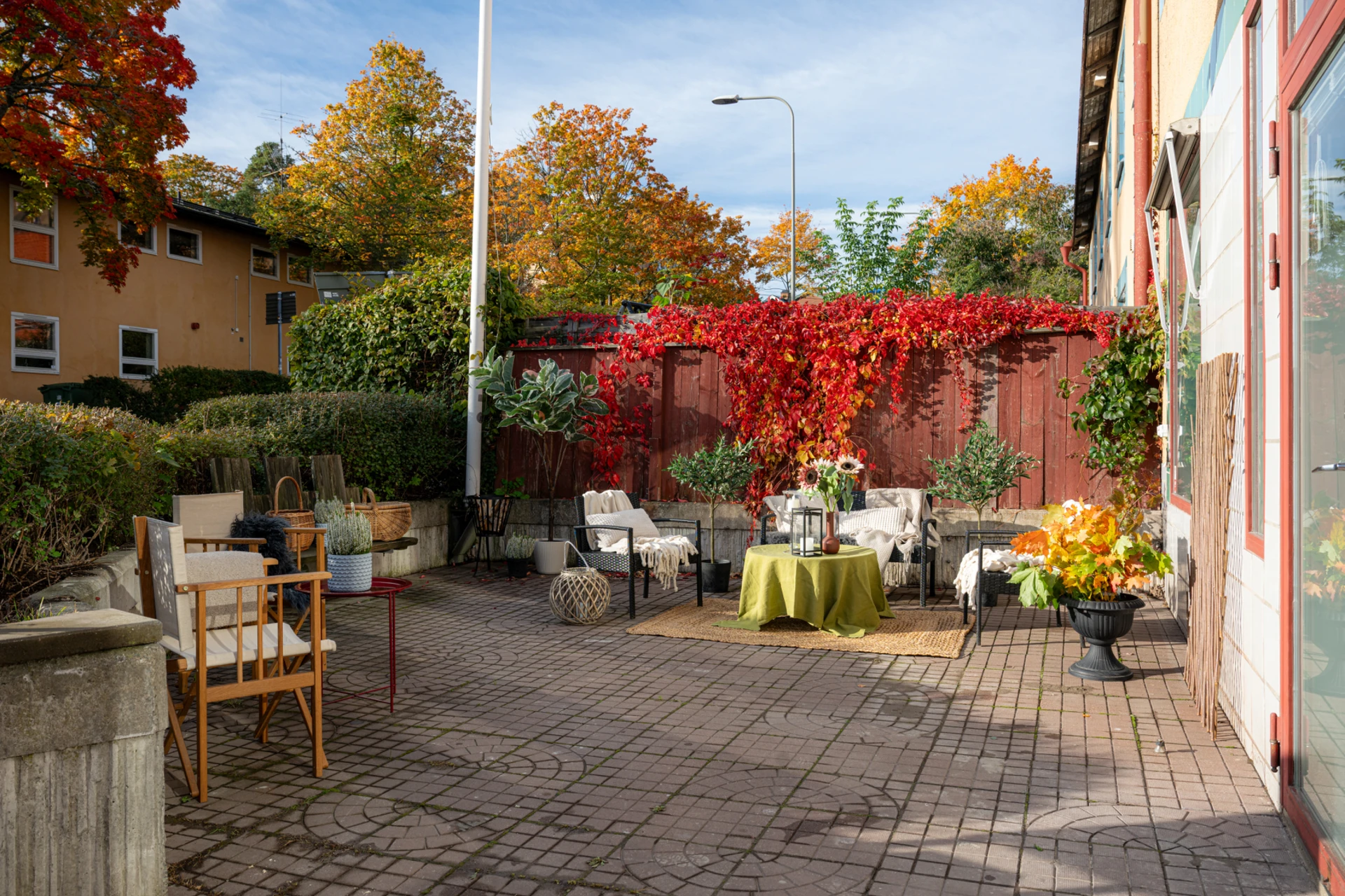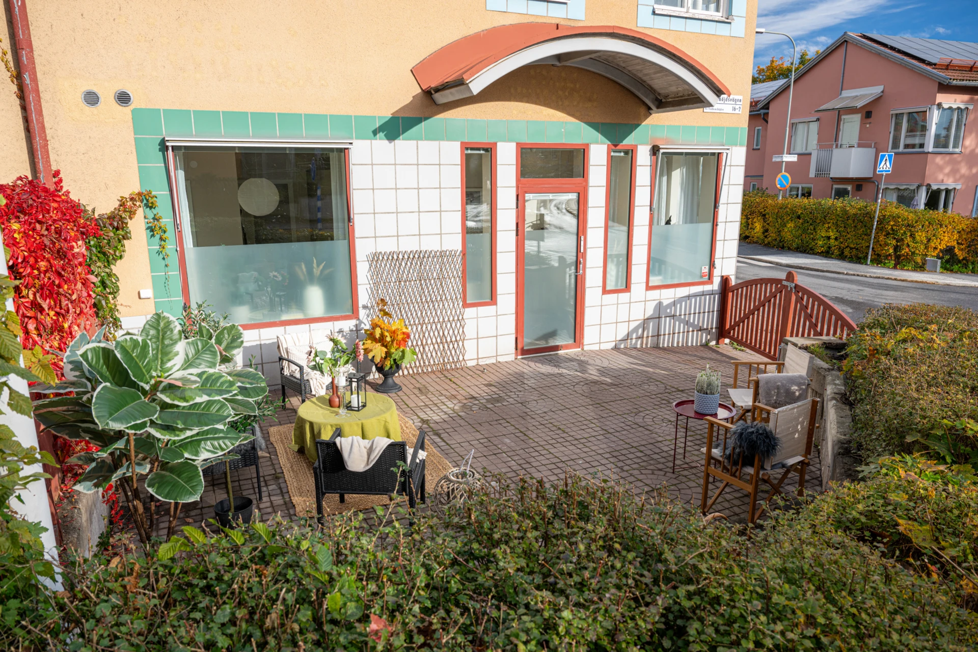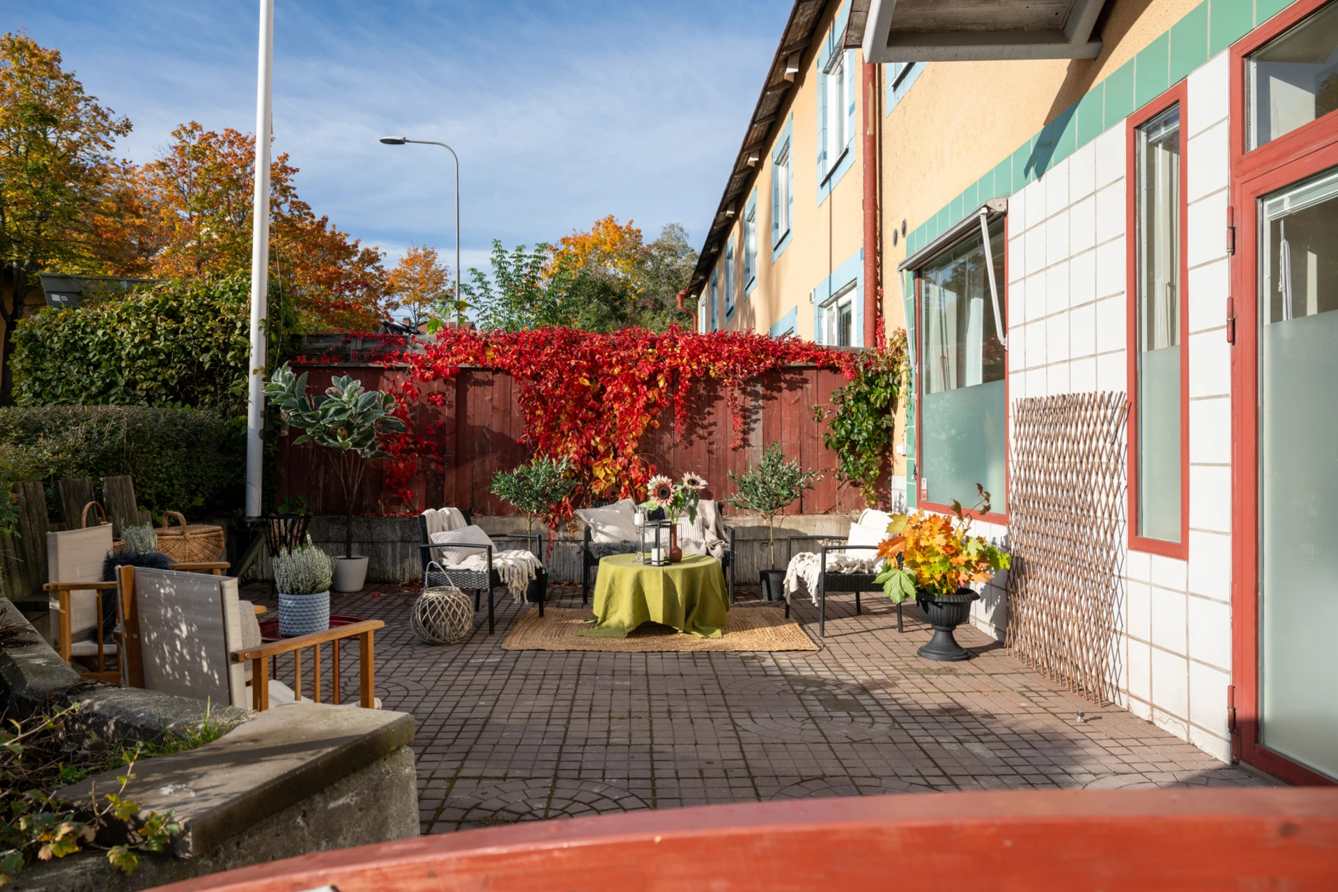 Från vardagsrummet når du den generösa uteplatsen som ramas in av grönska och färgsprakande växter. Här finns gott om plats för loungemöbler, grill och middagsbord, en idealisk oas för sommarens alla tillfällen.
