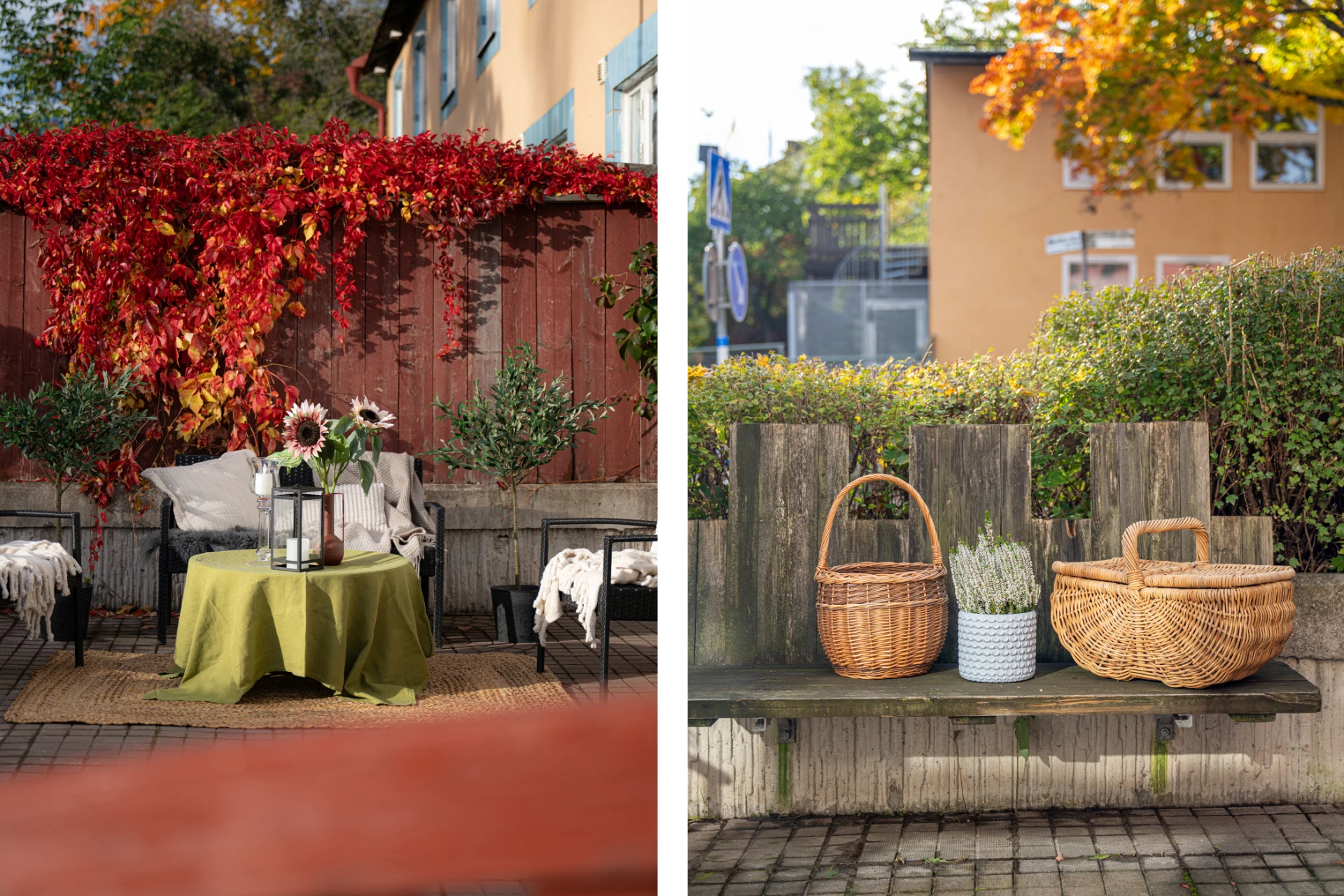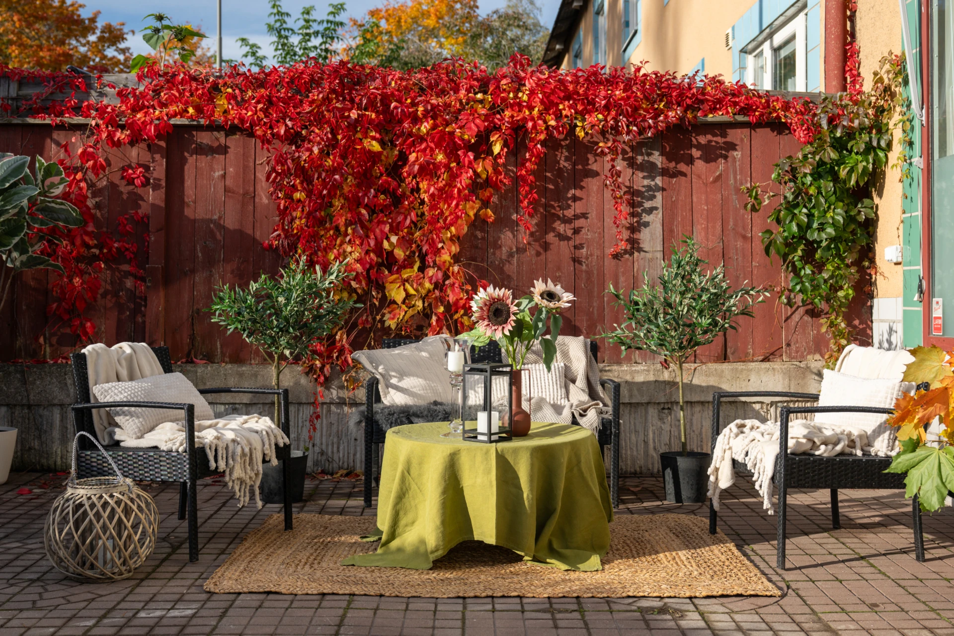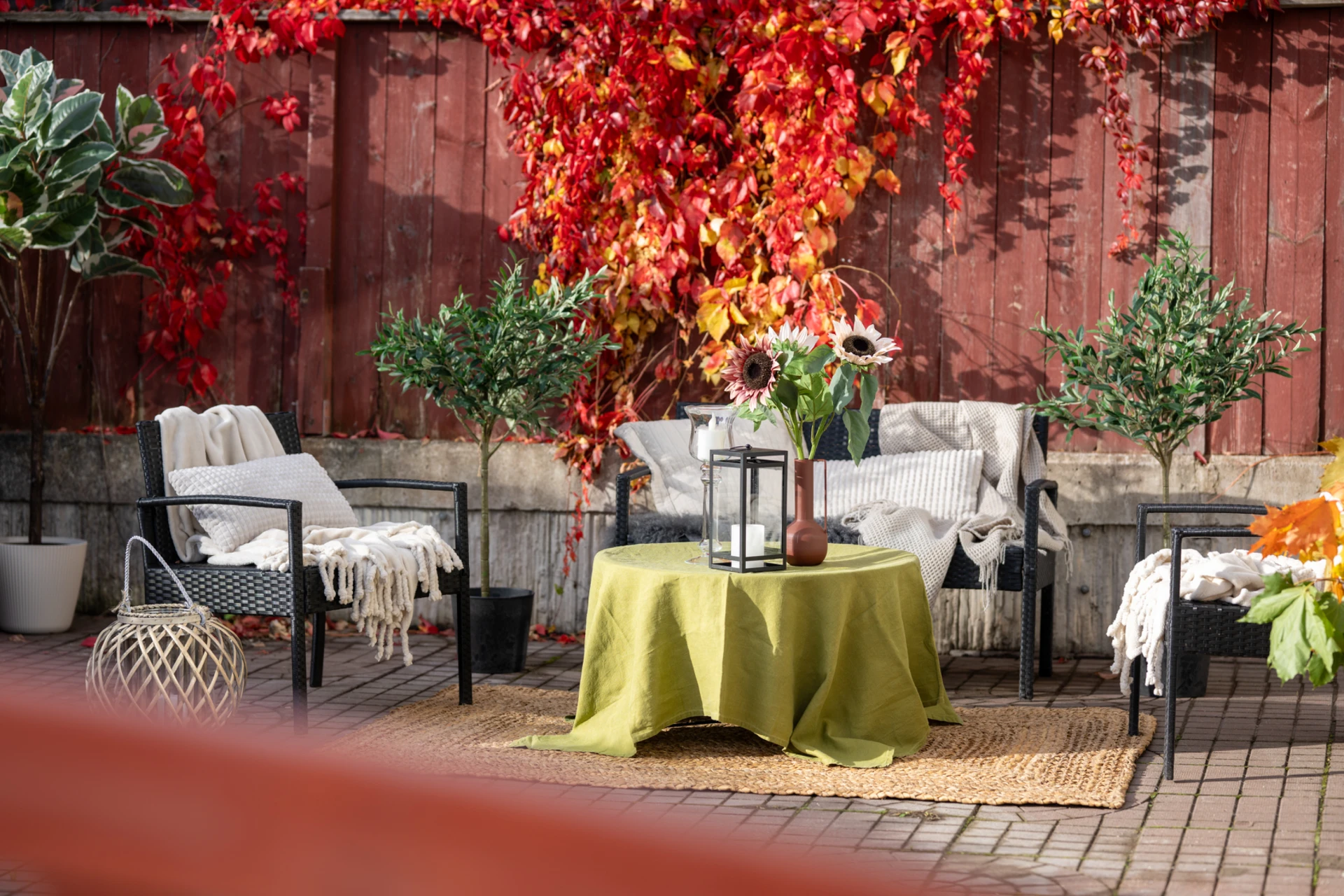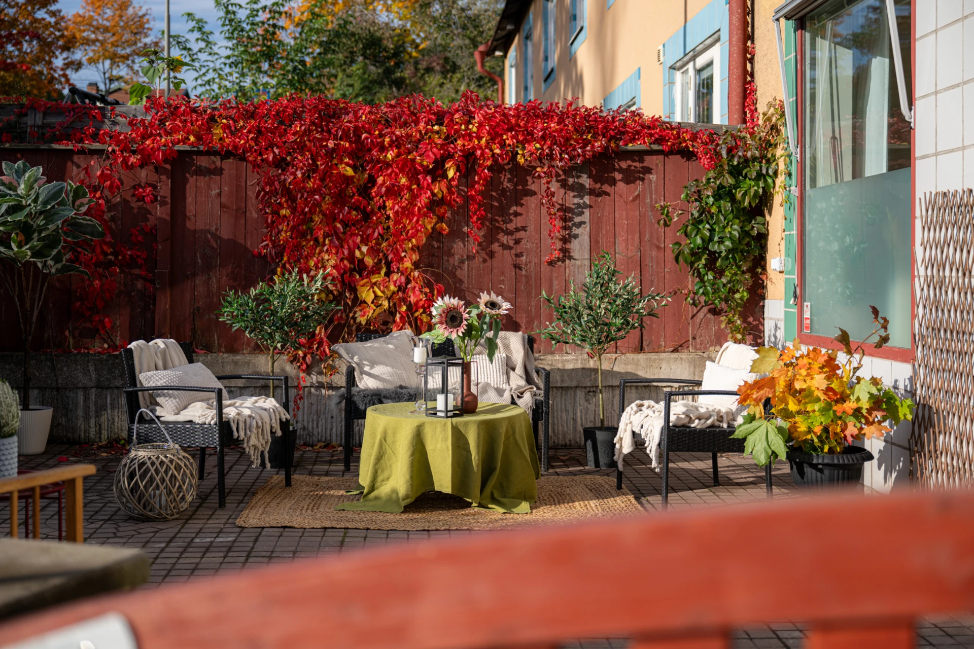 Från vardagsrummet når du den generösa uteplatsen som ramas in av grönska och färgsprakande växter. Här finns gott om plats för loungemöbler, grill och middagsbord, en idealisk oas för sommarens alla tillfällen.