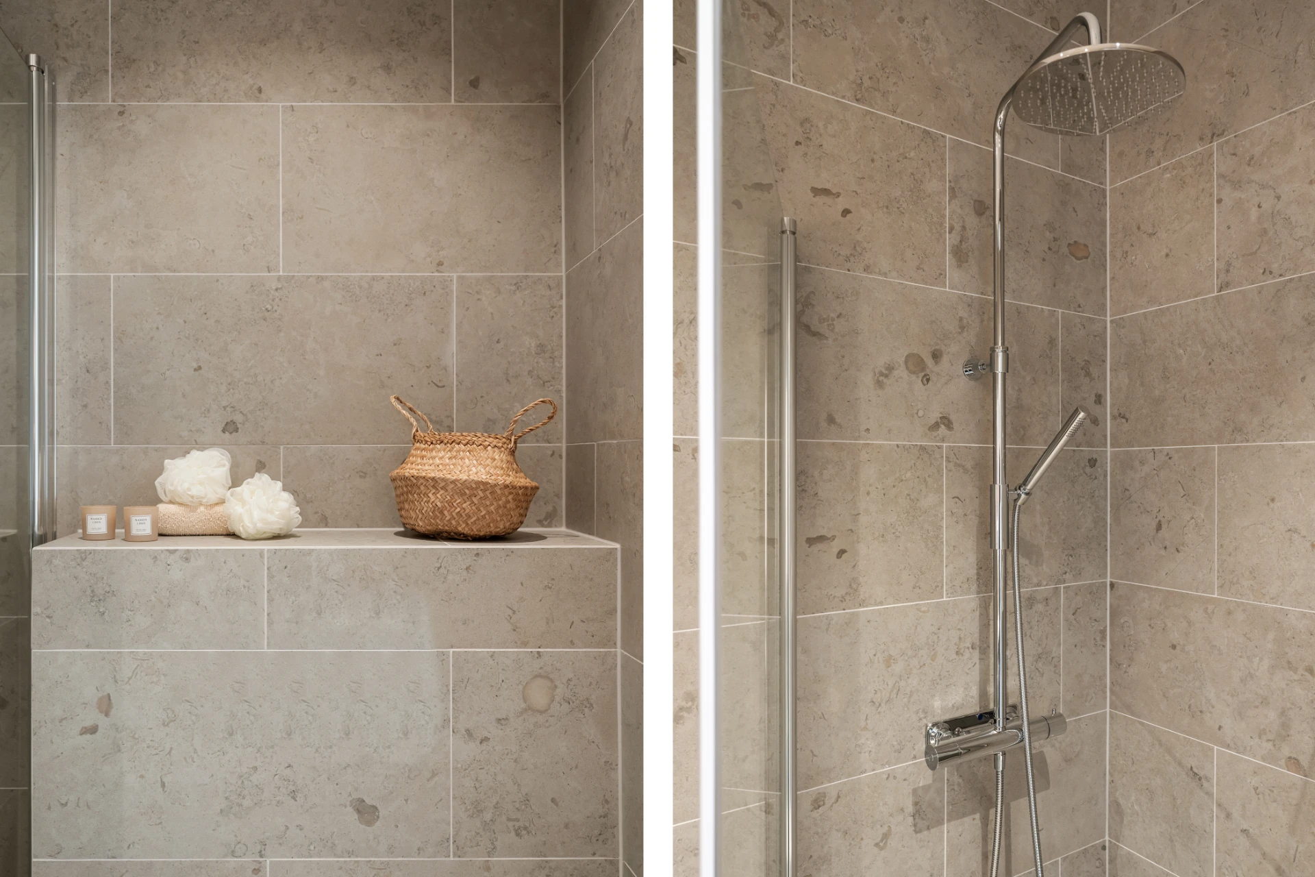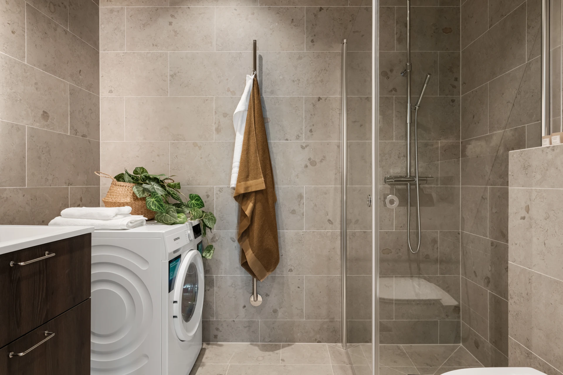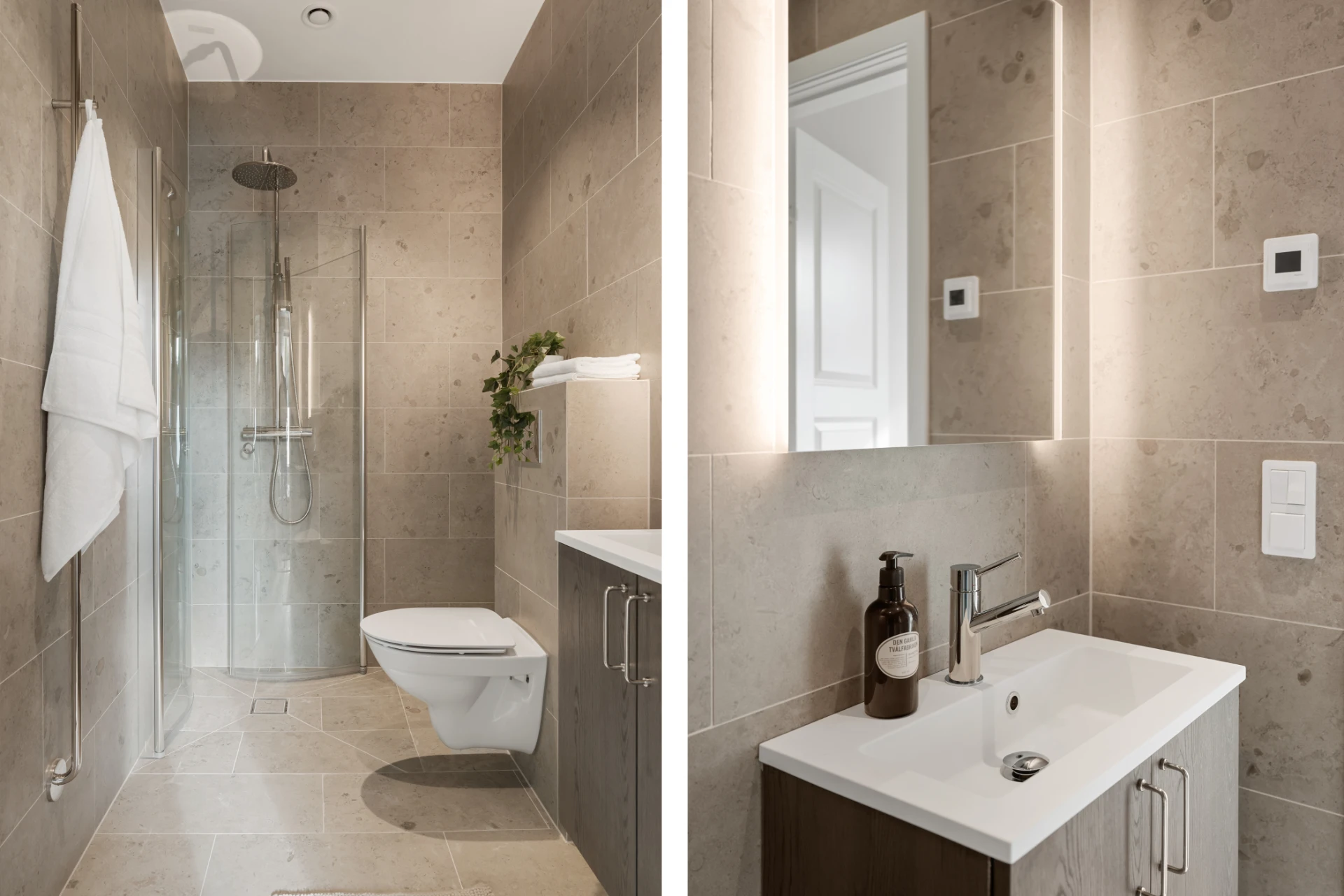 Stilrent badrum med helkaklade väggar och klinkergolv i naturnära ton. Här finns dusch med glasväggar, vägghängd WC, spegel med inbyggd belysning, samt tvättmaskin och kommod med förvaring.