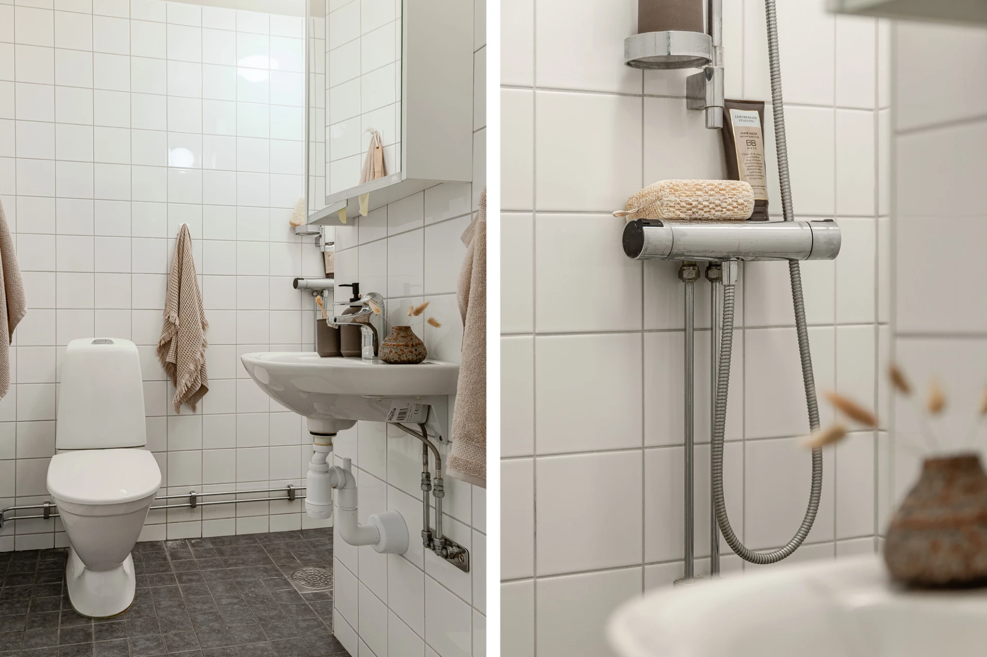 Helkaklat badrum utrustat med dusch, wc, handfat och spegelskåp med förvaring.