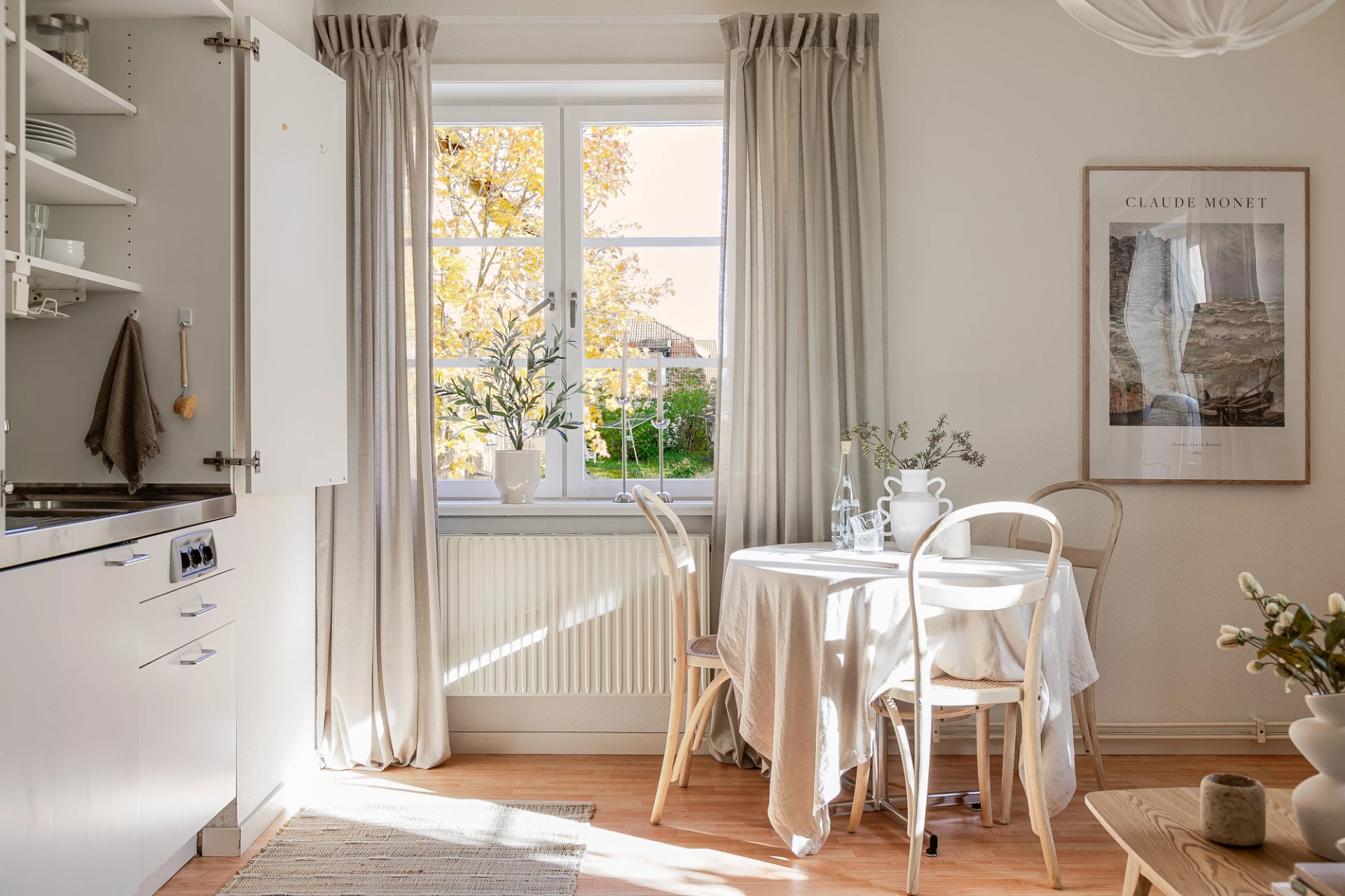 Välplanerat och socialt vardagsrum med vackert grönskande samt lugnt läge utanför. Fantastiskt ljusinsläpp från fönsterpartier i två väderstreck. Här ryms plats för soffgrupp, köksbord och ytterligare möblemang om så önskas.