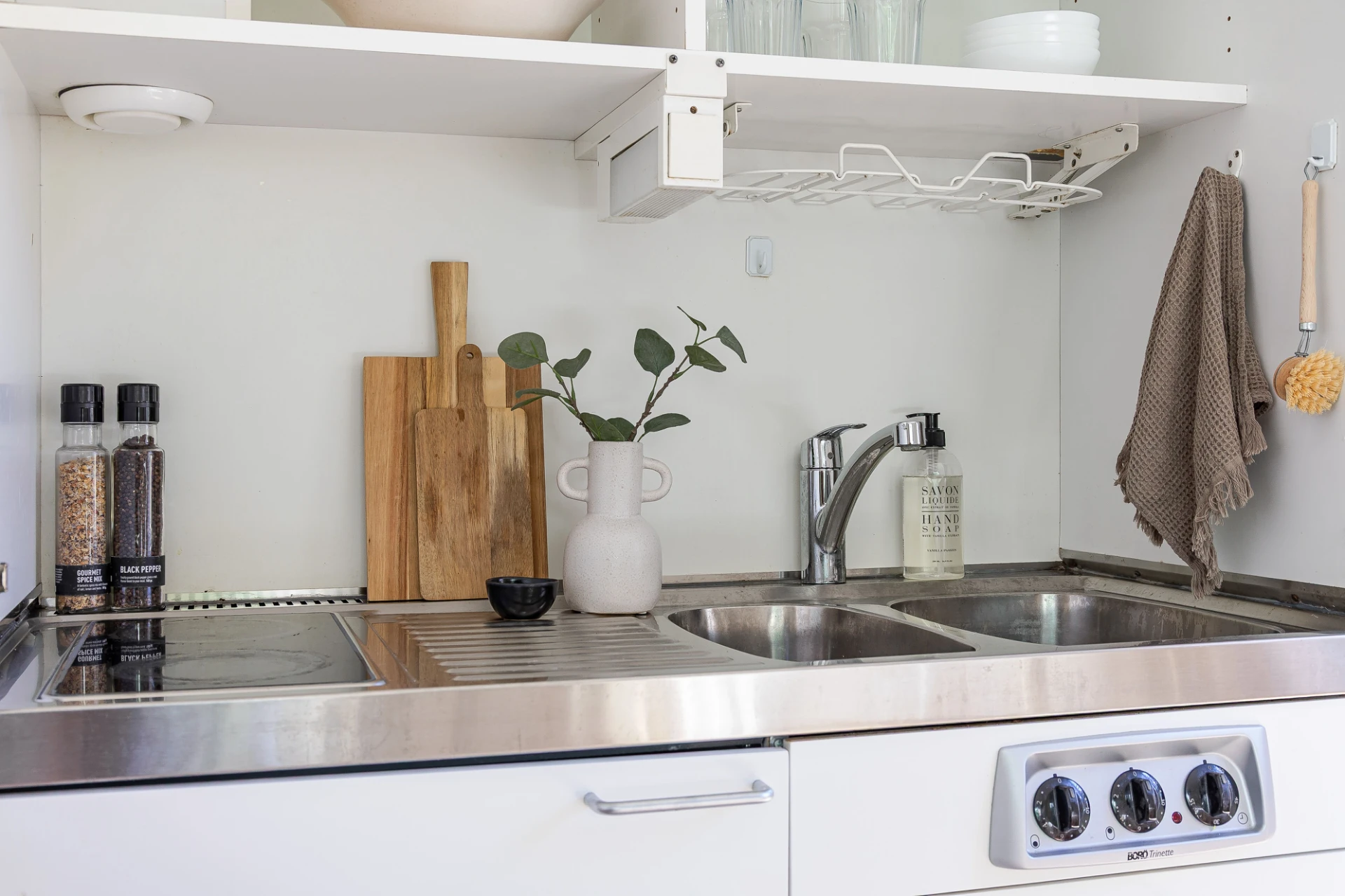 Kokvrå med social lösning tillsammans med vardagsrummet. Kokvrån är trustad med två spisplattor och kyl med frysfack. Köket går att göra om till ett riktigt kök om önskas.
