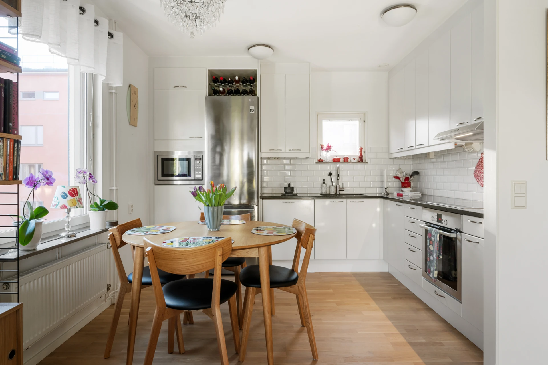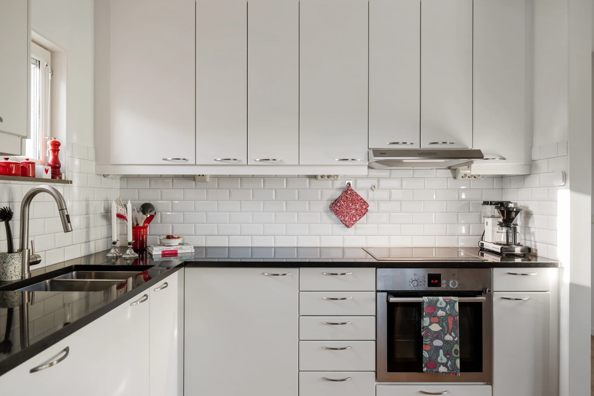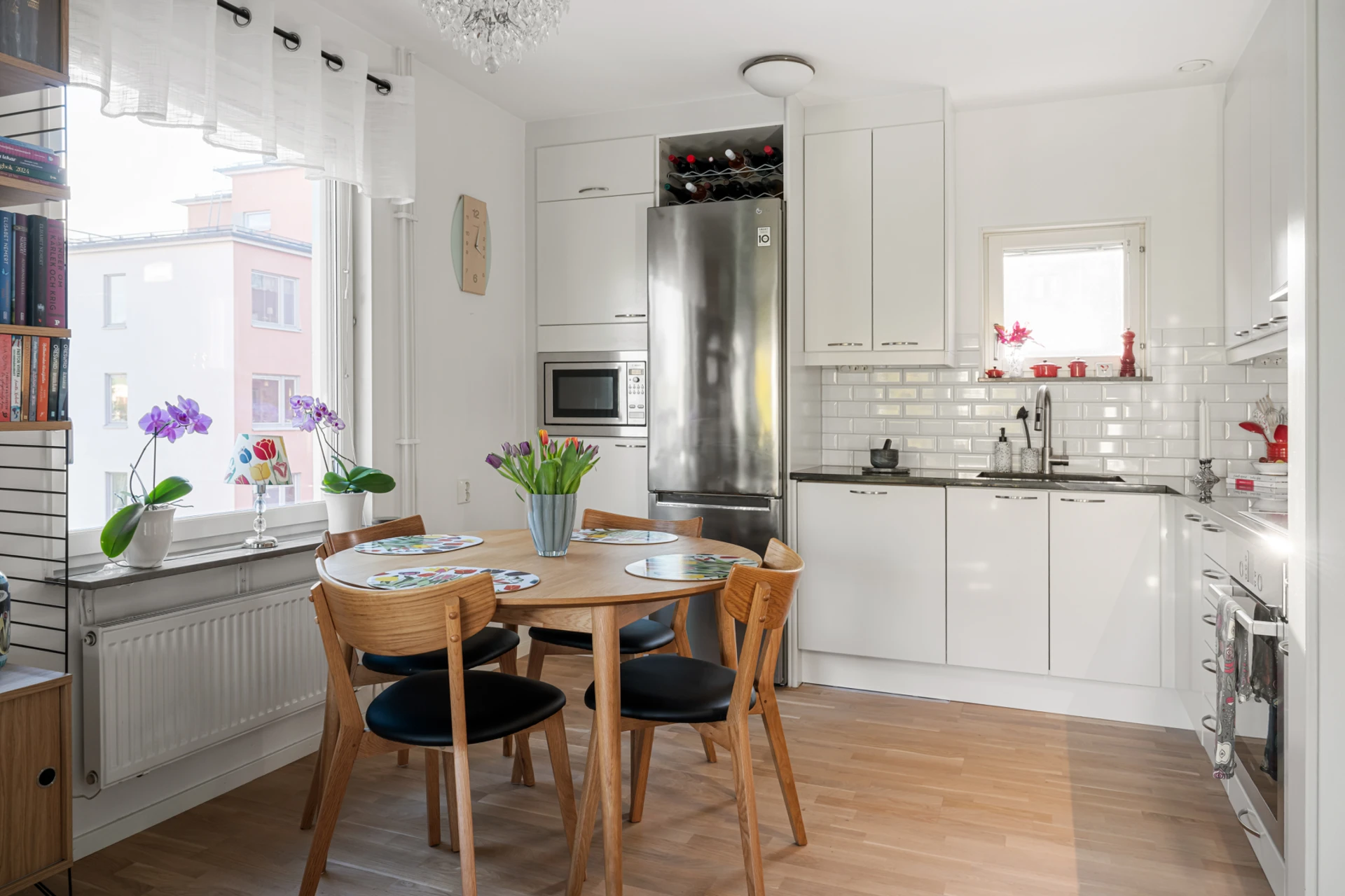 2025: Ny bänkskiva i svart granit, ny glashällspis, ny köksbänkbelysning, golvslipning och ytbehandling i hela lägenheten.