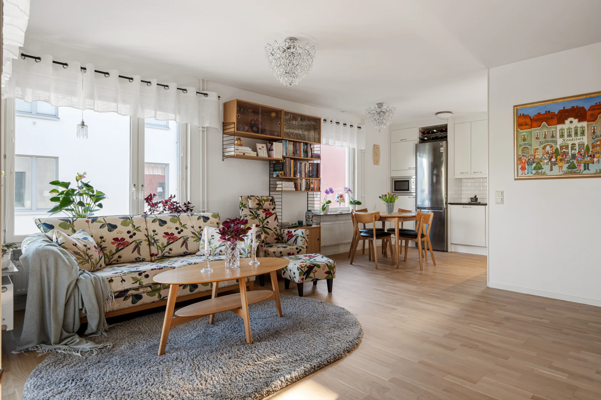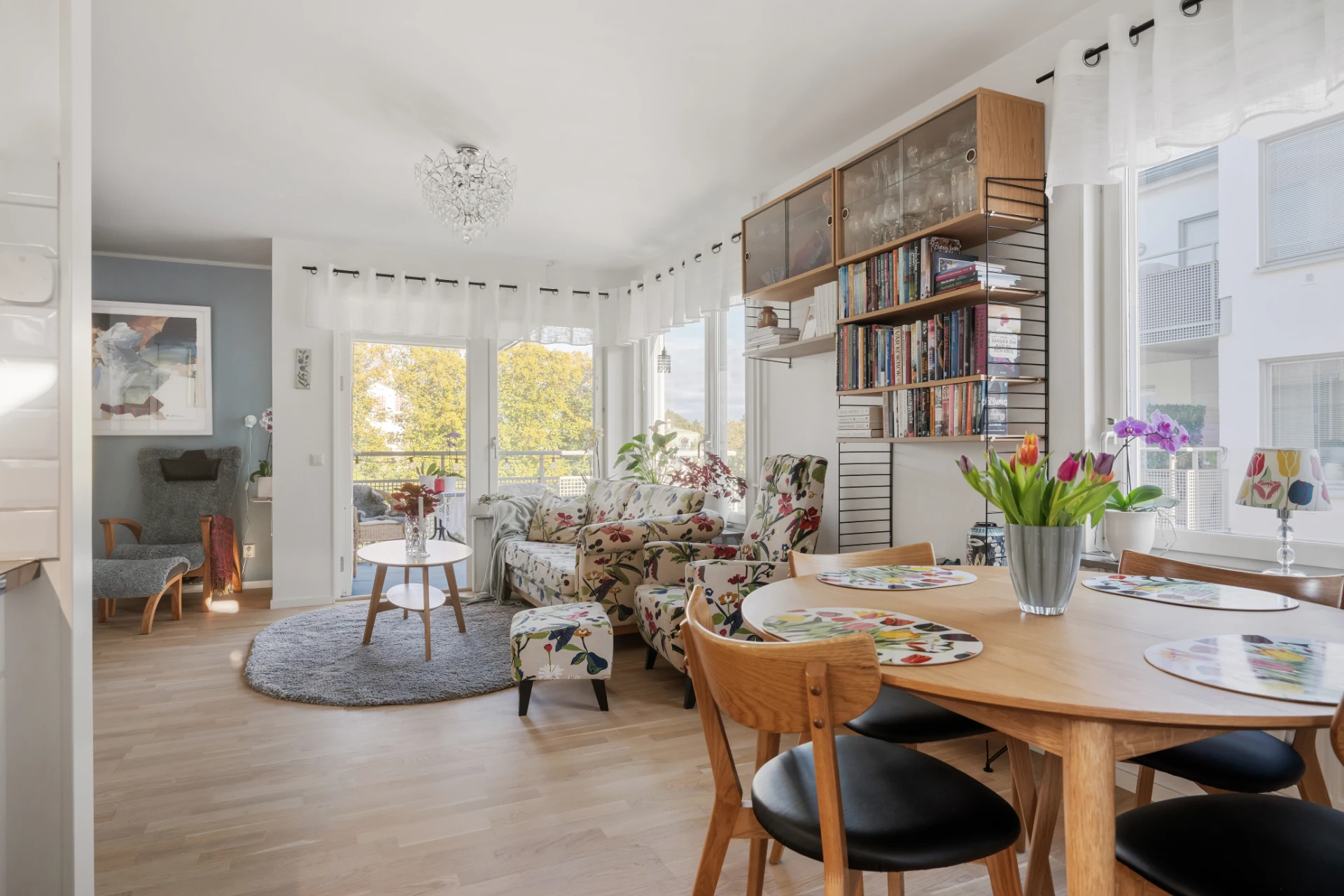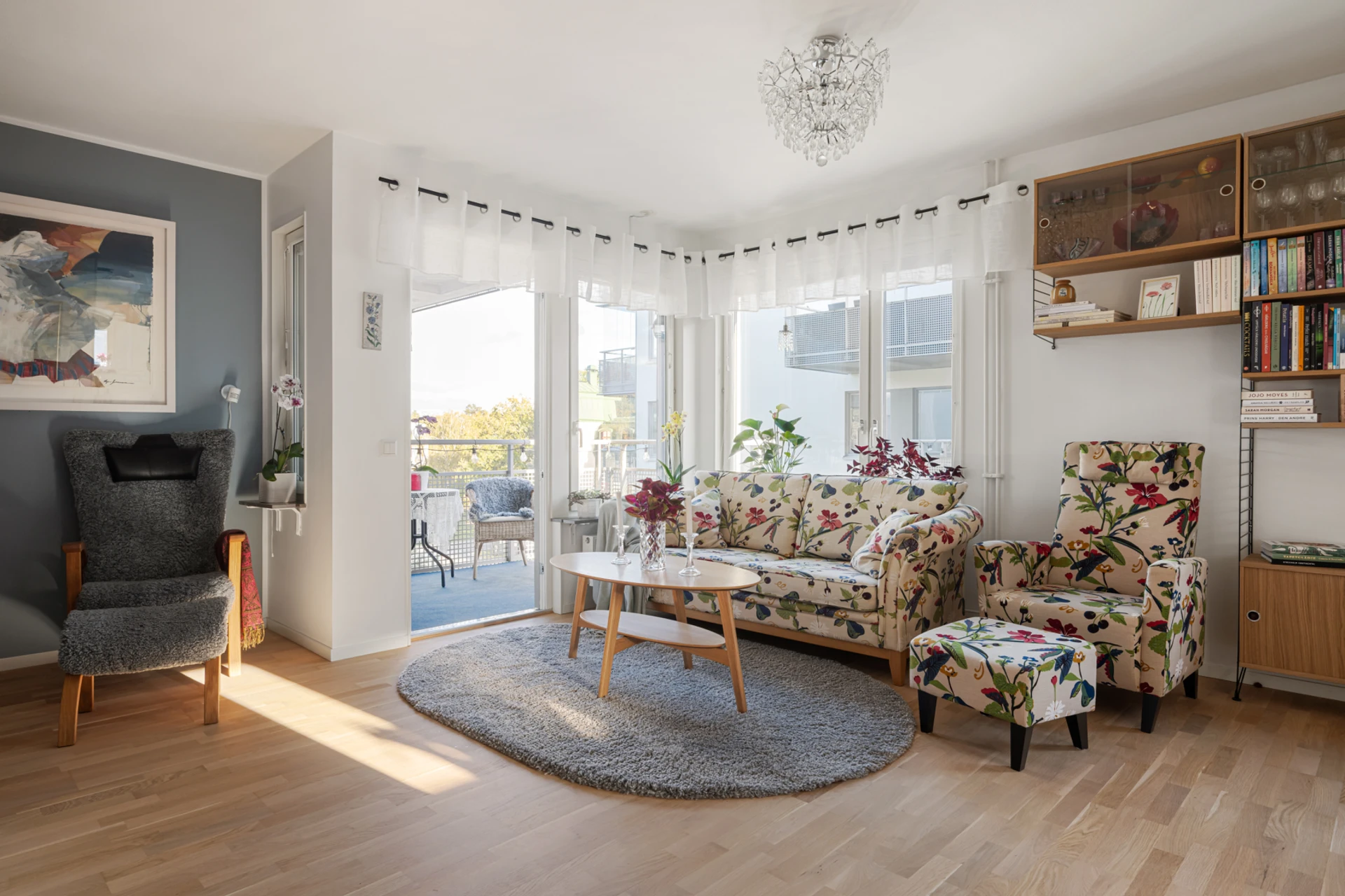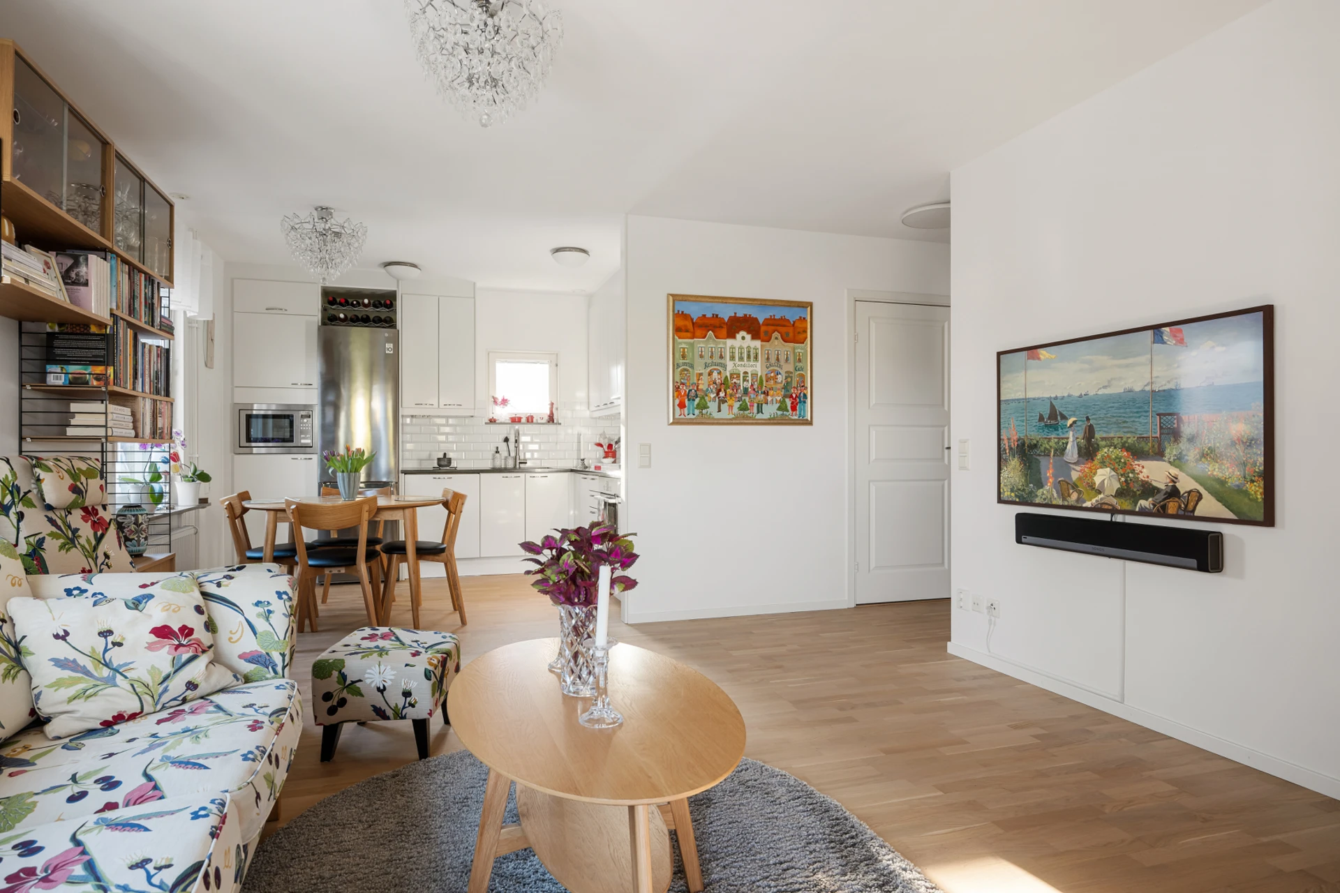 Bostadens vardagsrum är i tilltagen storlek och upplevs mycket ljust med stora fönsterpartier i två väderstreck. Här ges med god rymd att möblera med klassiska vardagsrumsmöbler som soffa, bord och tv-möbel. Mellan hall och vardagsrum finns en del som lämpar sig perfekt som exempelvis hemmakontor. Här har även andra boenden delat av rummet genom att