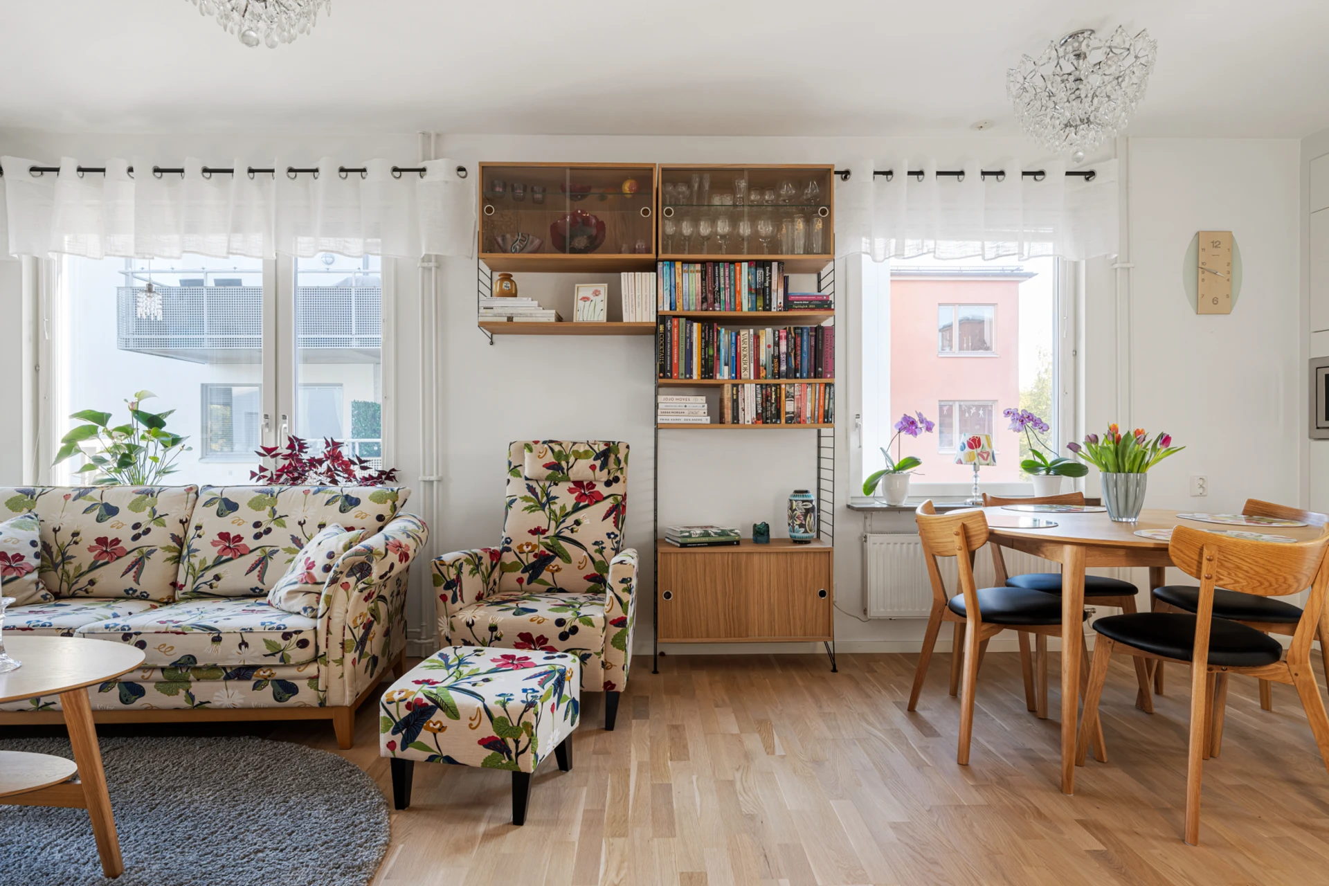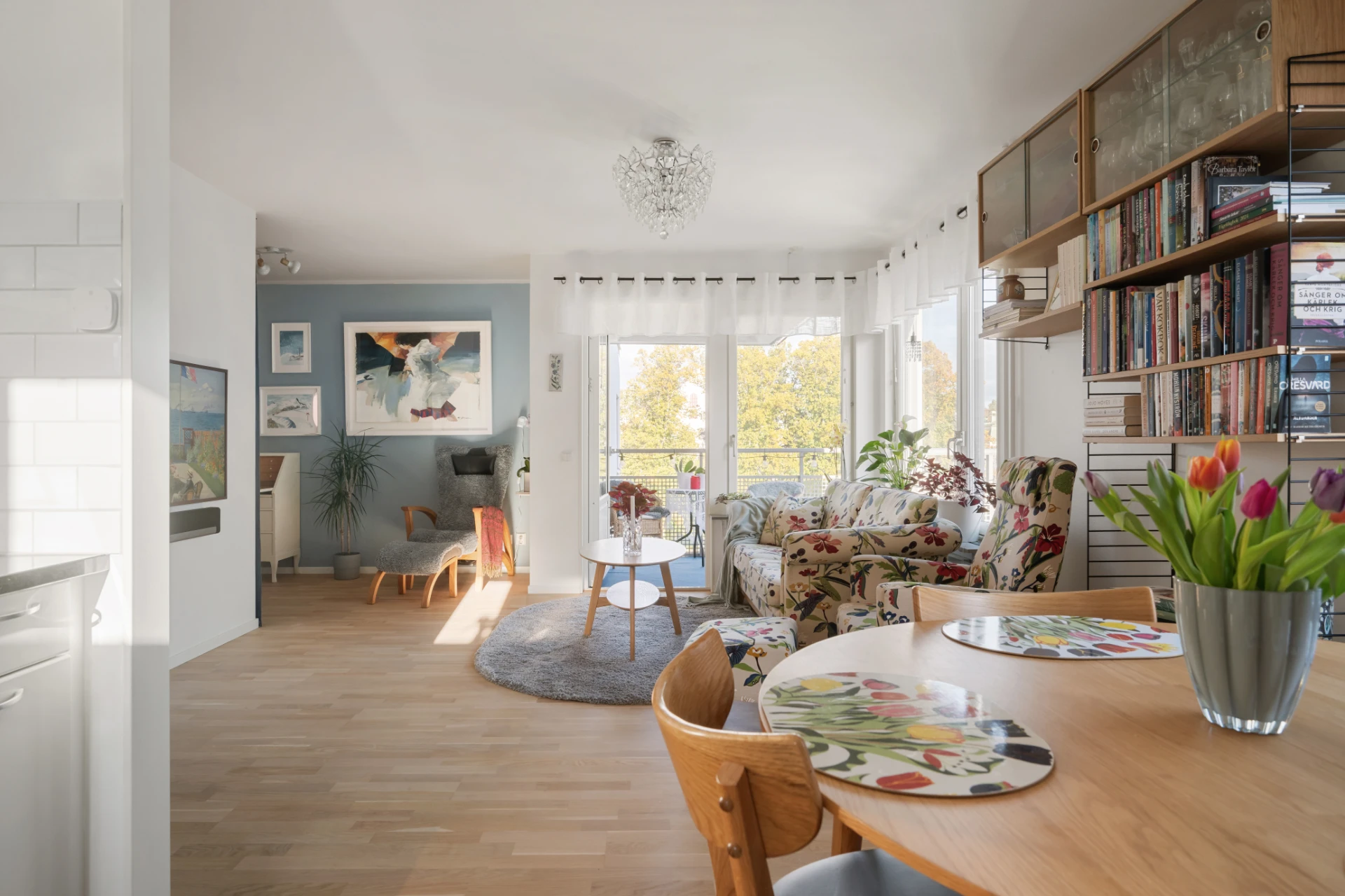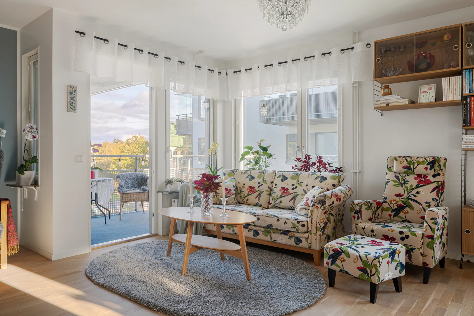 Bostadens vardagsrum är i tilltagen storlek och upplevs mycket ljust med stora fönsterpartier i två väderstreck. Här ges med god rymd att möblera med klassiska vardagsrumsmöbler som soffa, bord och tv-möbel. Mellan hall och vardagsrum finns en del som lämpar sig perfekt som exempelvis hemmakontor. Här har även andra boenden delat av rummet genom att