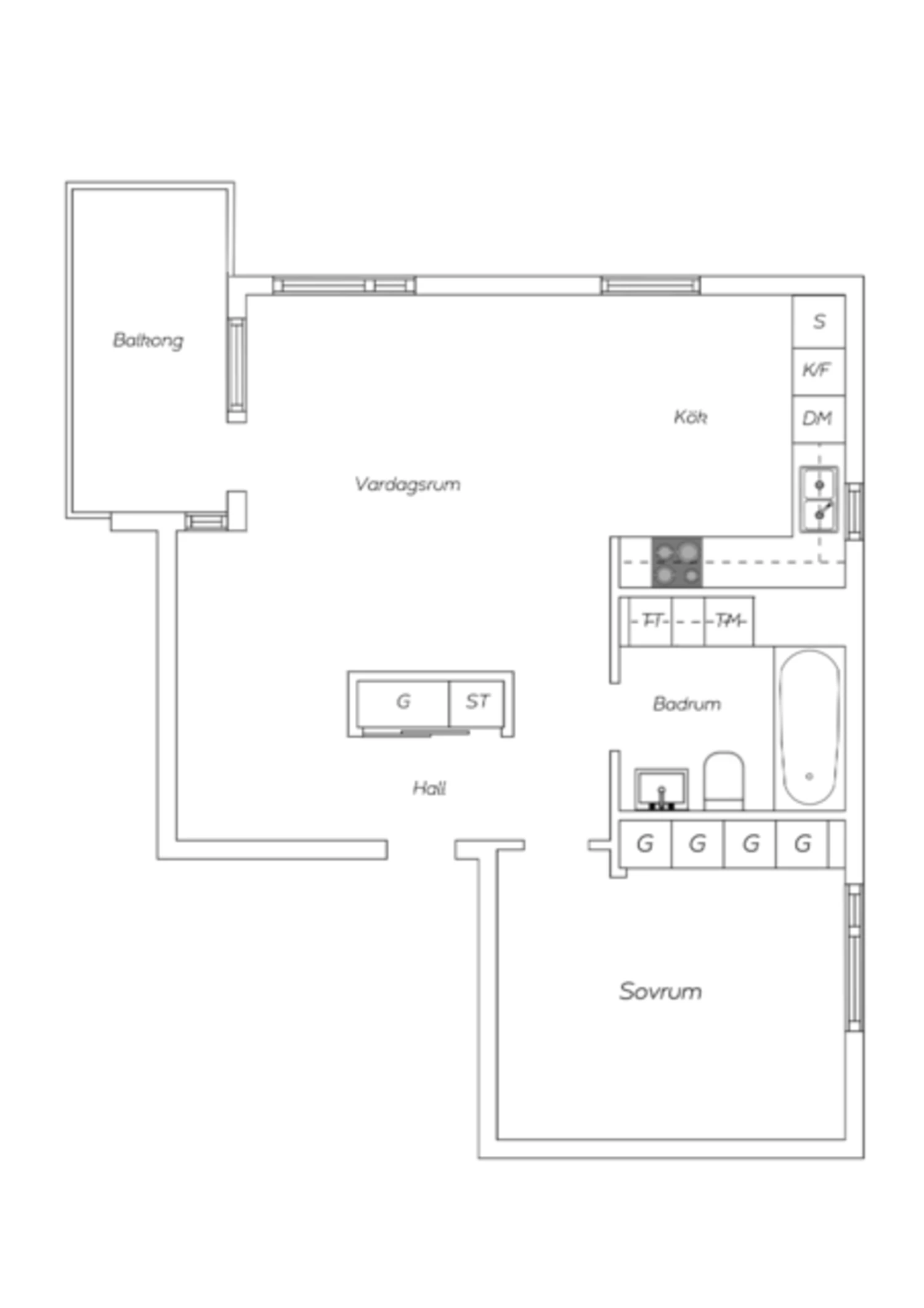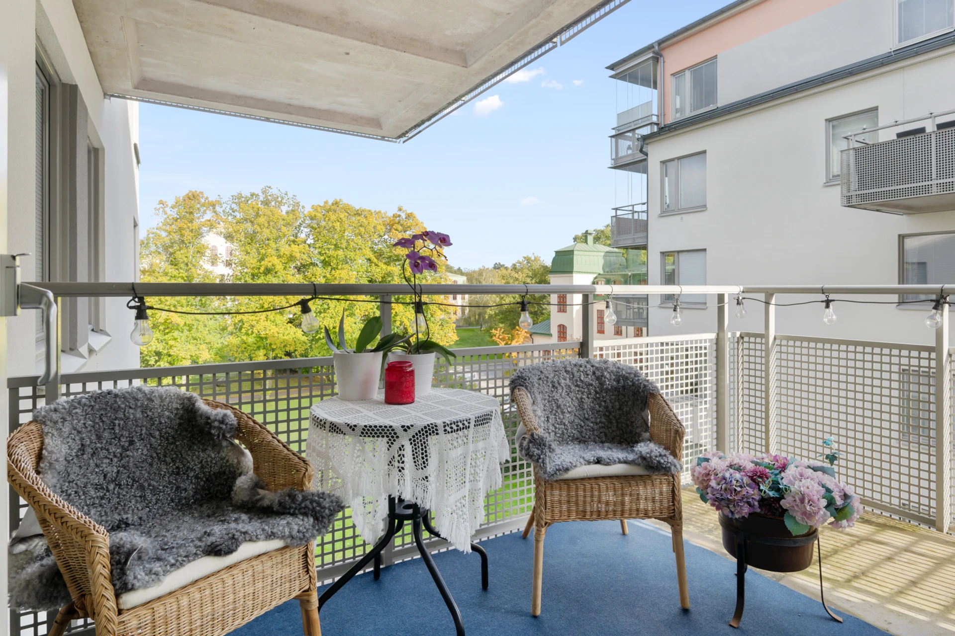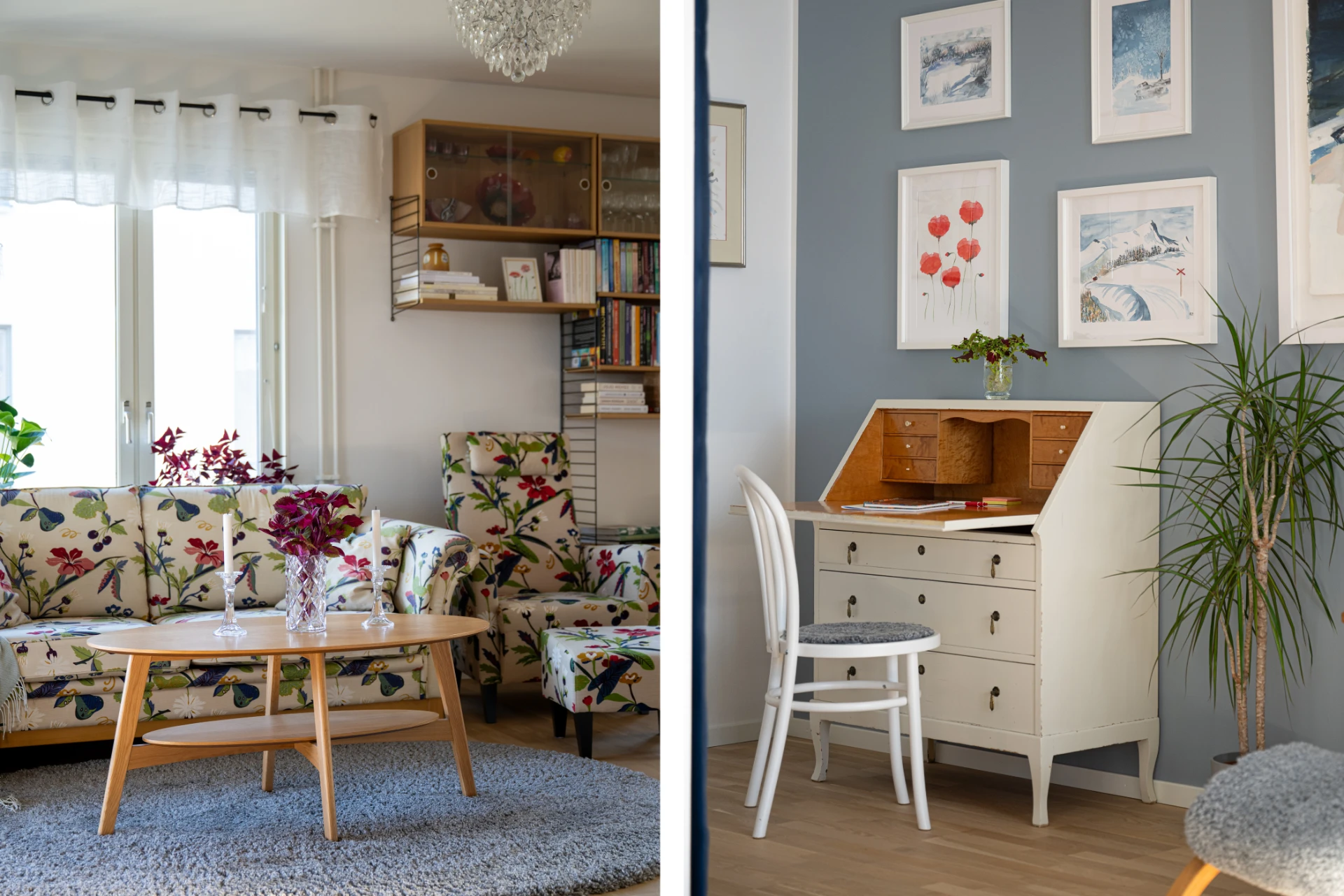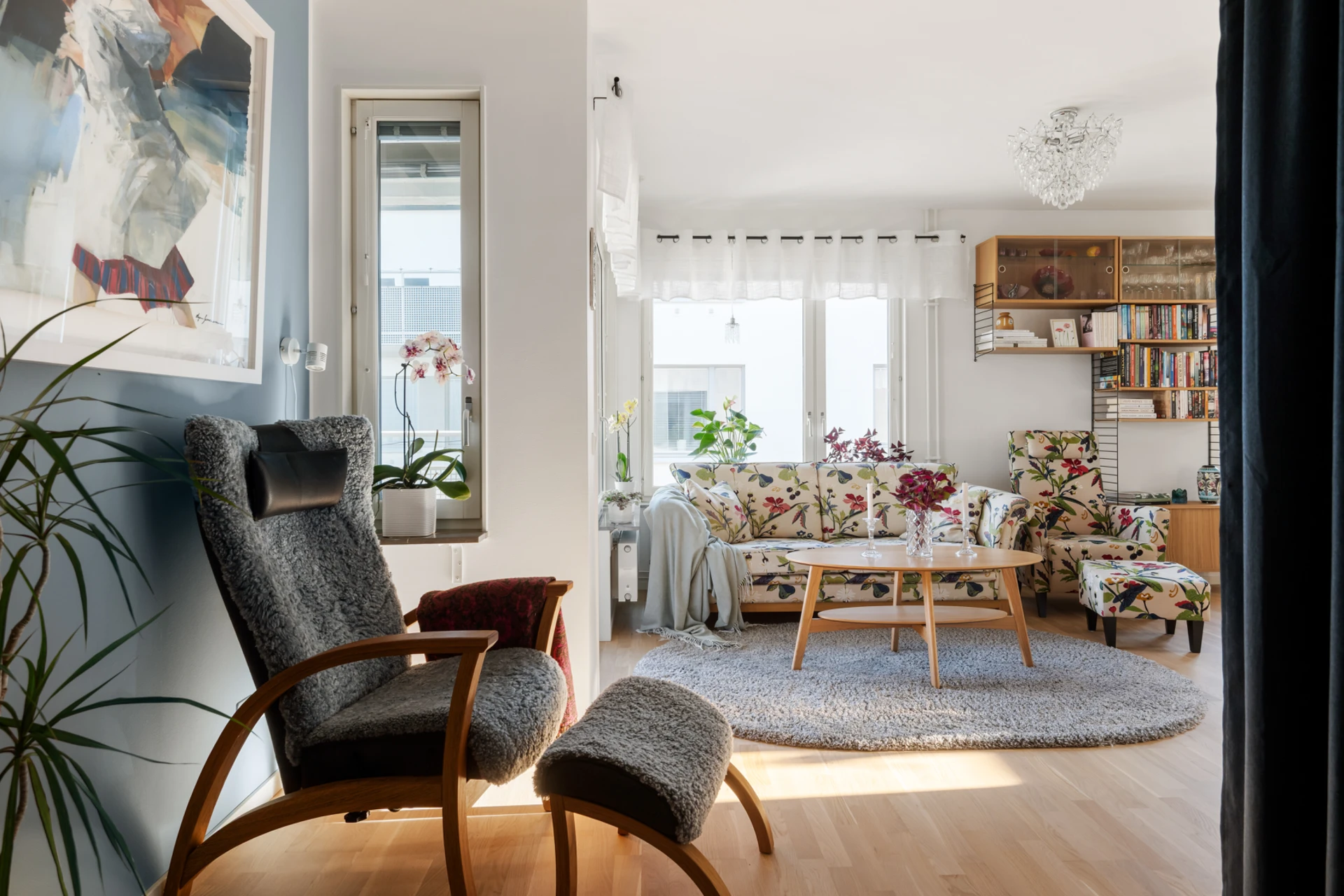 Bostadens vardagsrum är i tilltagen storlek och upplevs mycket ljust med stora fönsterpartier i två väderstreck. Här ges med god rymd att möblera med klassiska vardagsrumsmöbler som soffa, bord och tv-möbel. Mellan hall och vardagsrum finns en del som lämpar sig perfekt som exempelvis hemmakontor. Här har även andra boenden delat av rummet genom att