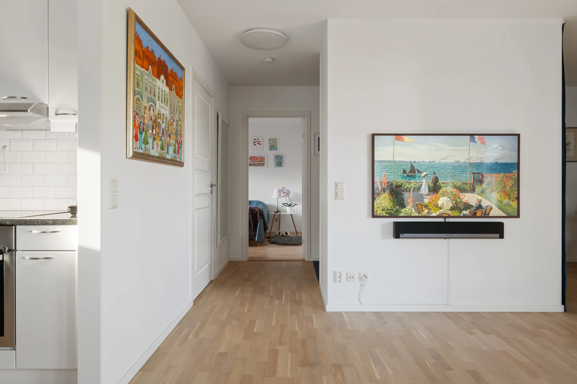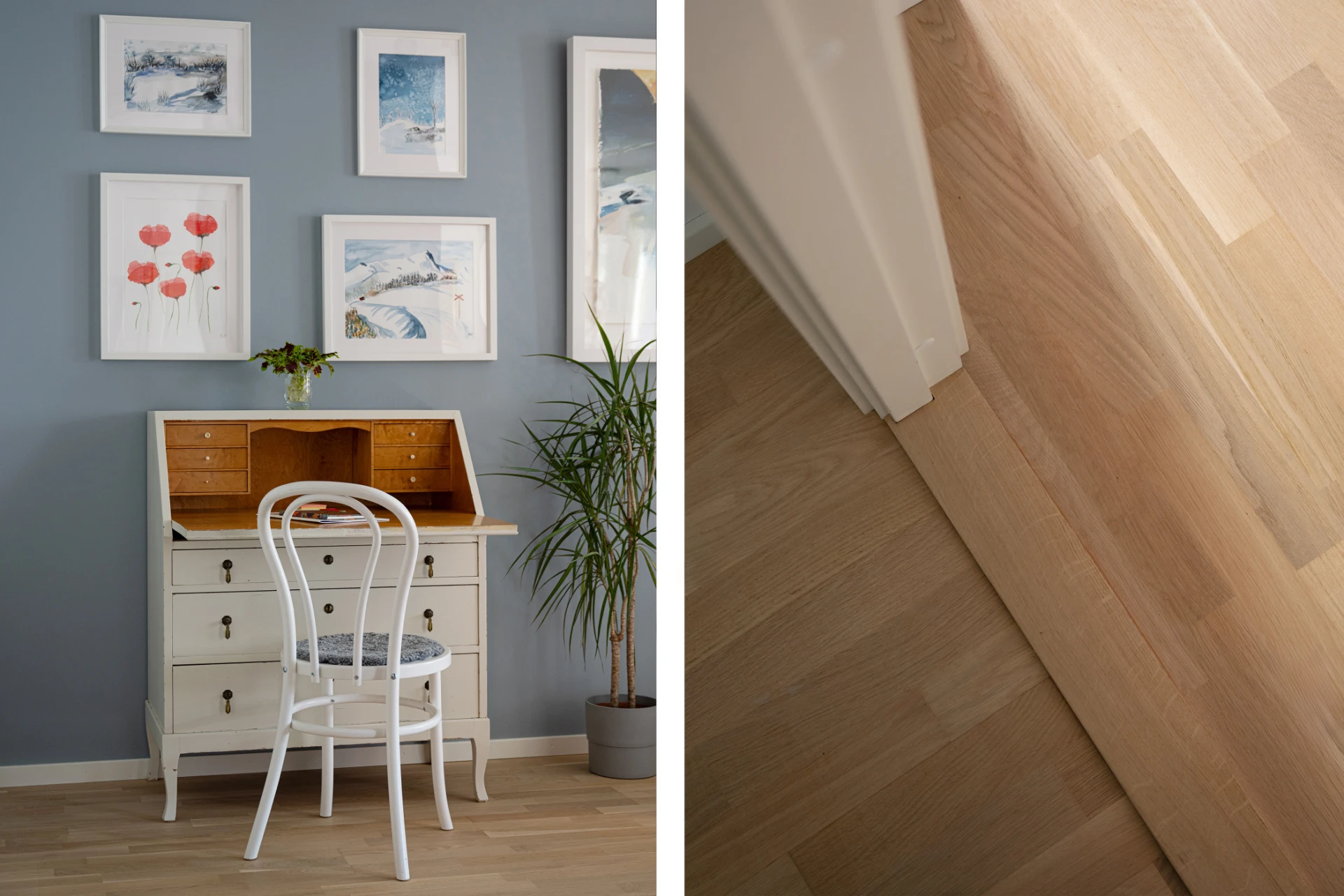 vägg satts upp (föreningen måste godkänna) för att få ett utrymme perfekt att nyttja som sovalkov eller barnrum. Genomgående i bostaden kläs golven av slipad och vitlaserad ekparkettt.