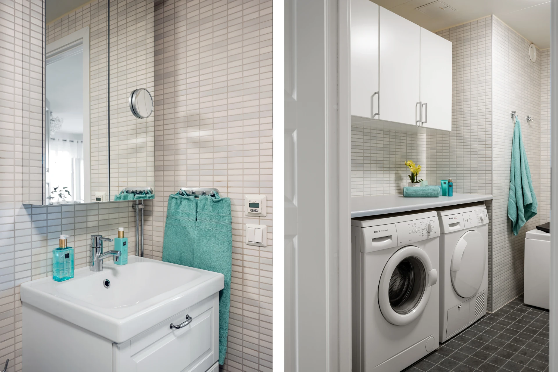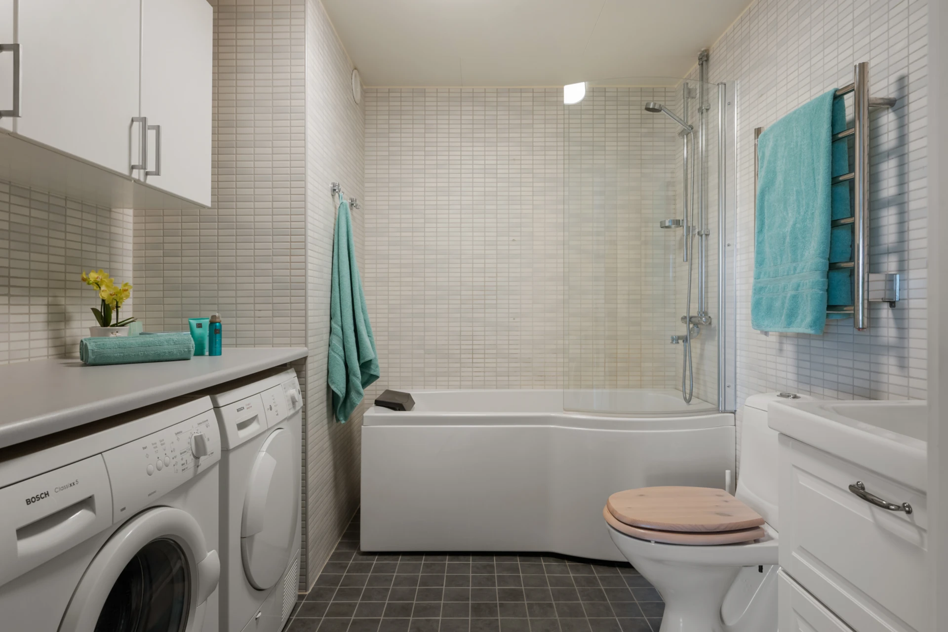 Helkaklat och fräscht badrum med badkar. Badrummet är vidare utrustat med wc, tvättställskommod och spegel med inbyggd belysning, samt lyxen till både tvättmaskin och torktumlare. Över tvättmaskin och torktumlare finns en praktisk arbetsbänk, samt vägghängda skåp som ger gott om förvaring. Svängda glasdörrar till dusch som tidigare suttit i badrummet finns sparade i förrådet.