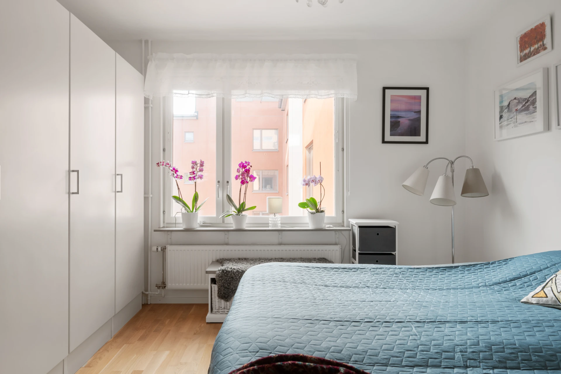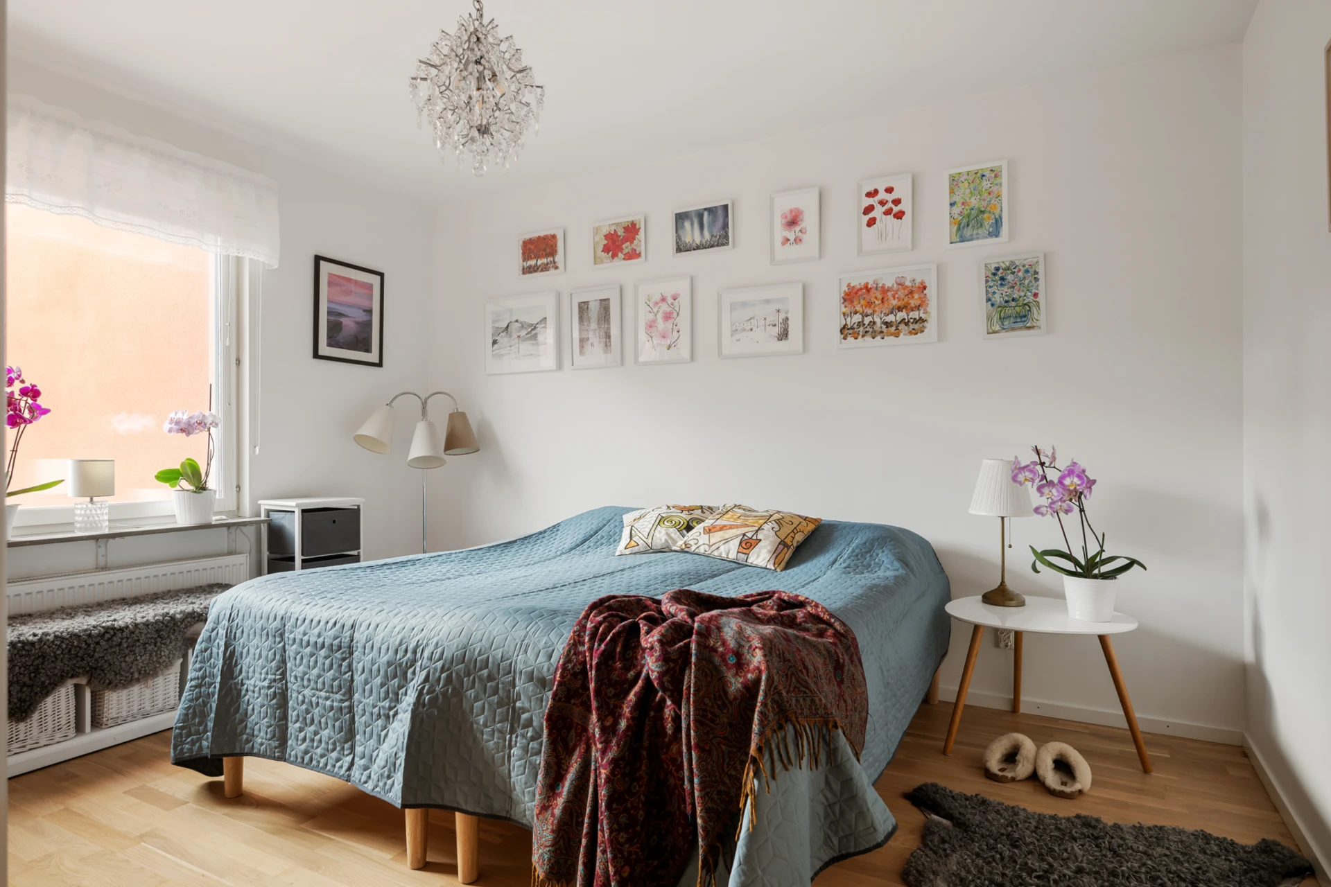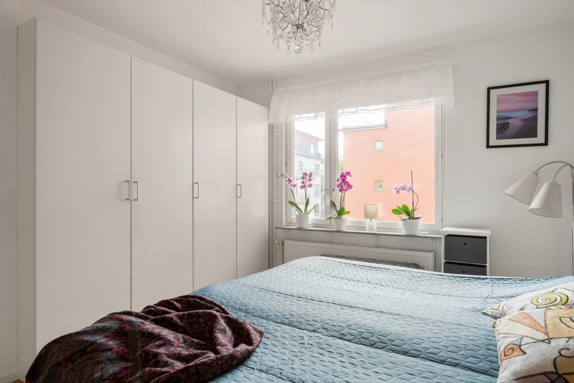 Harmoniskt och rogivande sovrum med plats för dubbelsäng och tillhörande sängbord och även skrivbord om så önskas. Längst ena väggen löper flertalet garderober som ger mycket förvaringsutrymme.