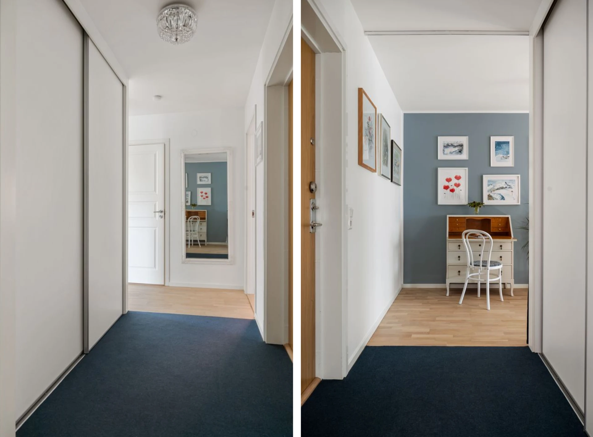 Välkomnande hall i bra storlek med avhängning i garderober med skjutdörrar direkt i anslutning till entrén.