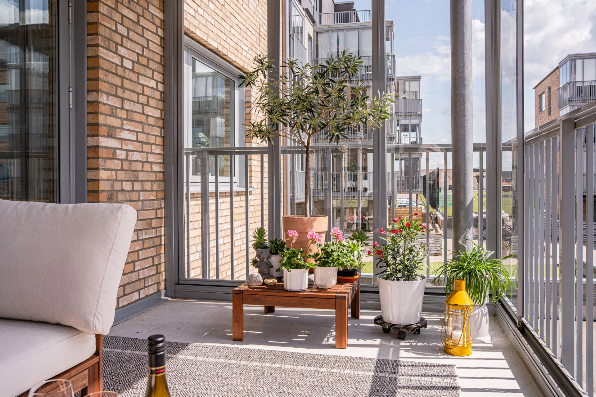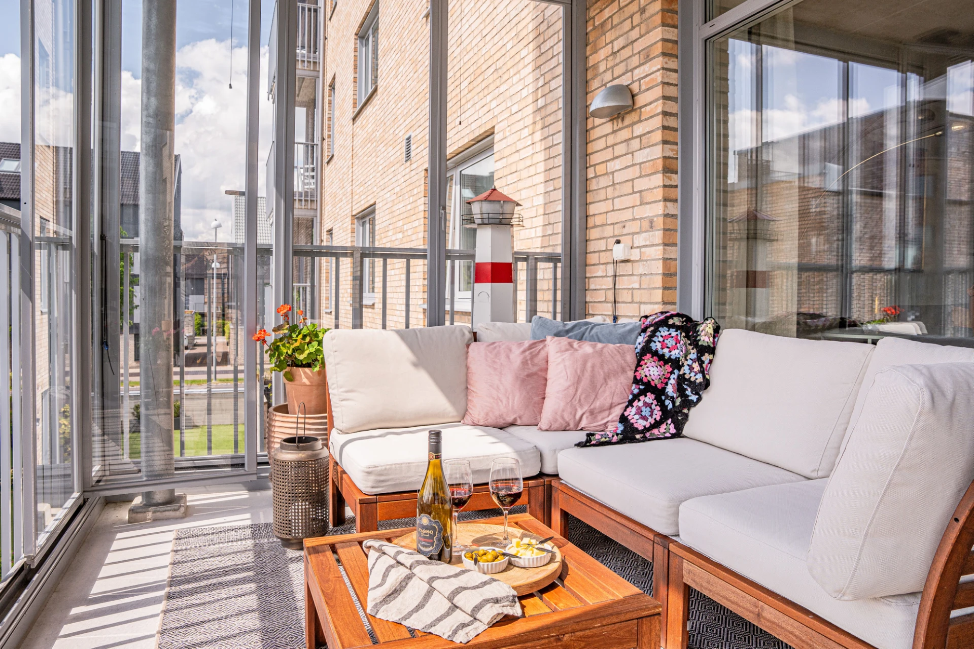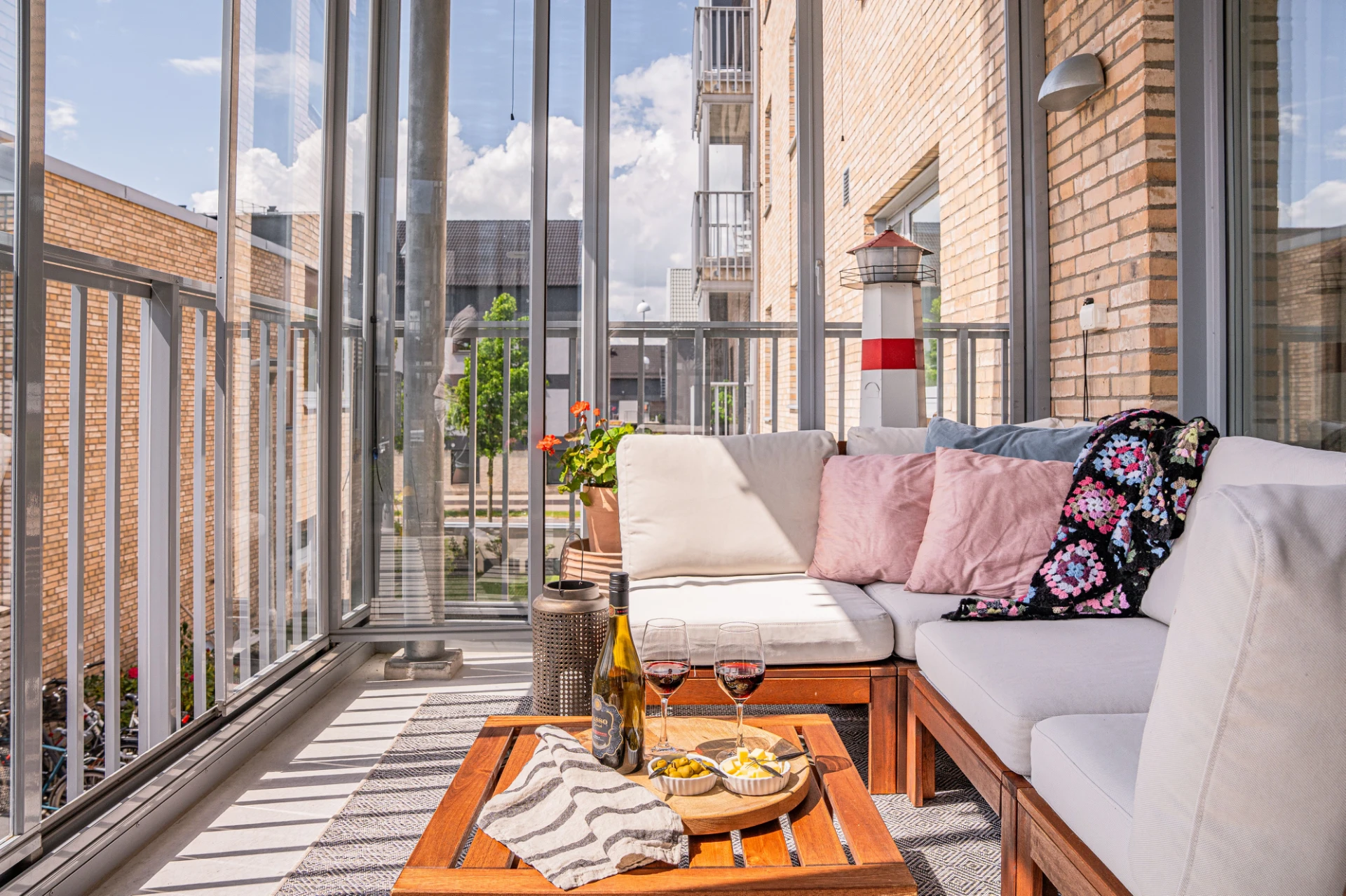 Den stora, inglasade balkongen i söderläge blir ett extra rum större delen av året – perfekt för såväl morgonkaffet som sena kvällar.