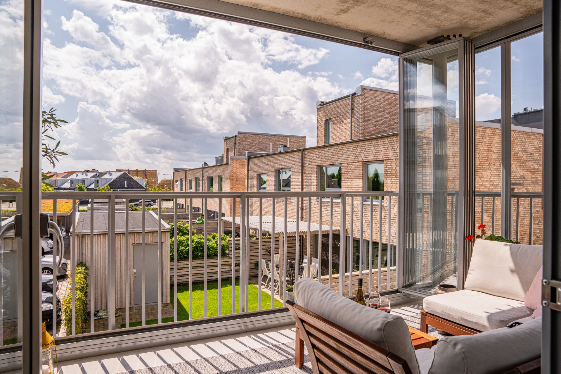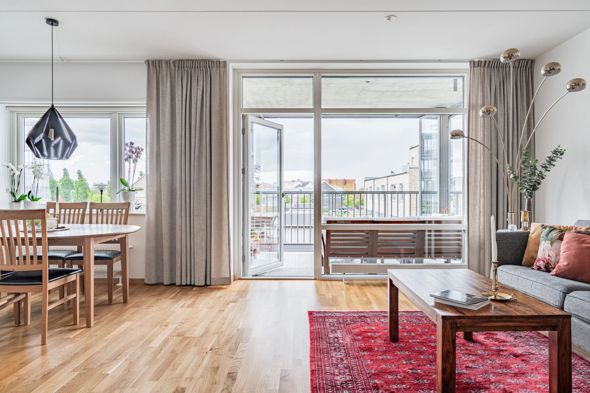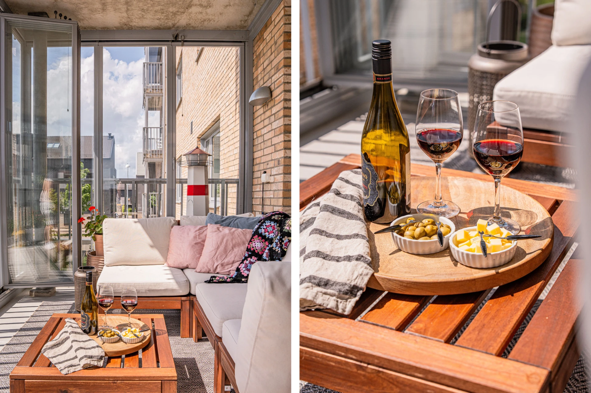 Den stora, inglasade balkongen i söderläge blir ett extra rum större delen av året – perfekt för såväl morgonkaffet som sena kvällar.