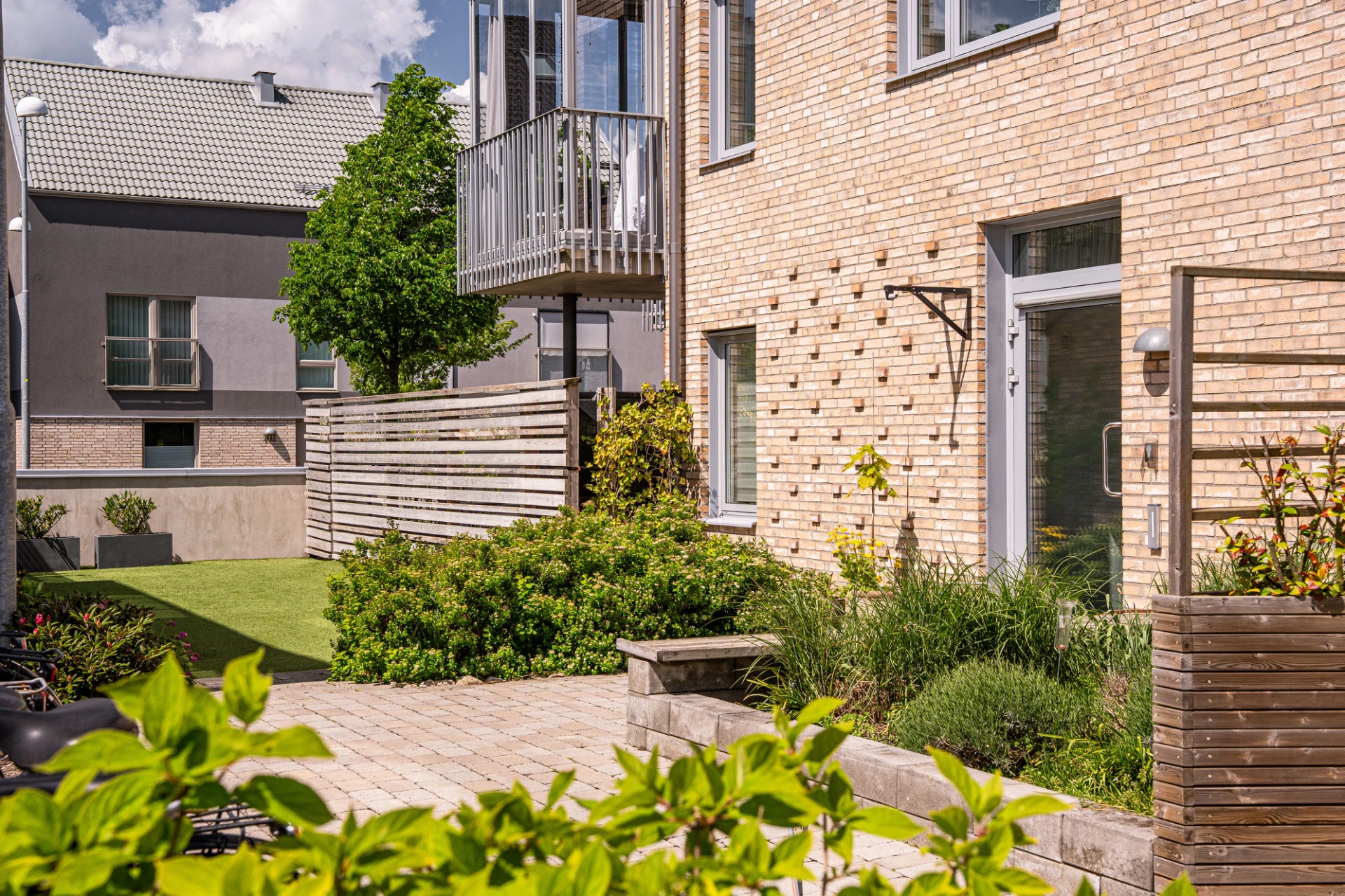 Trevliga gemensamma grönytor med sittplatser att nyttja inom föreningens område.