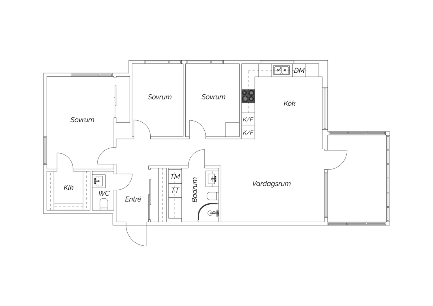 Planlösningen är genomtänkt och flexibel. Det rymliga master bedroom har både garderober och en praktisk klädkammare. Utöver detta finns två mindre sovrum som med fördel kan användas som barnrum, arbetsrum eller gästrum – här finns plats för livet, oavsett skede.
