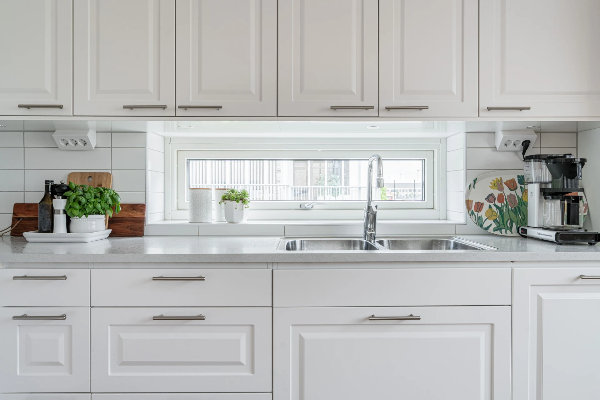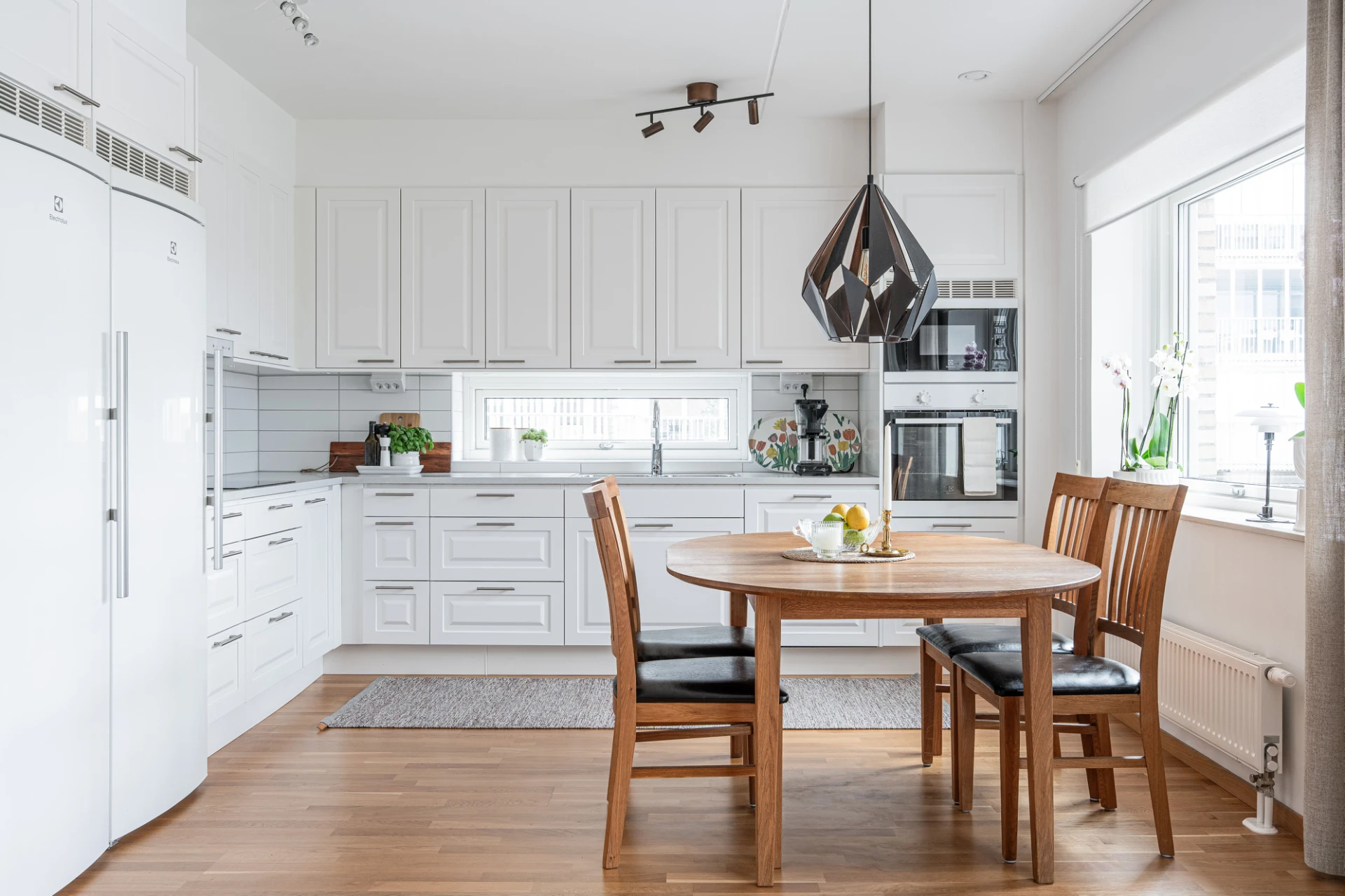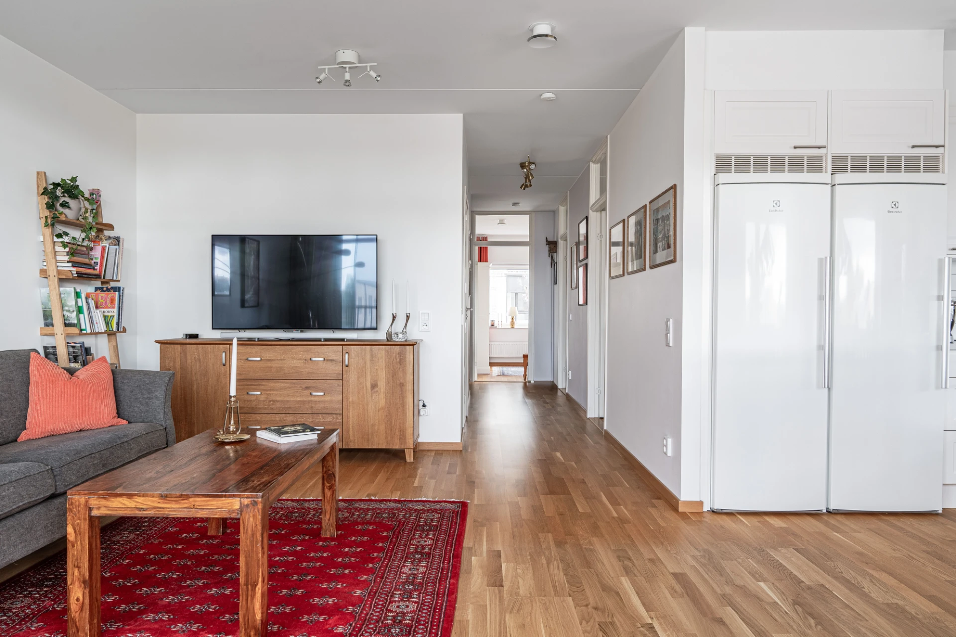 Det stora köket är bostadens hjärta. Med uppgraderade köksluckor, generösa arbetsytor och gott om förvaring blir matlagningen både smidig och social. Tack vare den öppna planlösningen mot vardagsrummet skapas ett ljust och luftigt utrymme för umgänge.