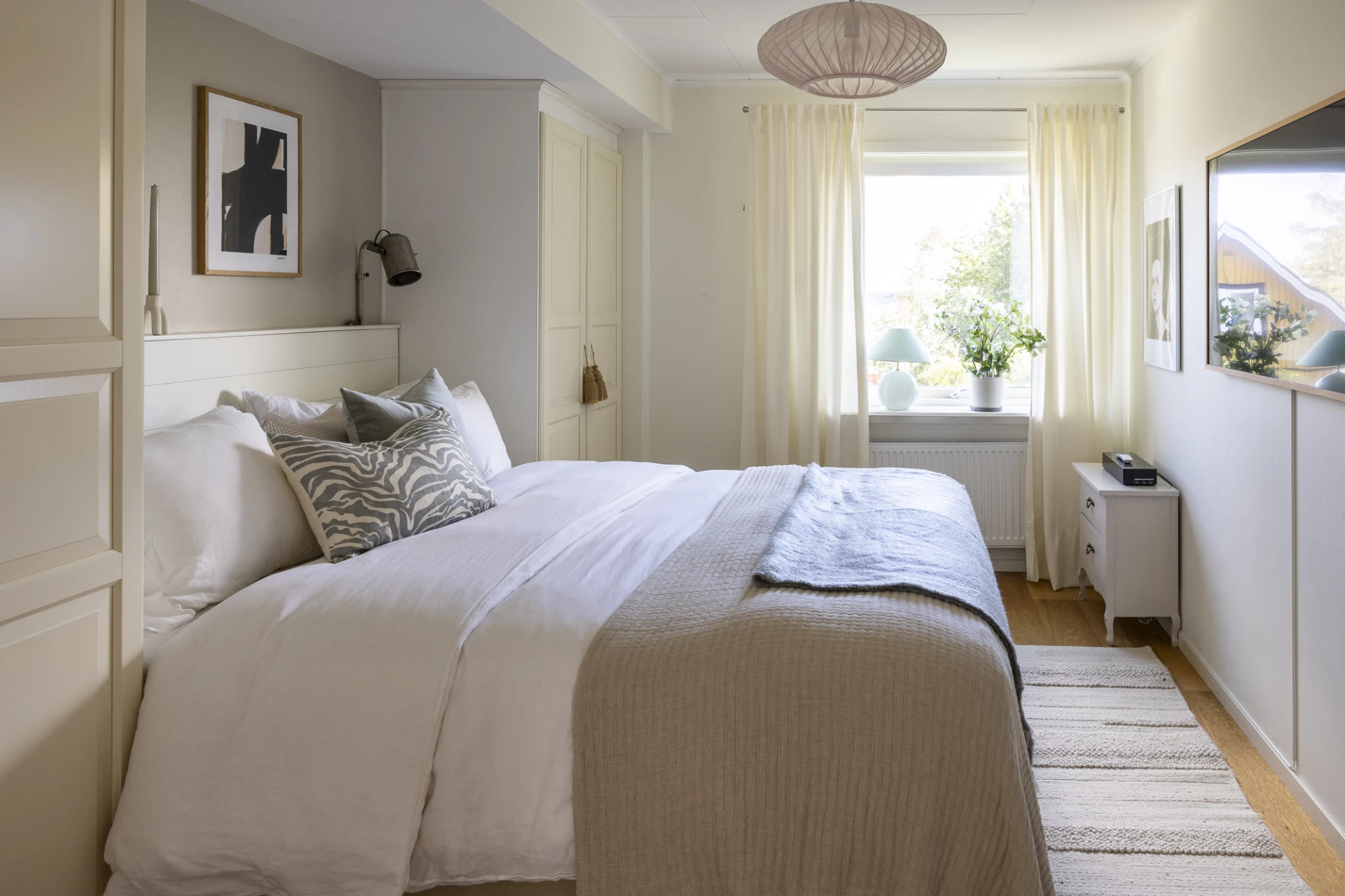 Laminatgolv och vitmålade väggar med en tapetserad del. Rummet erbjuder plats för en dubbelsäng med tillhörande möblemang och gott om plats för avhängning samt förvaring I en skjutdörrsgarderob.