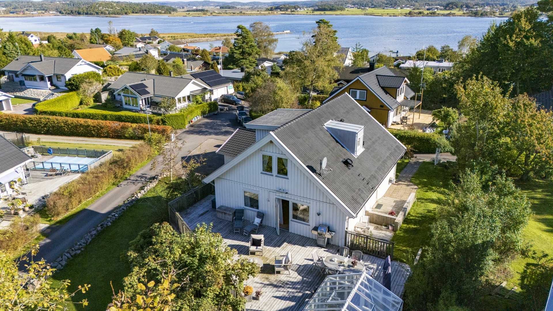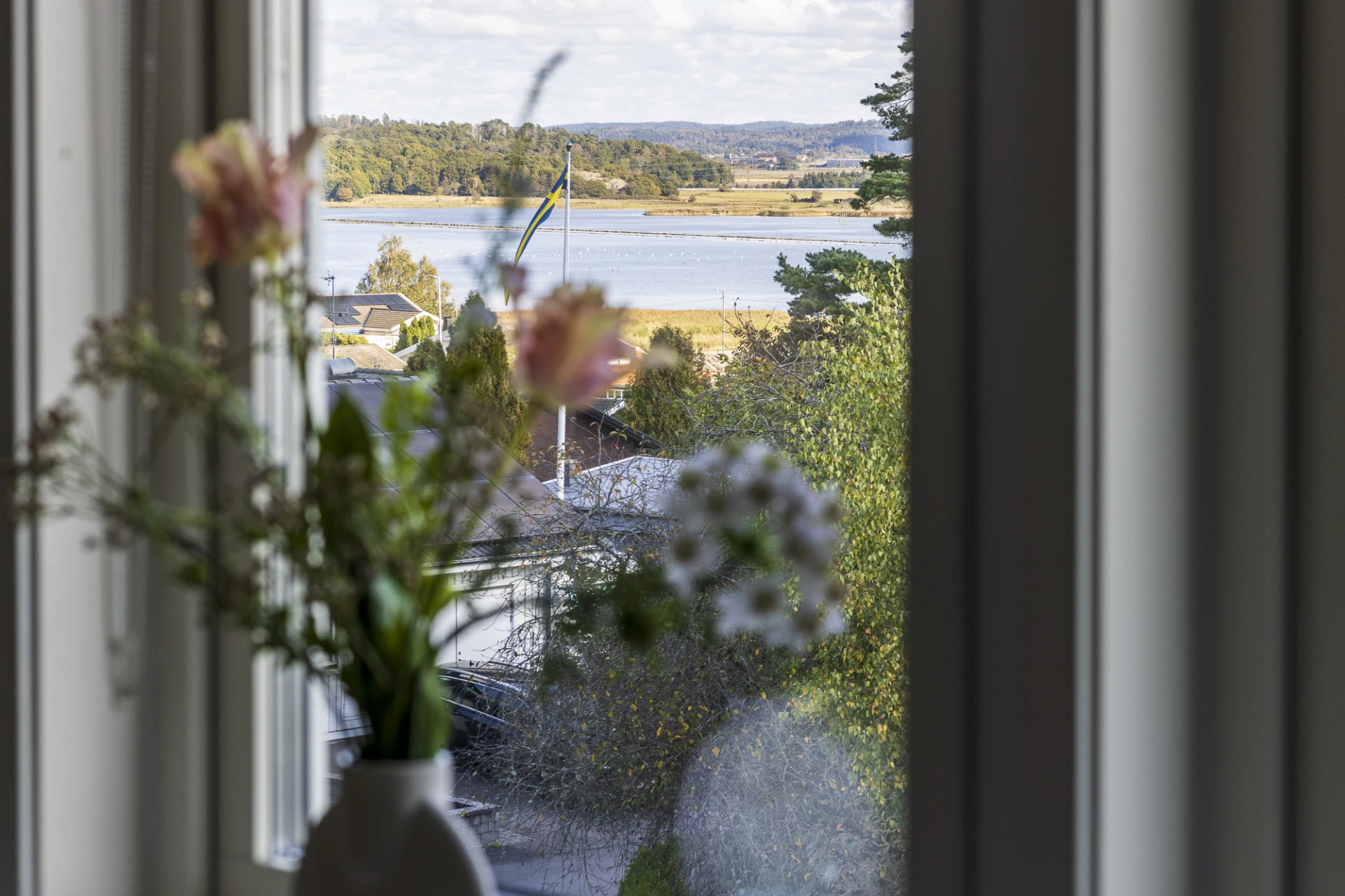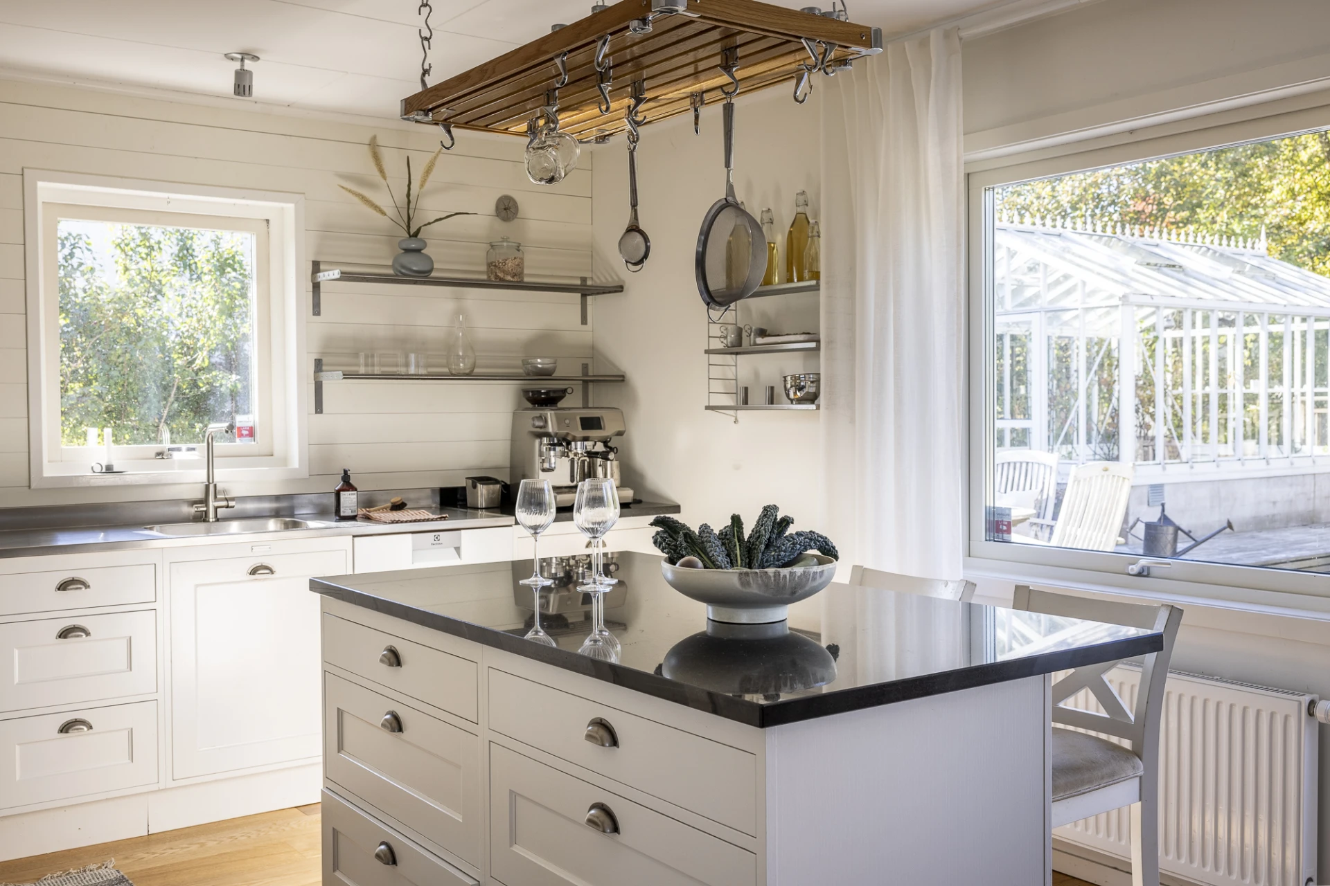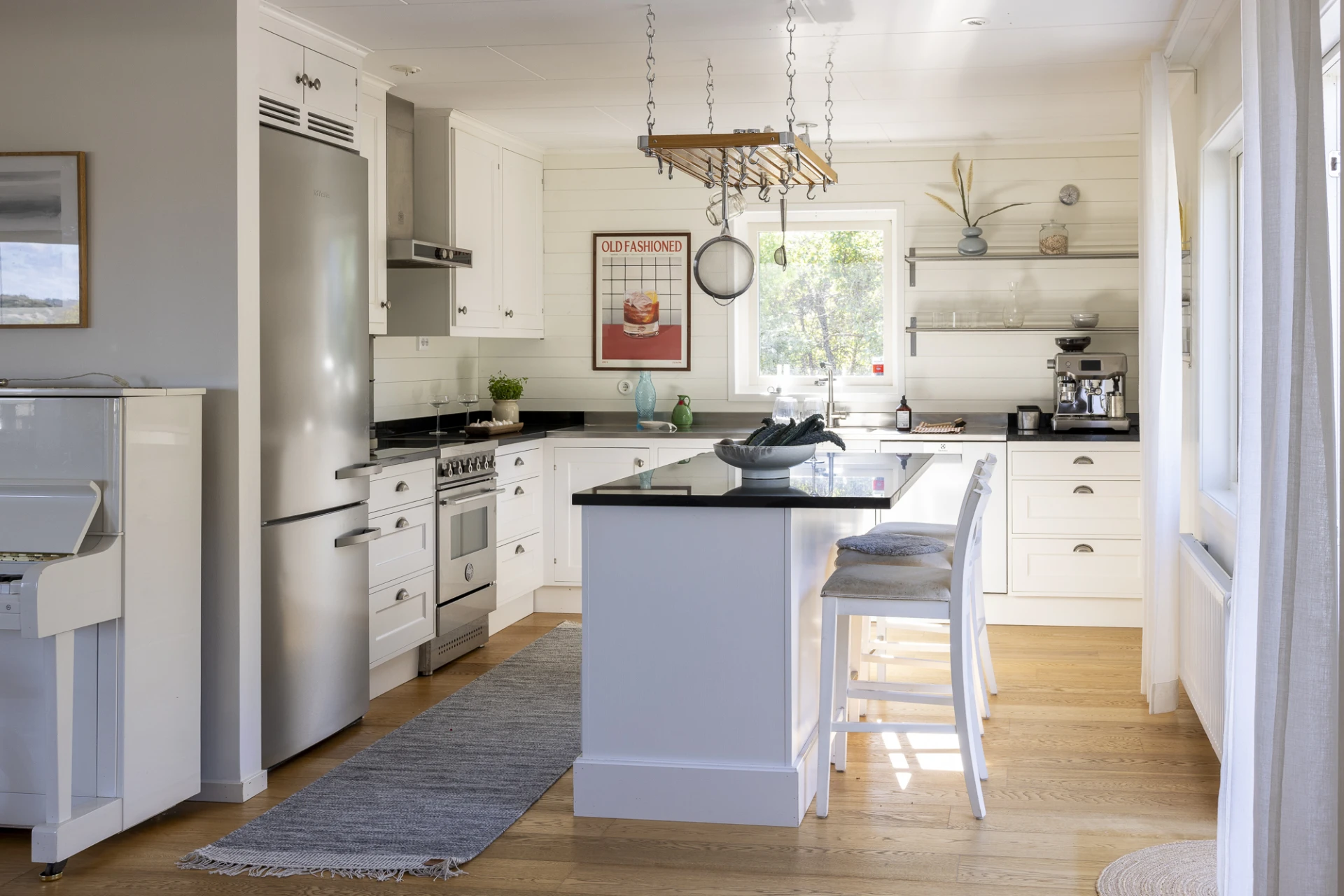 Trägolv och vitmålade väggar. Köksinredningen går i vitt med skåpsluckor från Lidhults och stänkskydd i granit över en bänkskiva i plåt och granit. Den maskinella utrustningen består av en kombinerad kyl och frys, diskmaskin, spis, varmluftsugn samt fläkt. Köket erbjuder plats för ett matbord för upp till 12 personer och härifrån når man bostadens uteplats i västerläge.