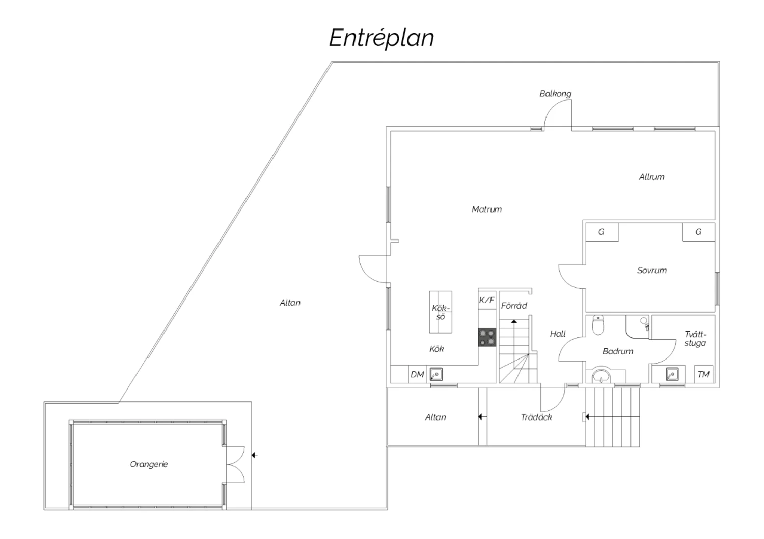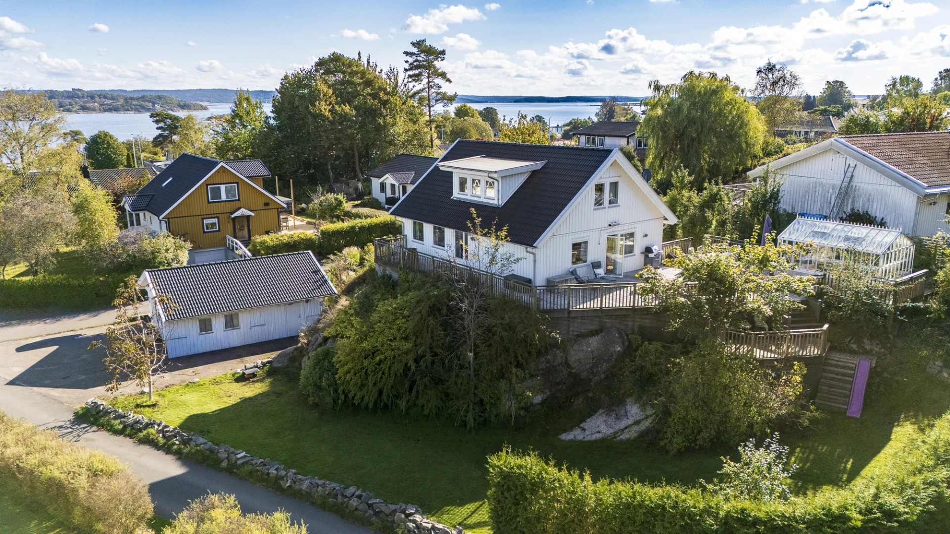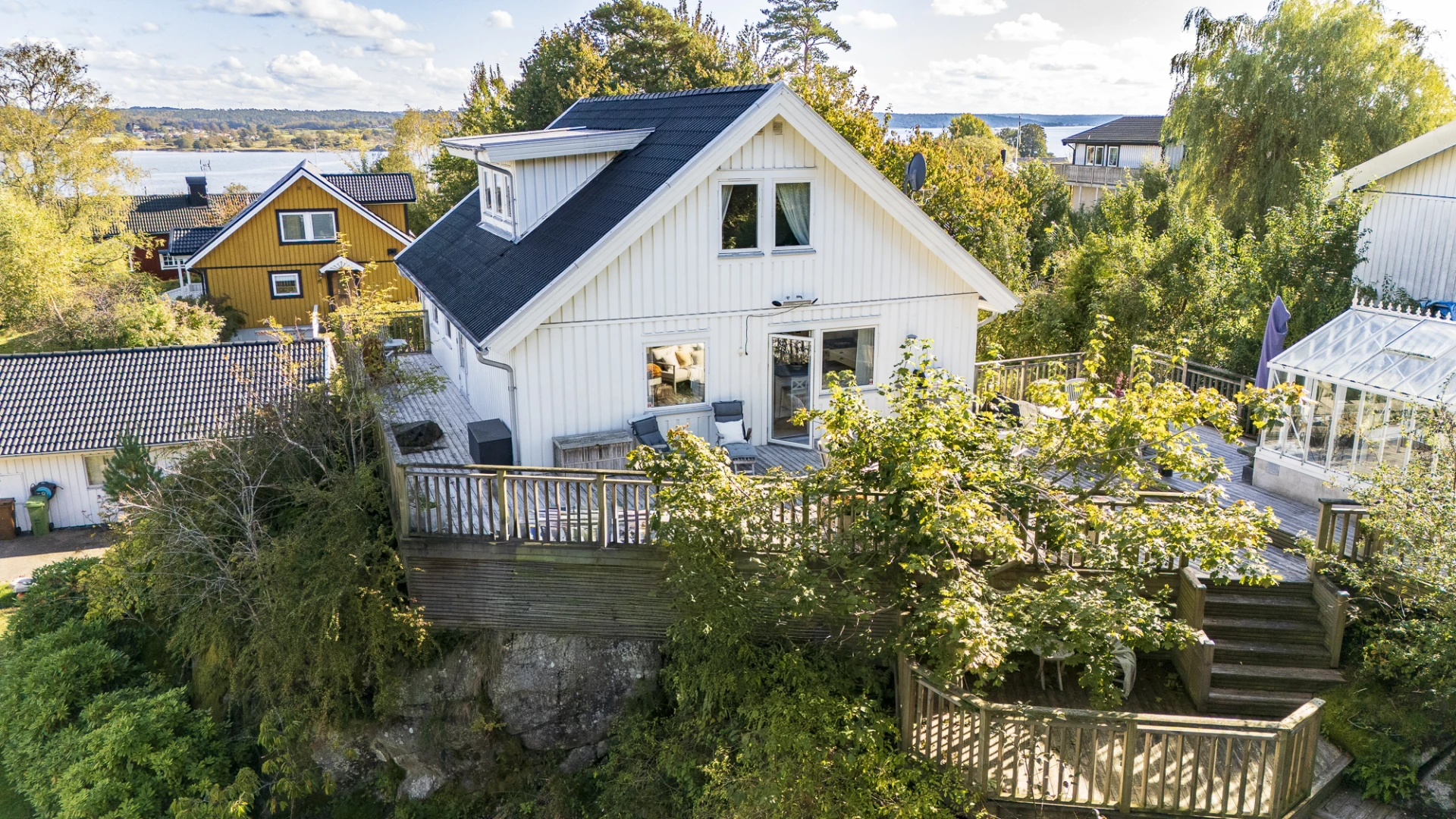 Trägolv och vitmålade väggar. Köksinredningen går i vitt med skåpsluckor från Lidhults och stänkskydd i granit över en bänkskiva i plåt och granit. Den maskinella utrustningen består av en kombinerad kyl och frys, diskmaskin, spis, varmluftsugn samt fläkt. Köket erbjuder plats för ett matbord för upp till 12 personer och härifrån når man bostadens uteplats i västerläge.