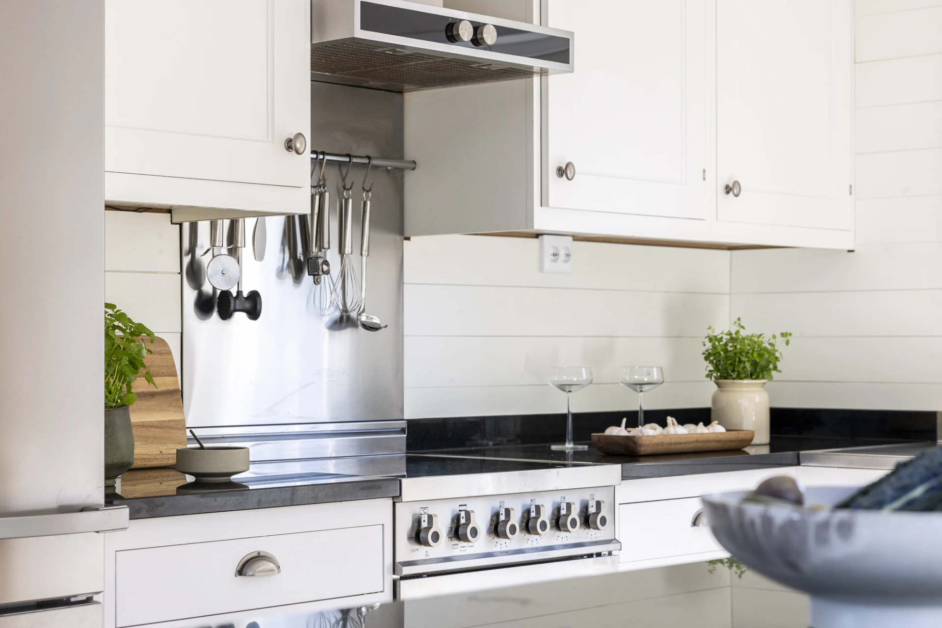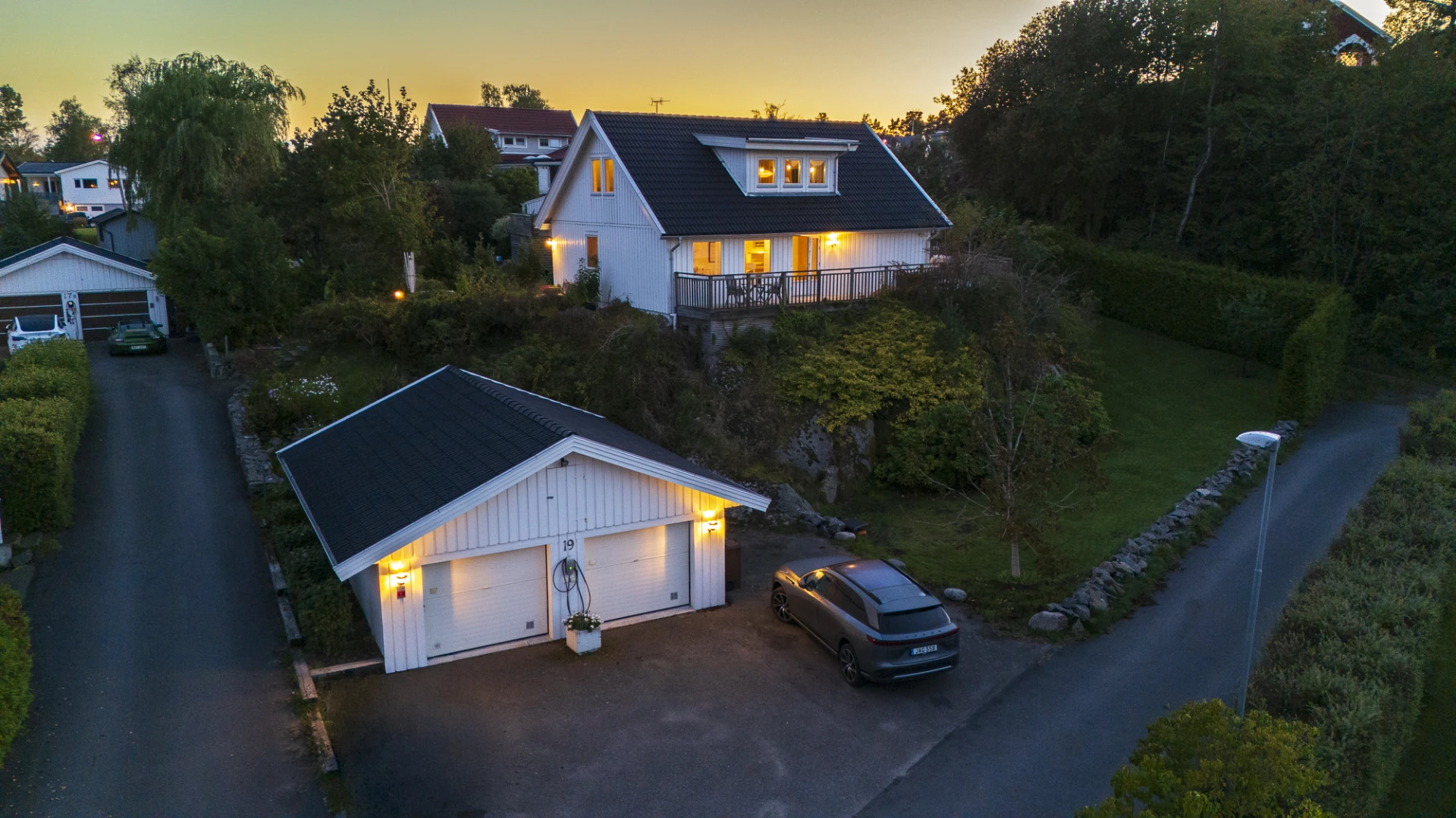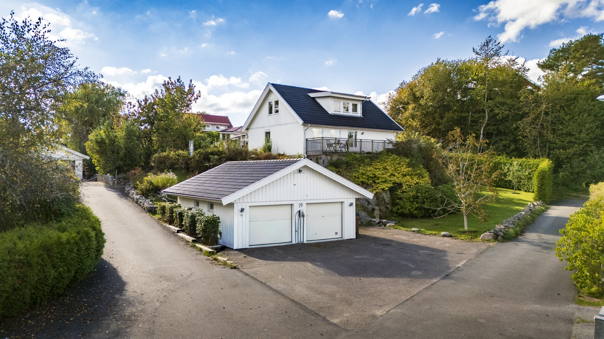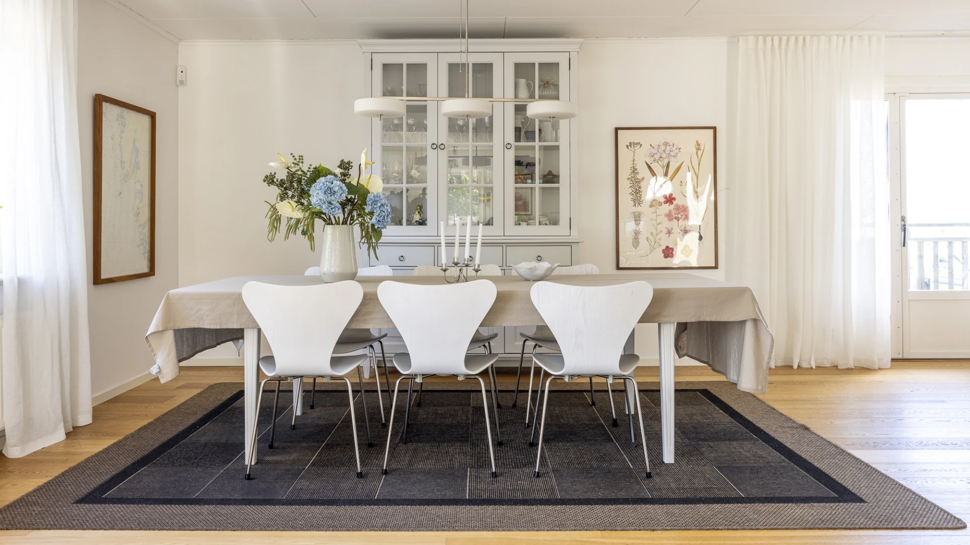 Trägolv och vitmålade väggar. Köksinredningen går i vitt med skåpsluckor från Lidhults och stänkskydd i granit över en bänkskiva i plåt och granit. Den maskinella utrustningen består av en kombinerad kyl och frys, diskmaskin, spis, varmluftsugn samt fläkt. Köket erbjuder plats för ett matbord för upp till 12 personer och härifrån når man bostadens uteplats i västerläge.