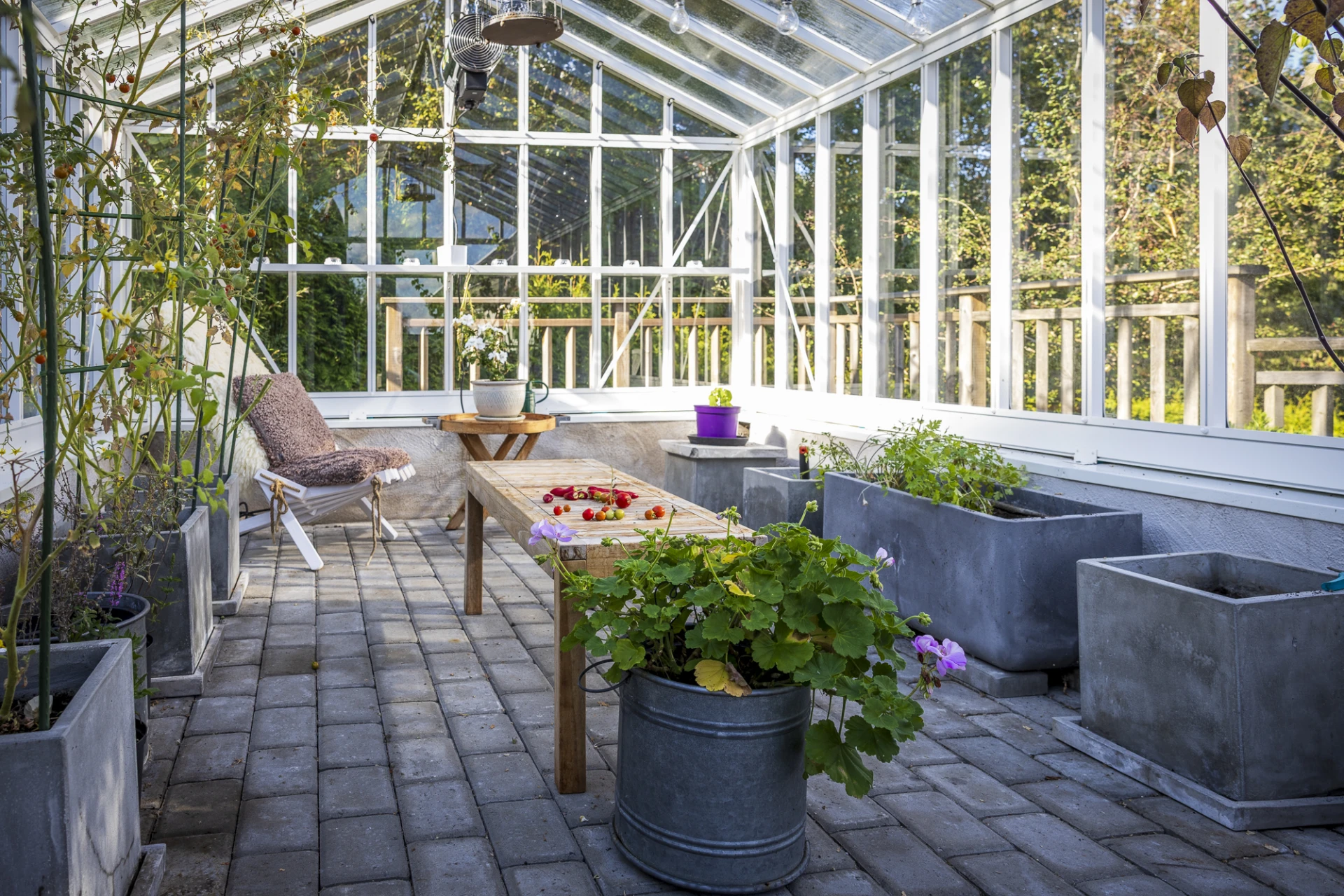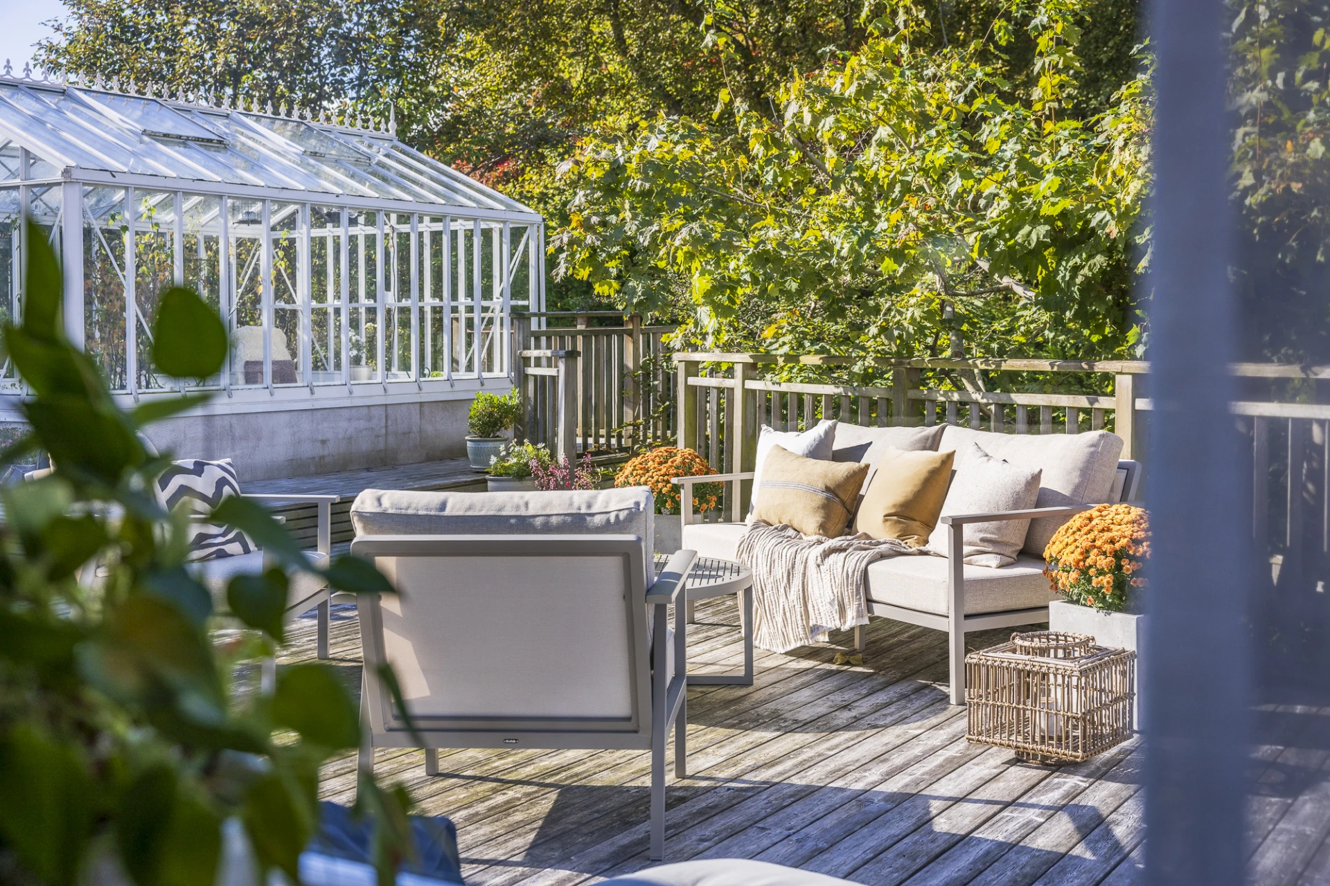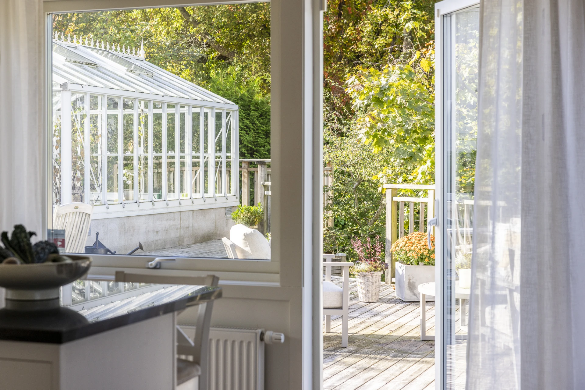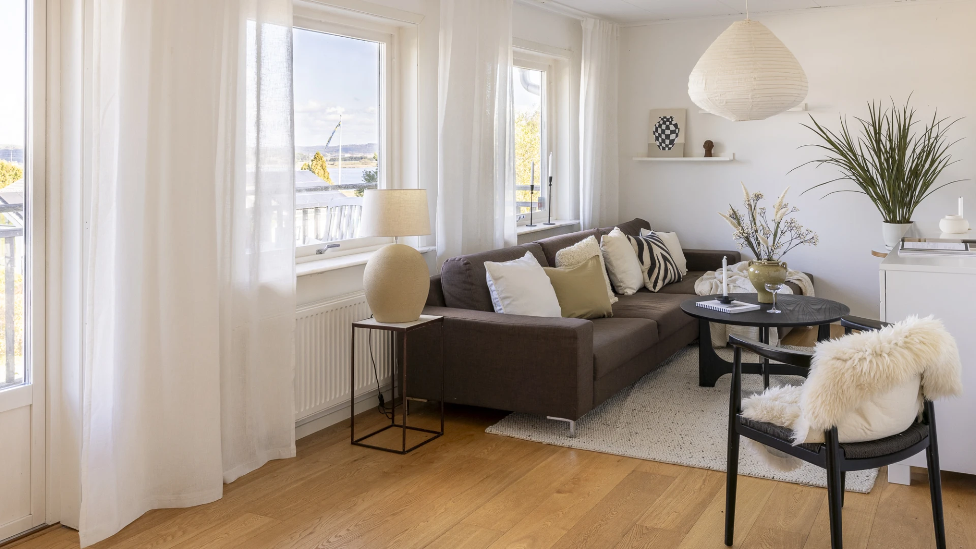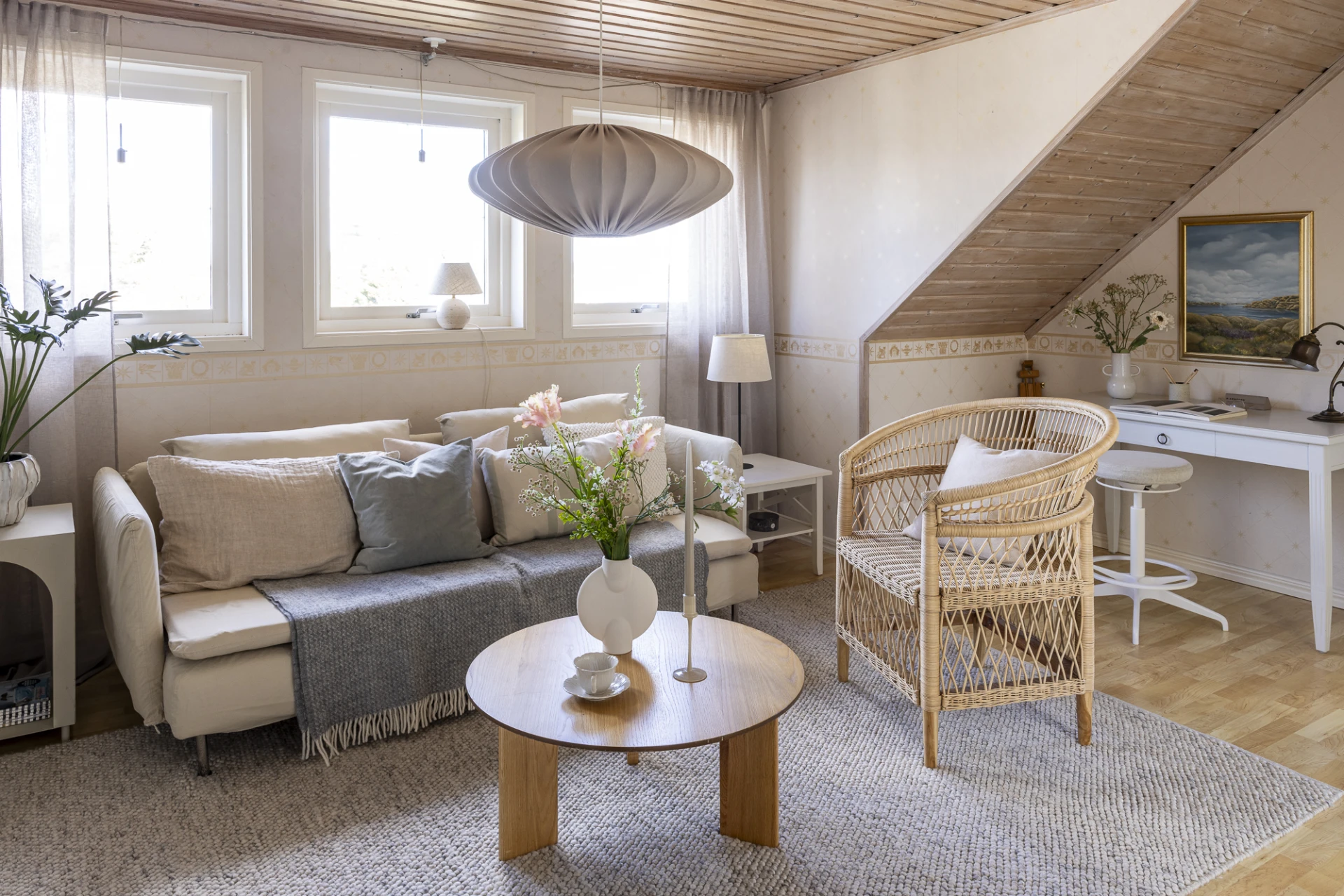 Trägolv och vitmålade väggar. Rummet erbjuder plats för en soffgrupp med tillhörande möblemang och härifrån når man bostadens härliga uteplats.