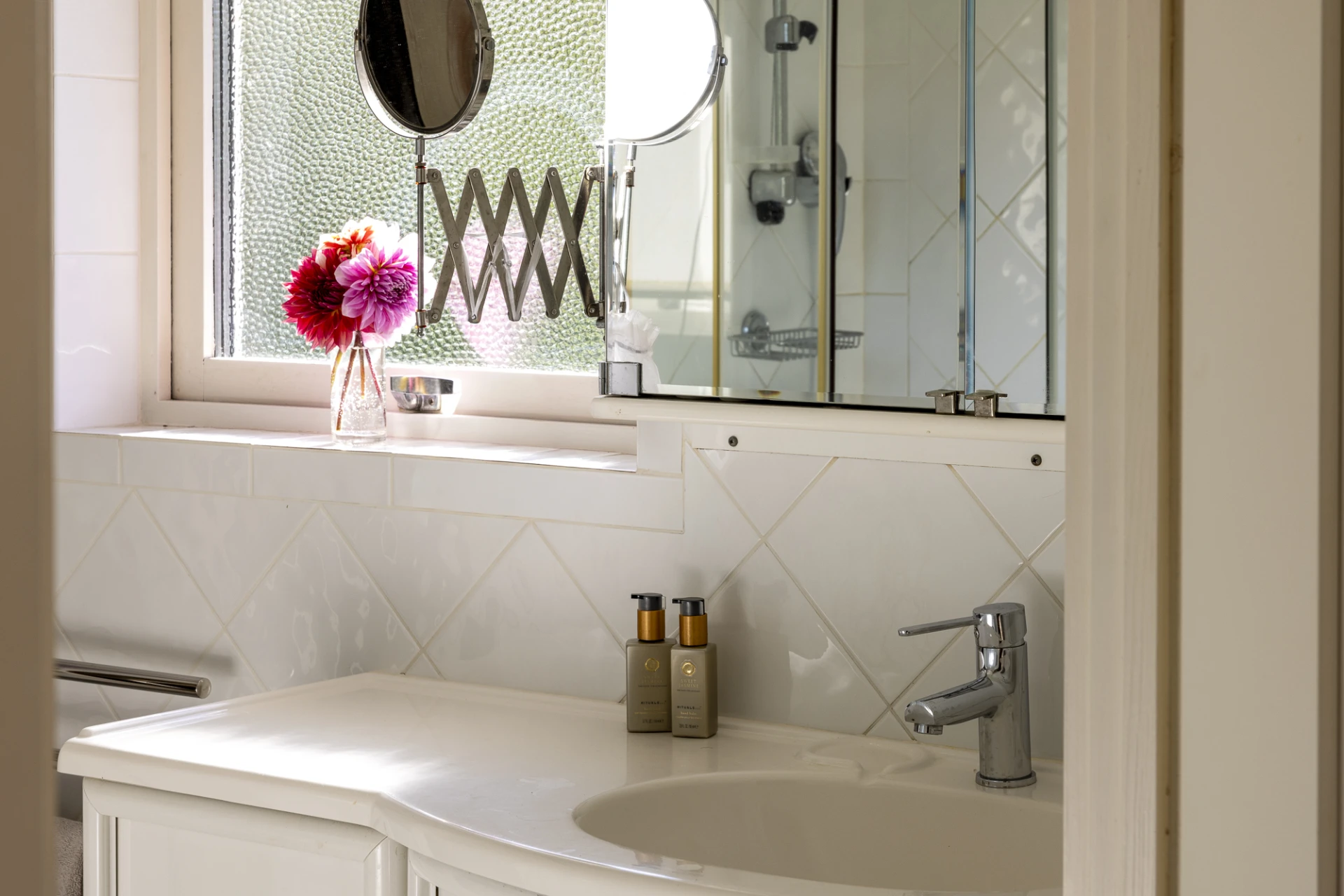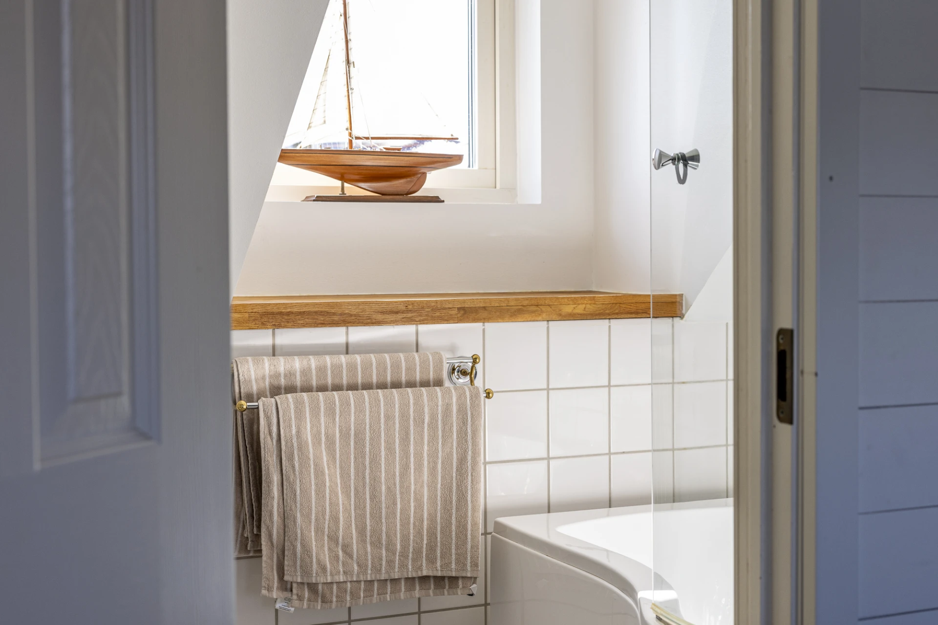 Klinkergolv med golvvärme och helkaklade vita väggar. Här finns wc-stol, dusch, badkar, spegel, handfat samt med kommod.