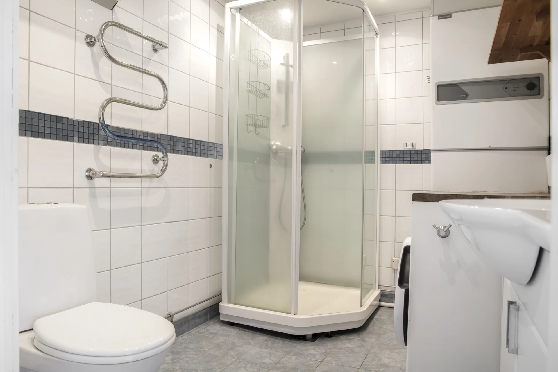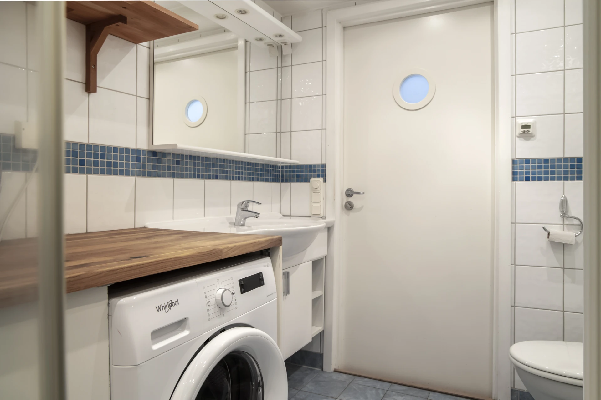 Ljusblått klinkergolv och helkaklade vita väggar med en blå detalj. Här finns wc-stol, duschkabin, tvättmaskin, handfat med kommod, spegel samt värmepanna.