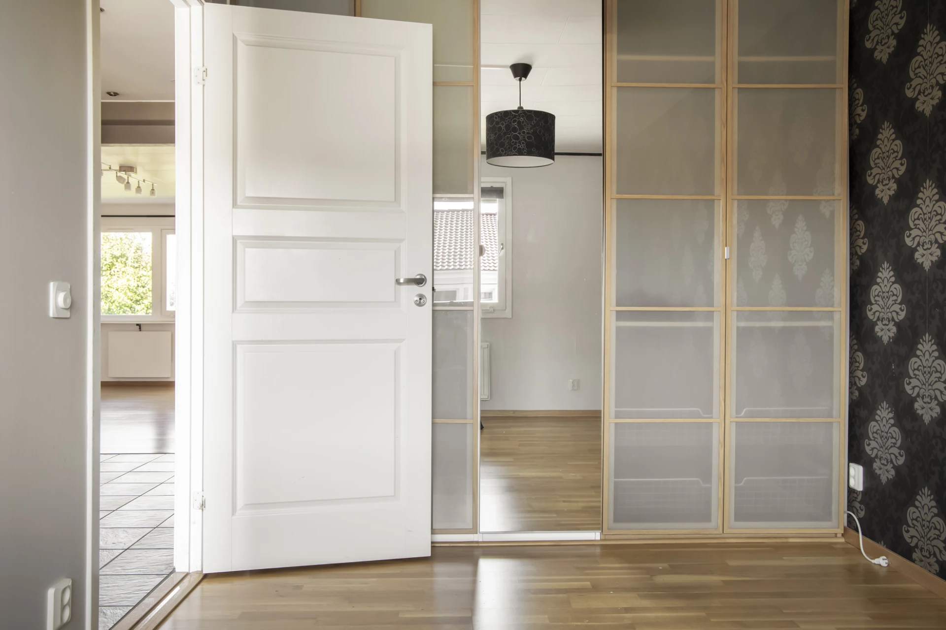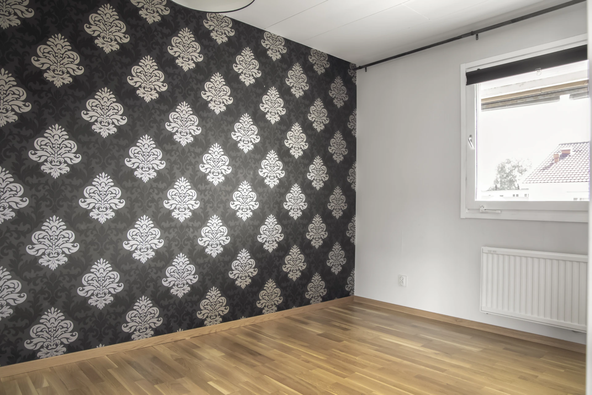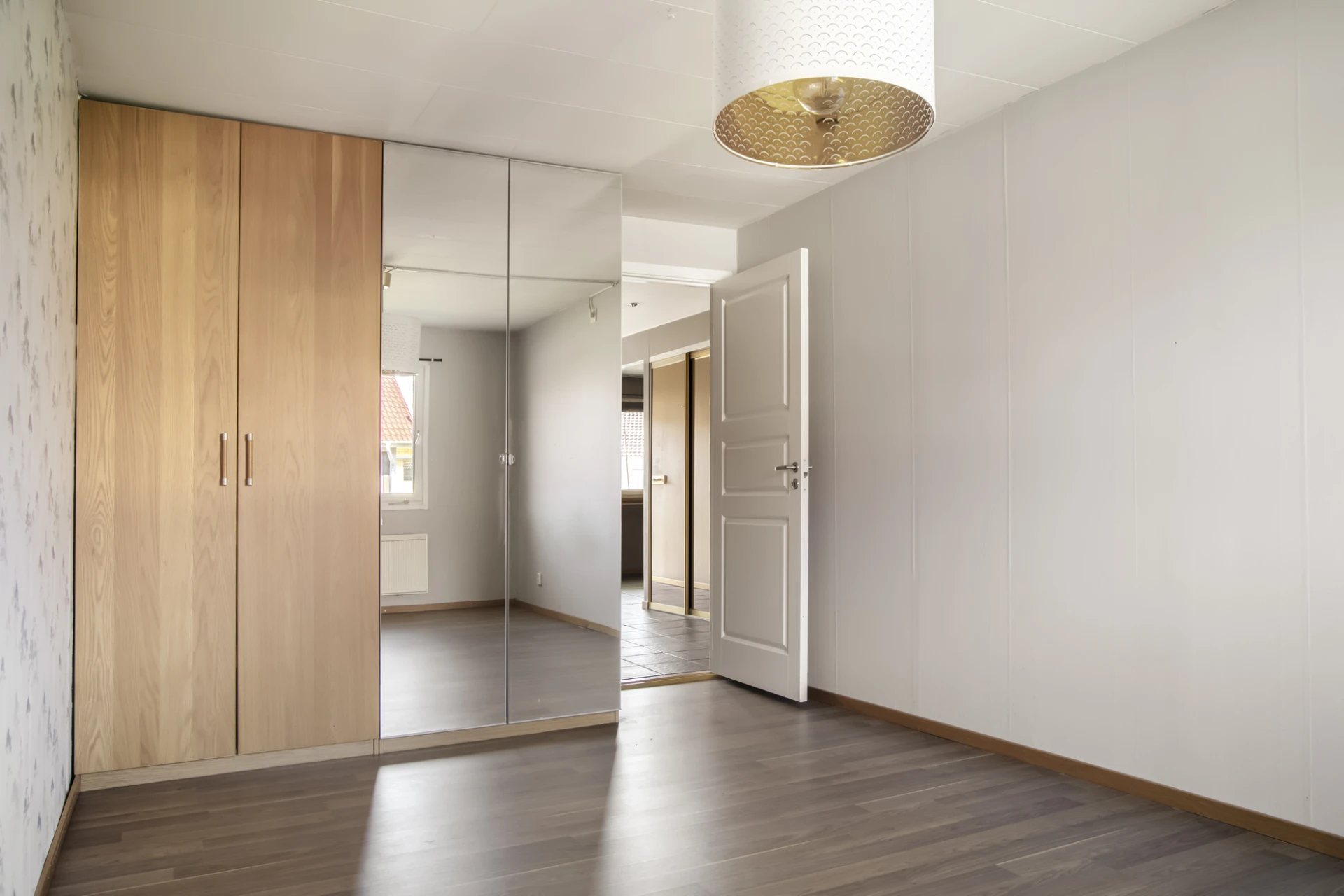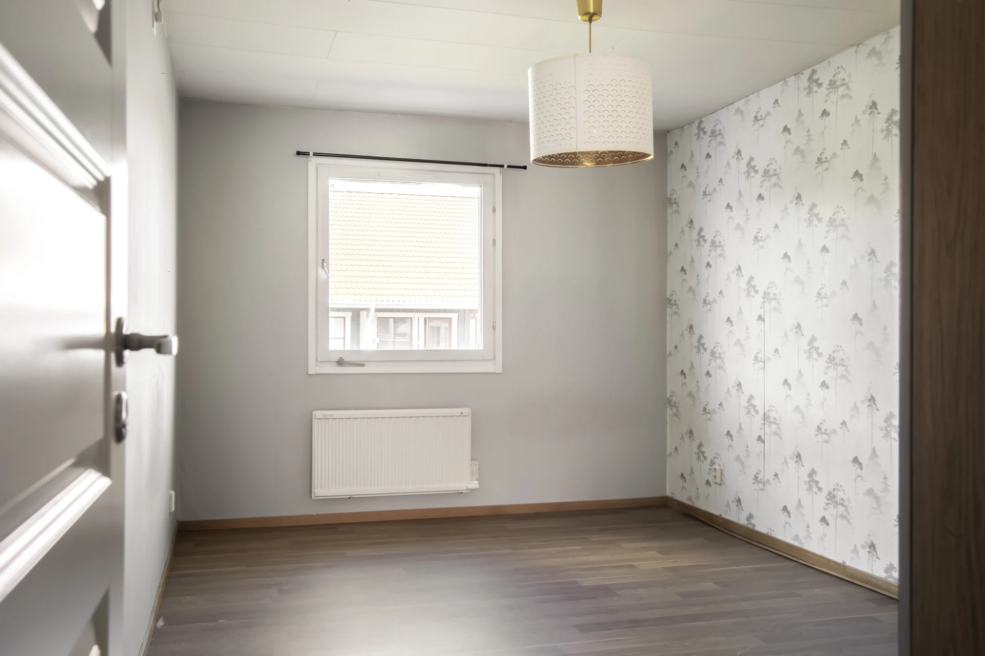 Laminatgolv och vitmålade väggar med en mönstrad fondtapet. Här finns plats för en dubbelsäng med tillhörande möblemang och avhängningen och förvaringen består av två garderober.