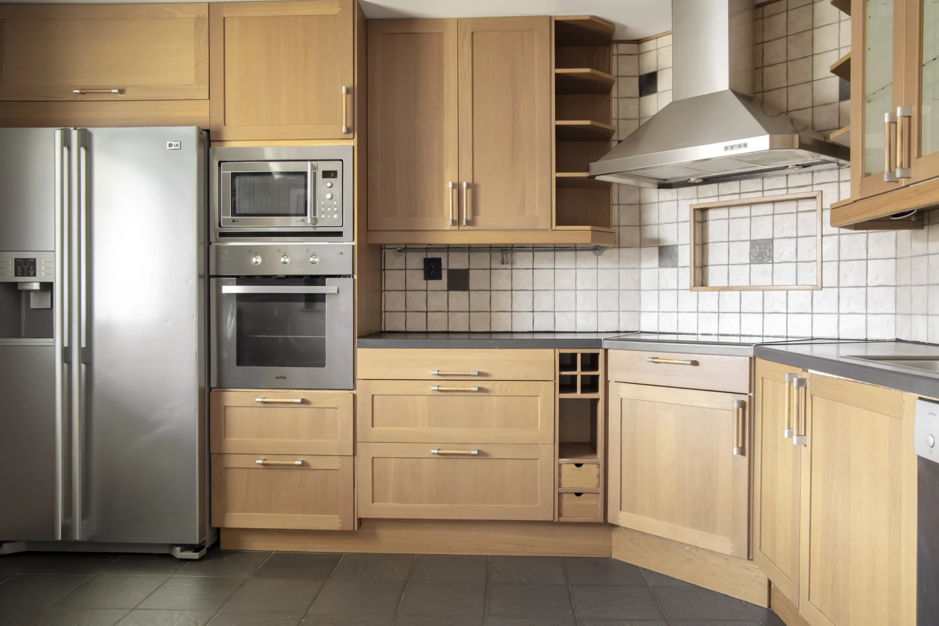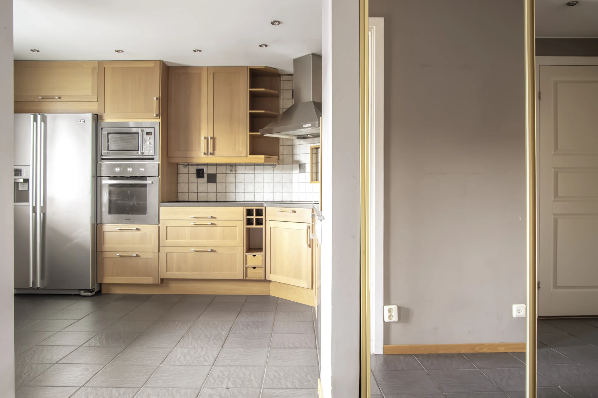 Grått klinkergolv med eldriven golvvärme och väggar målade i ljusgrå kulör. Köksinredningen går i massivt trä och vitt kakel över en bänkskiva i mörkgrått. Den maskinella utrustningen består av en kyl och frys i fullhöjd, inbyggd mikro och ugn, induktionshäll, diskmaskin, fläkt samt inbyggd tv och högtalare. Här finns plats för ett matbord för upp till sex personer.