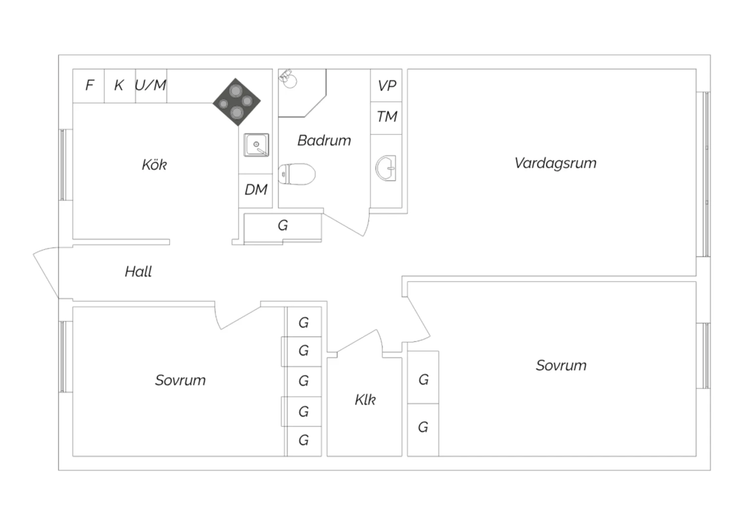 Lägenheten har två tilltagna sovrum med plats för både säng och förvaring. Badrummet är utrustat med tvättmaskin, vilket ger dig bekvämligheten att sköta tvätten i din egen takt, utan att behöva använda gemensamma utrymmen.