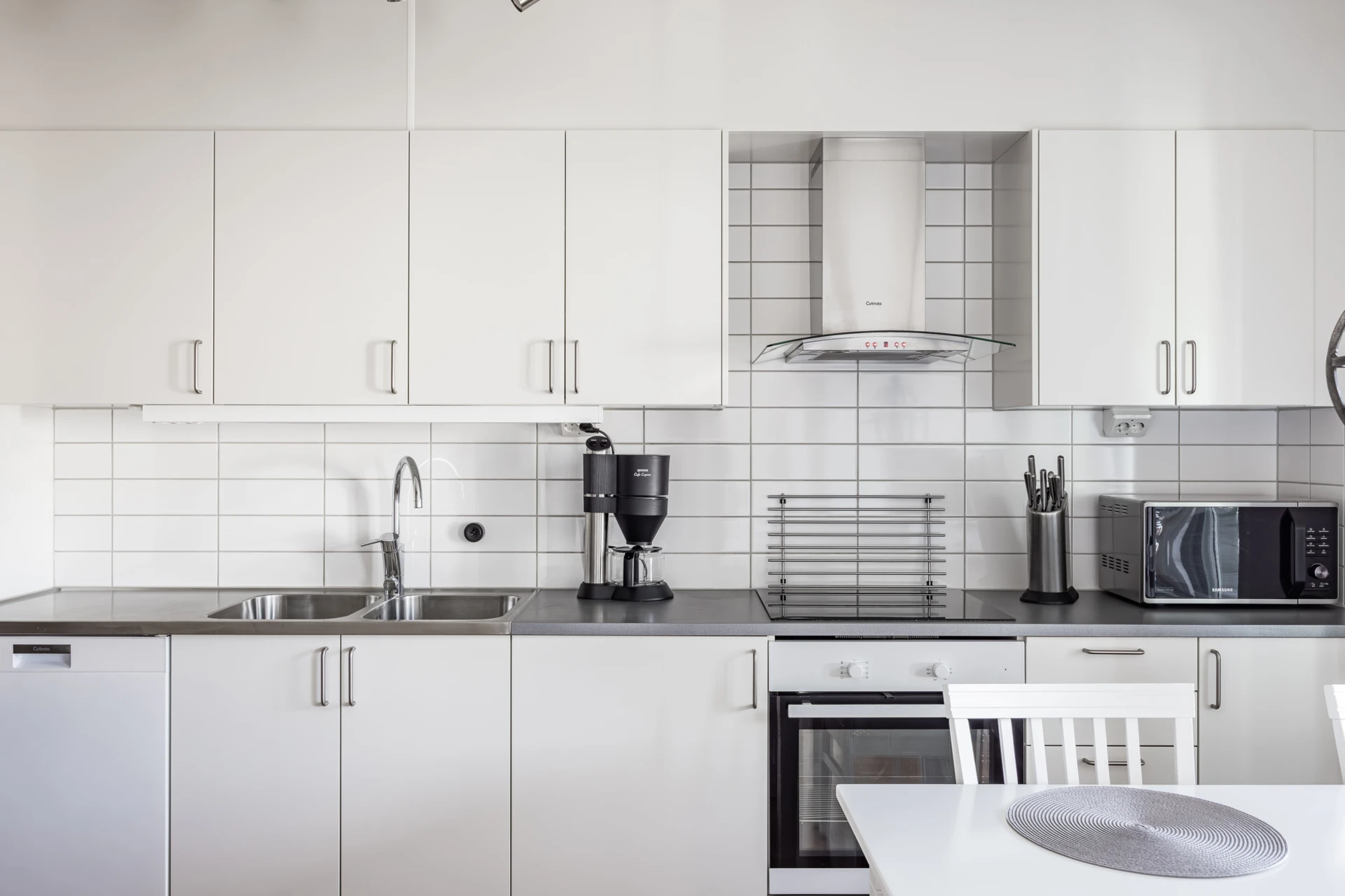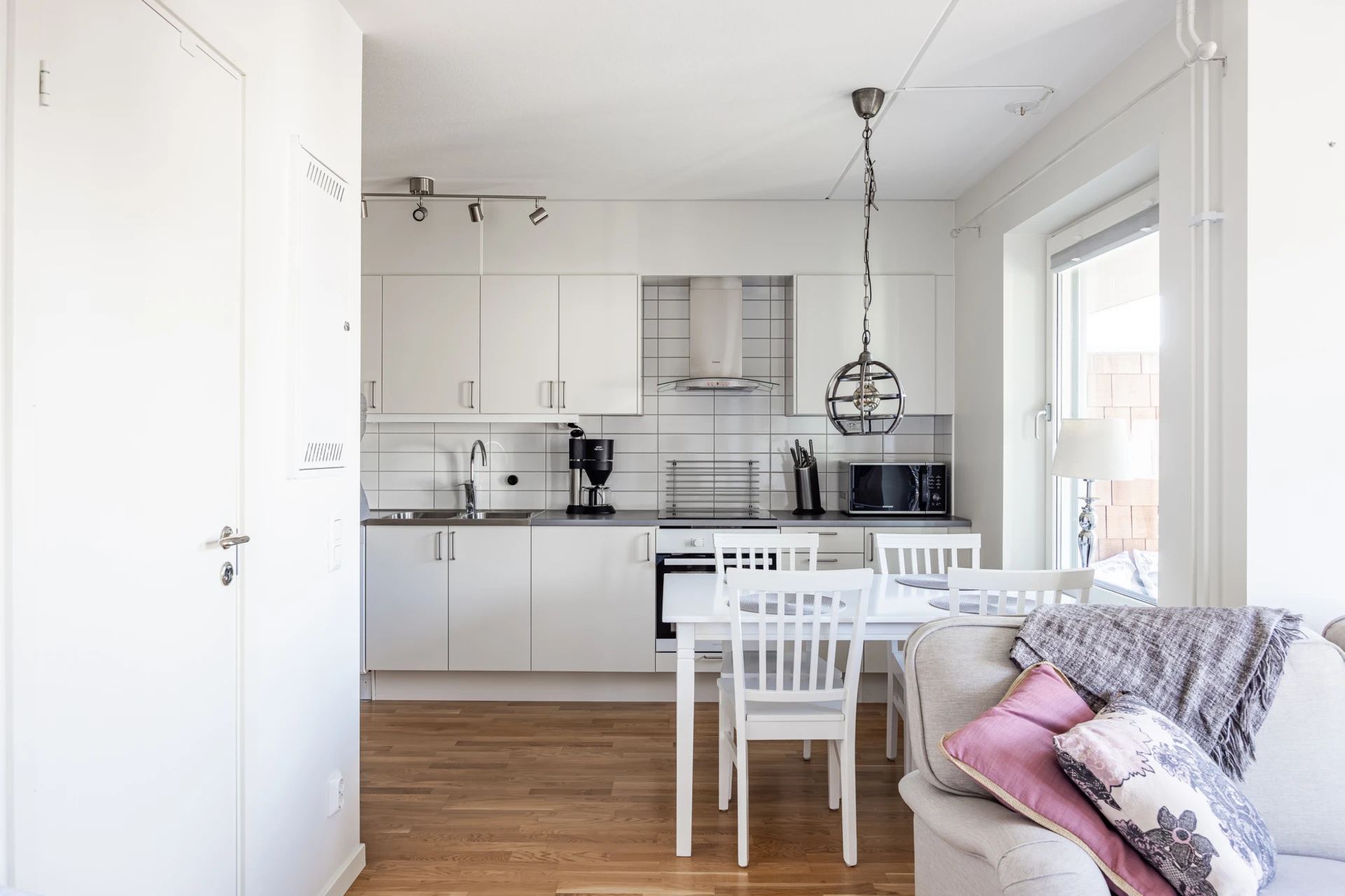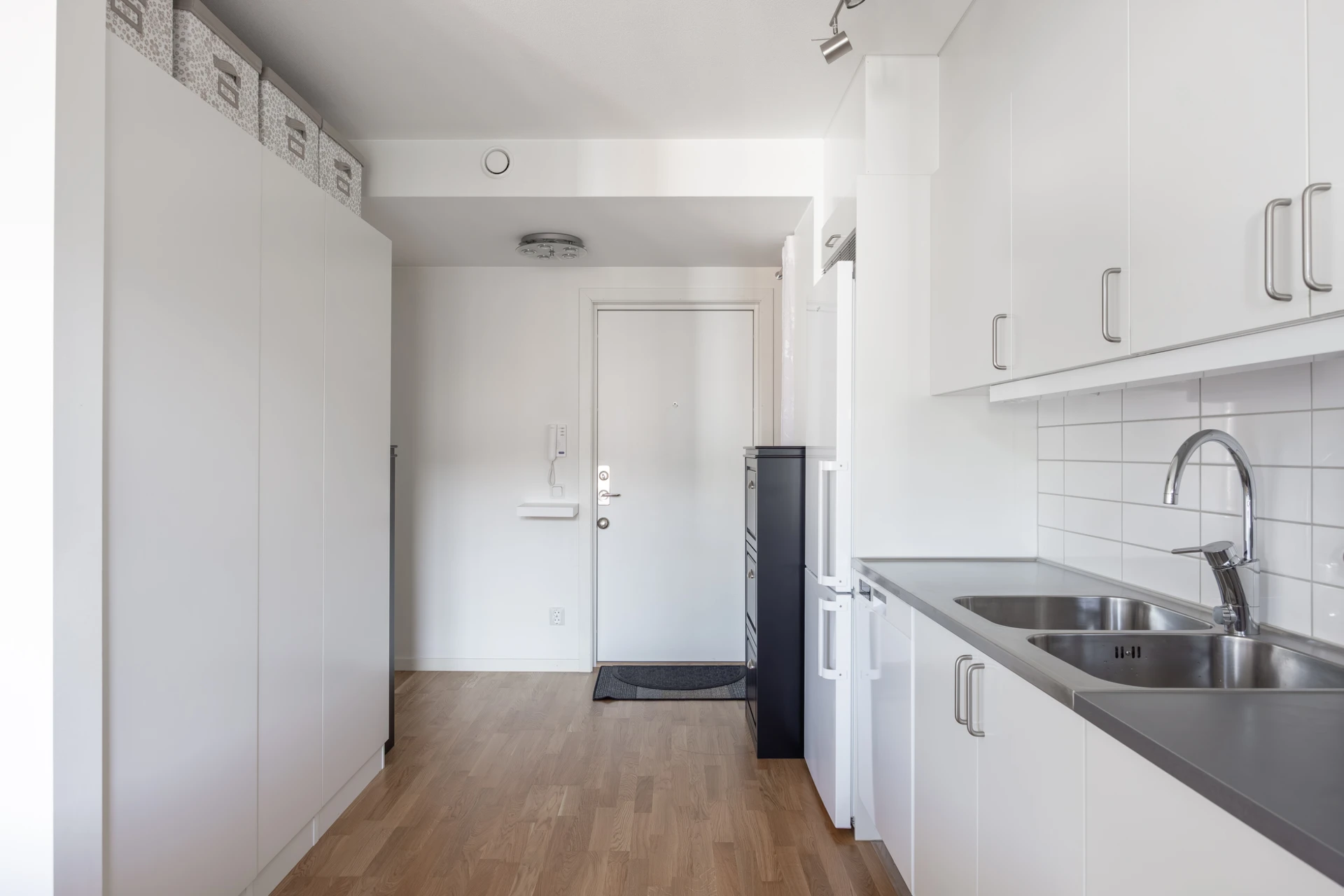 Parkettgolv och vitmålade väggar. Köksinredning från Marbodal i vitt med vitt kakel ovan arbetsytor, grå bänkskiva i laminat och ett bord med plats för fyra stolar. Den maskinella utrustningen består av kombinerad kyl/frys, fläkt, ugn, induktionshäll och diskmaskin från Cylinda-15.