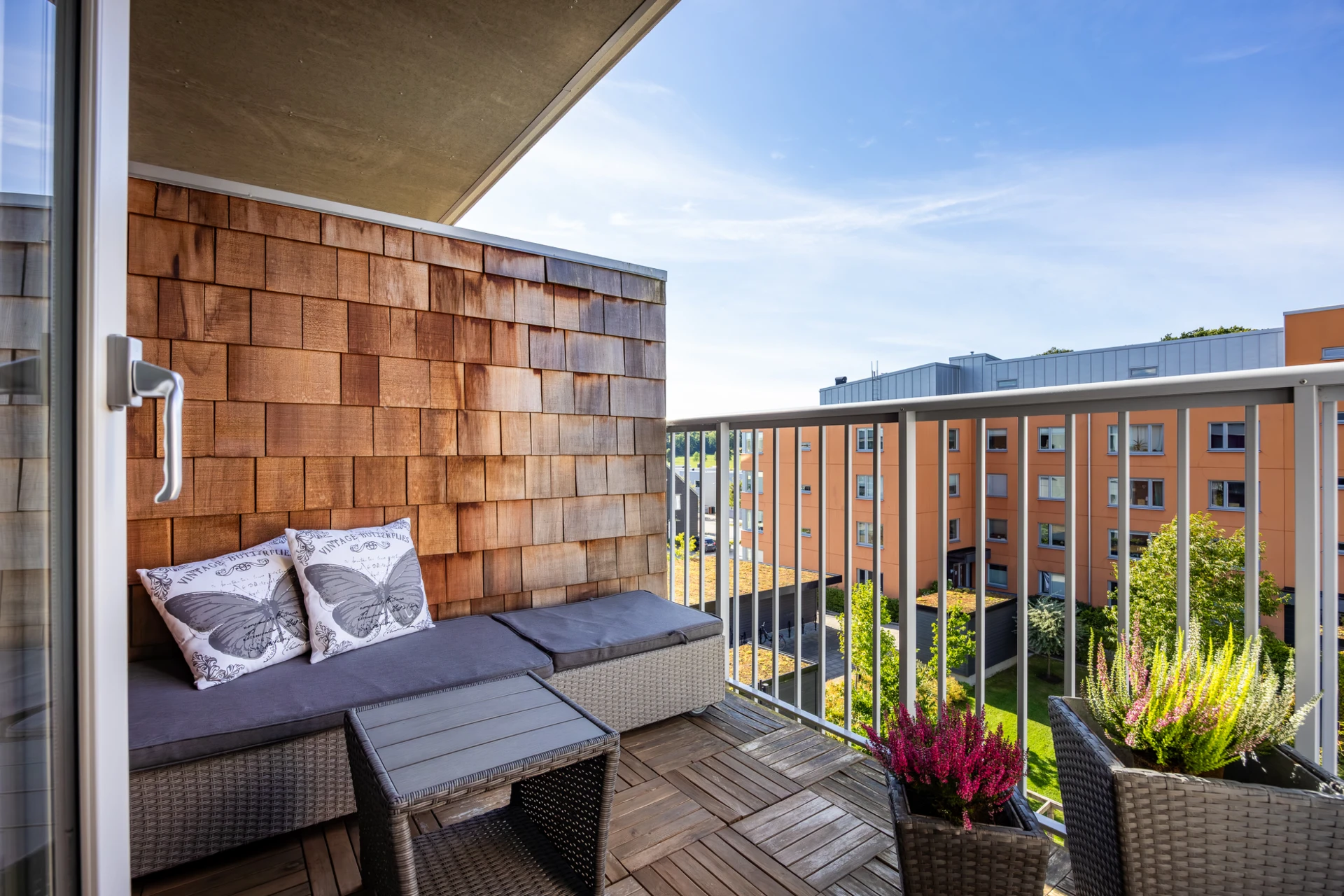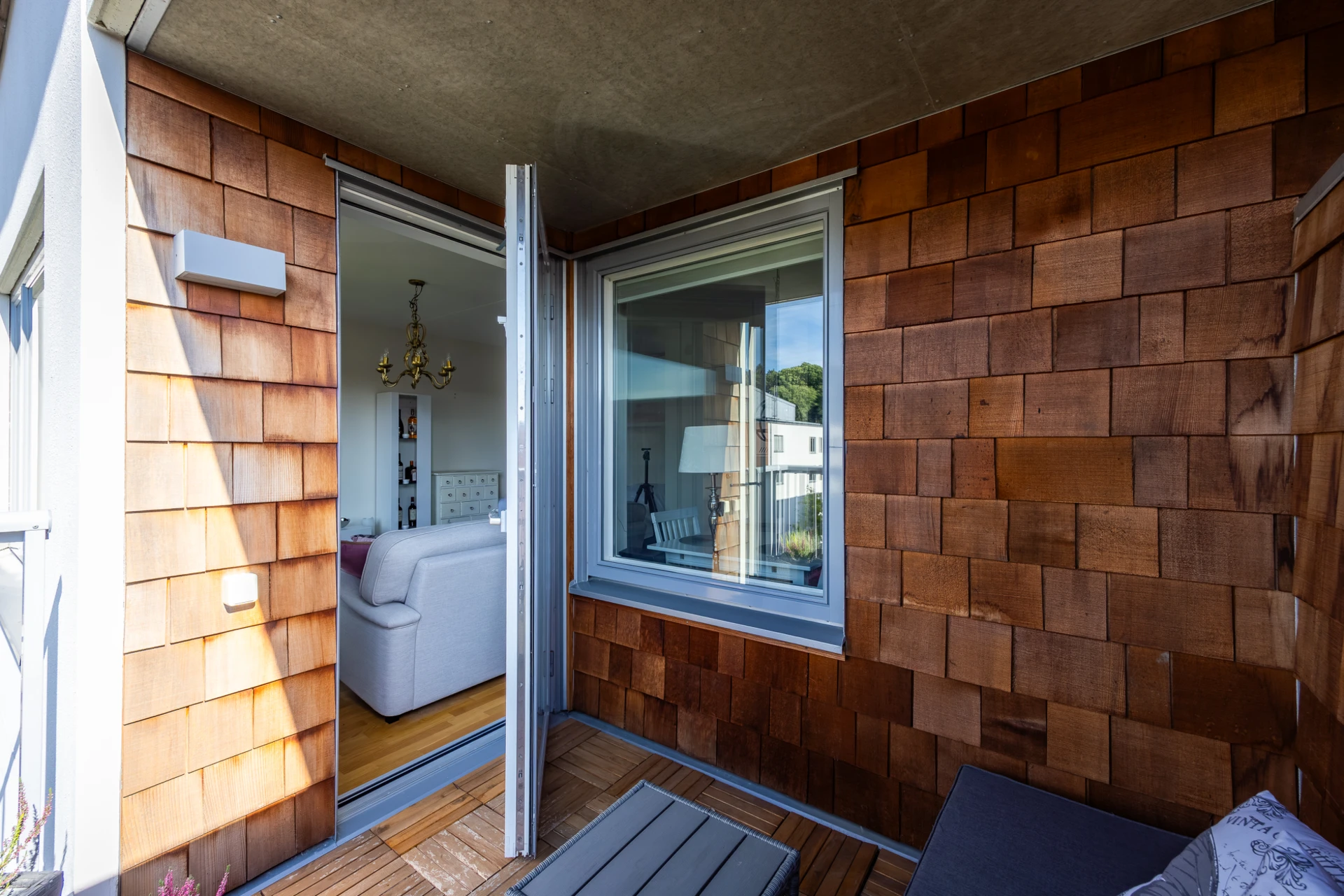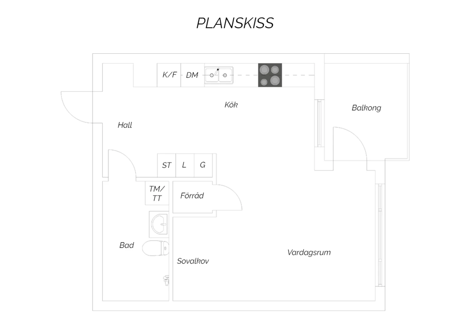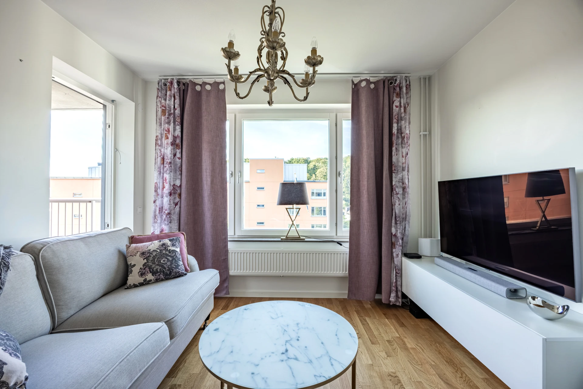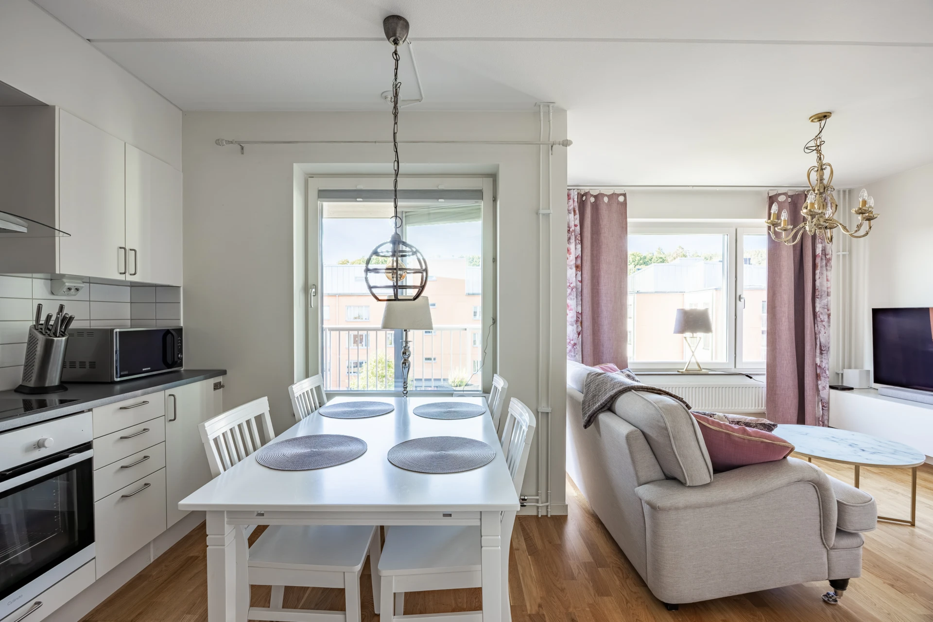 Parkettgolv och vit målade väggar. Här finns plats för soffgrupp och en arbetsplats. Från vardagsrummet har man direkt access till balkongen som vetter åt väst. Perfekt för att njuta av eftermiddag/kvällssolen. Centralt placerat i vardagsrummet har lägenheten även en rymlig klädkammare/förråd utöver garderober.