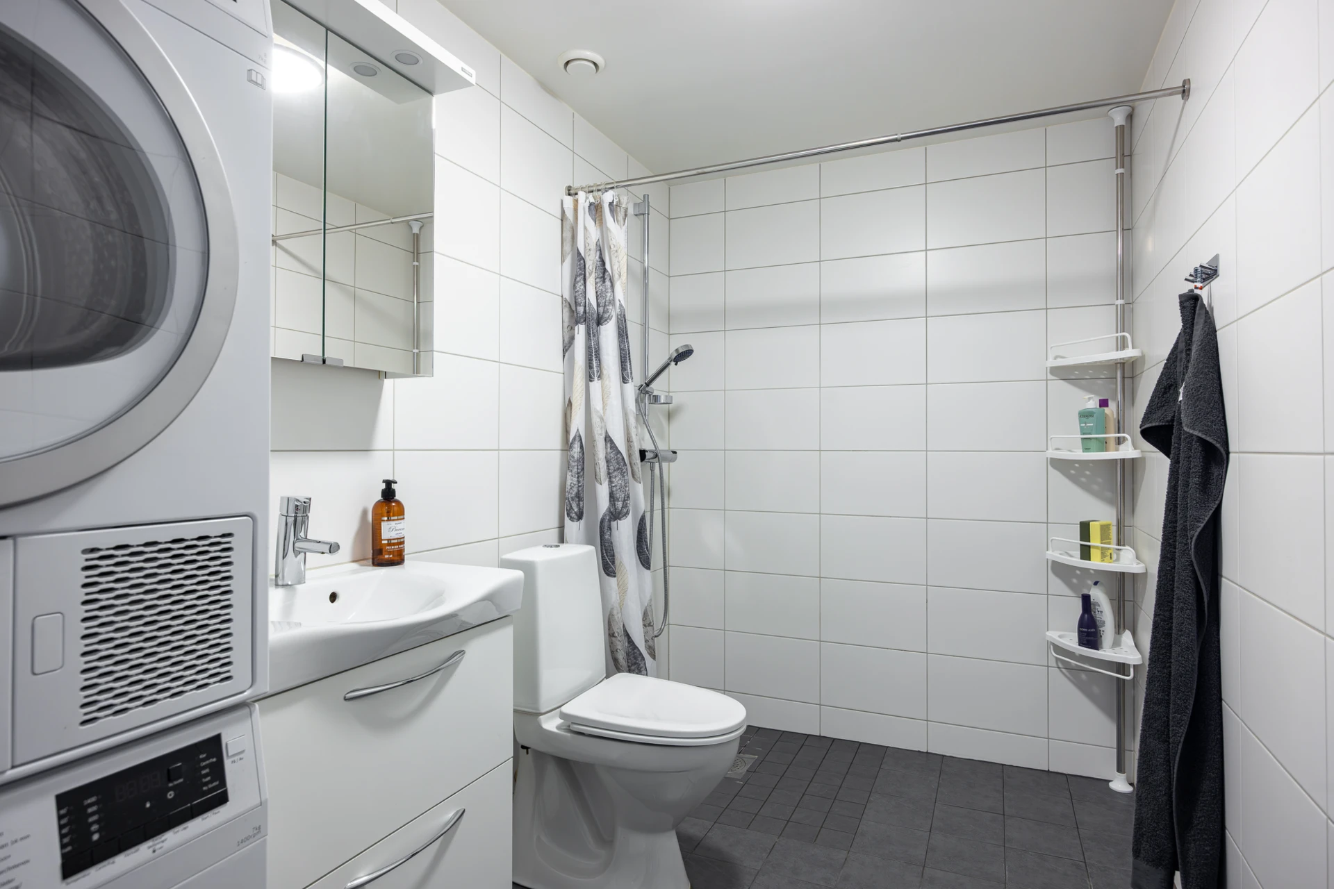 Badrummet bjuder på bekvämligheter i form av er egen tvättutrustning.