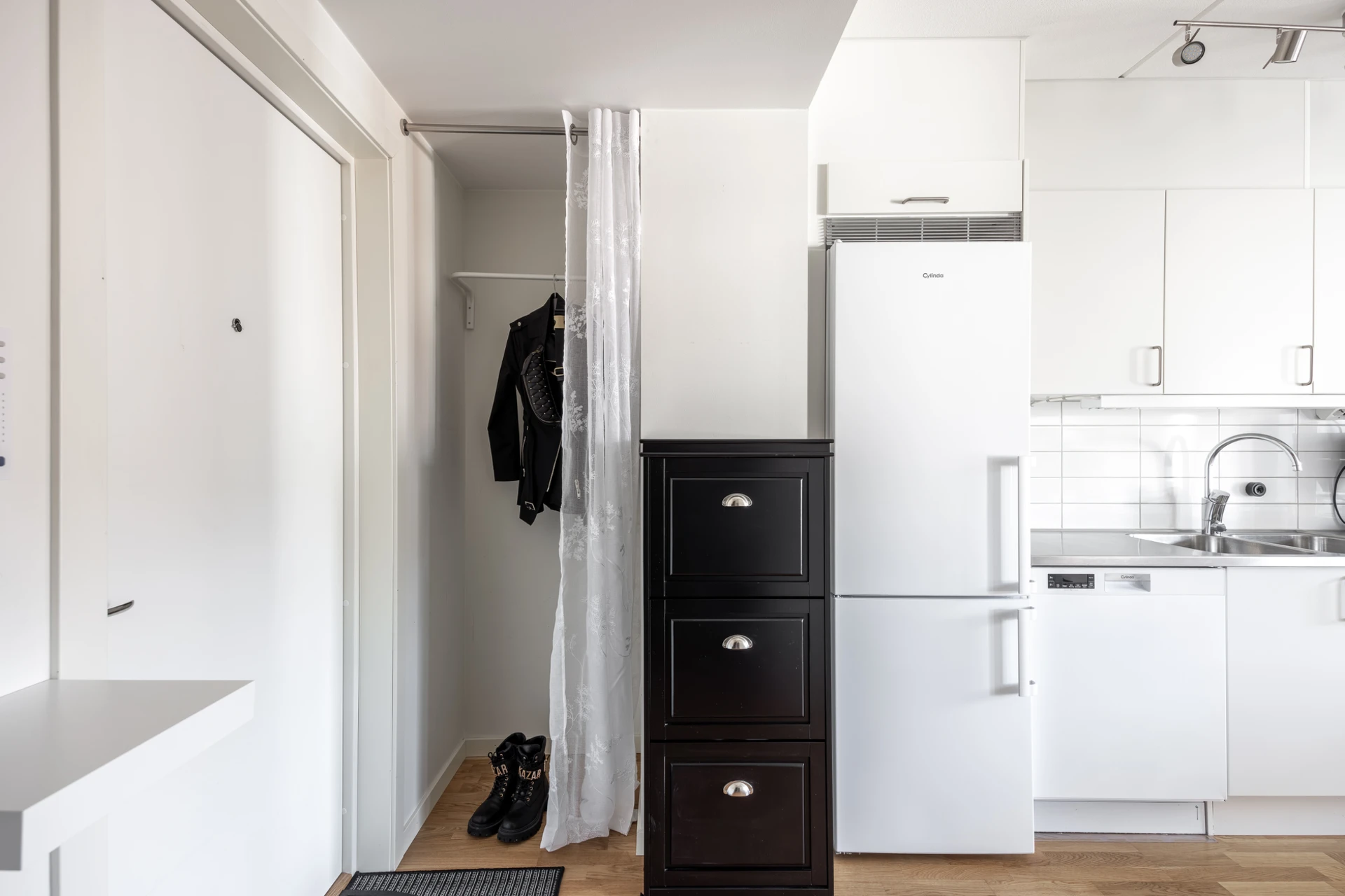 Parkettgolv och vitmålade väggar. Här finns gott om plats för avhängning och förvaring. Platsbyggda garderober.