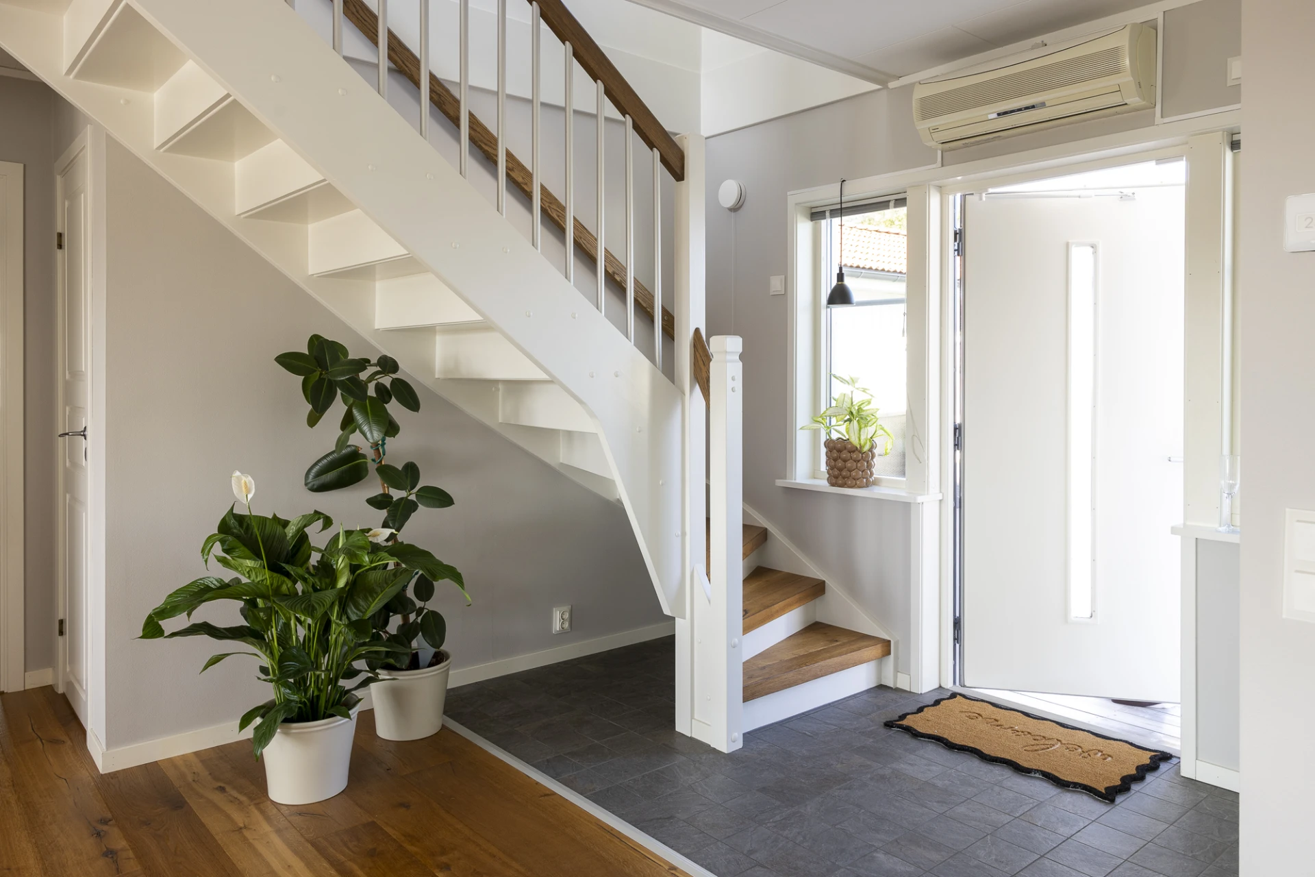 Luft/vattenpump via vattenburen golvvärme i entréplan, vattenburna radiatorer öv