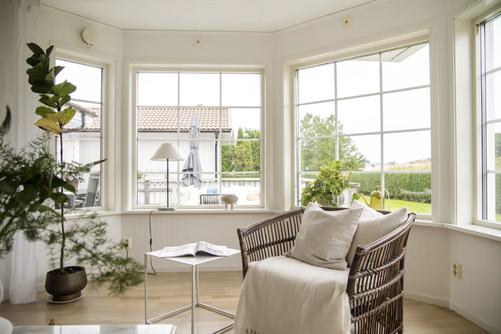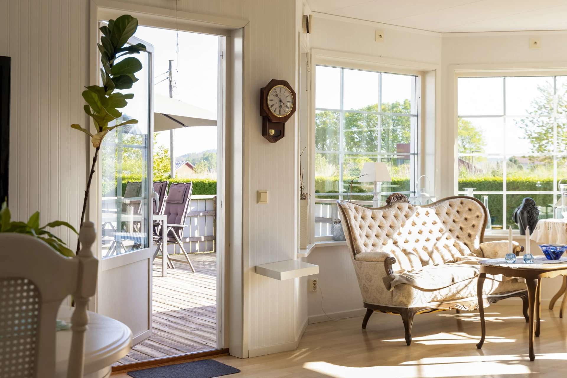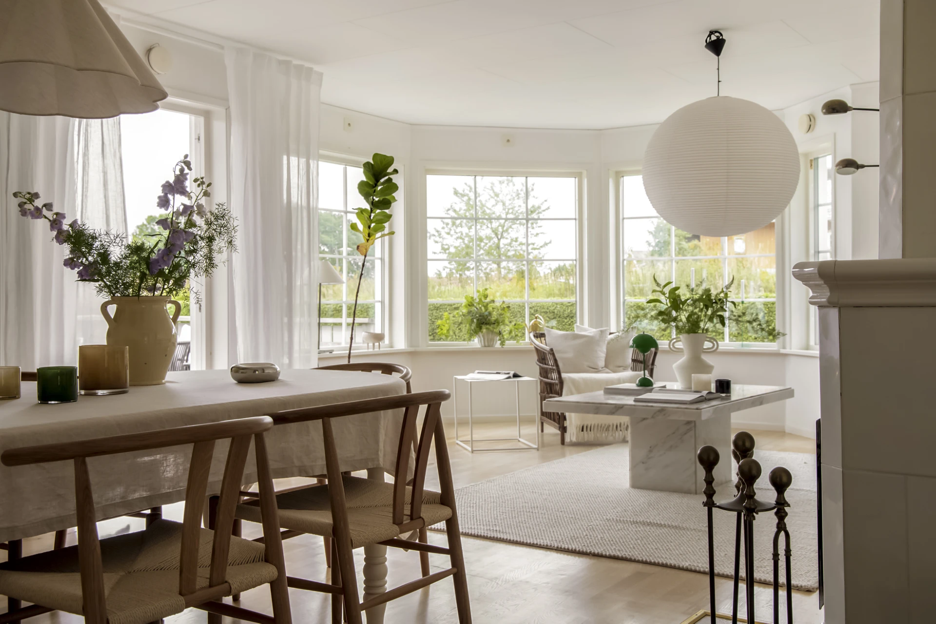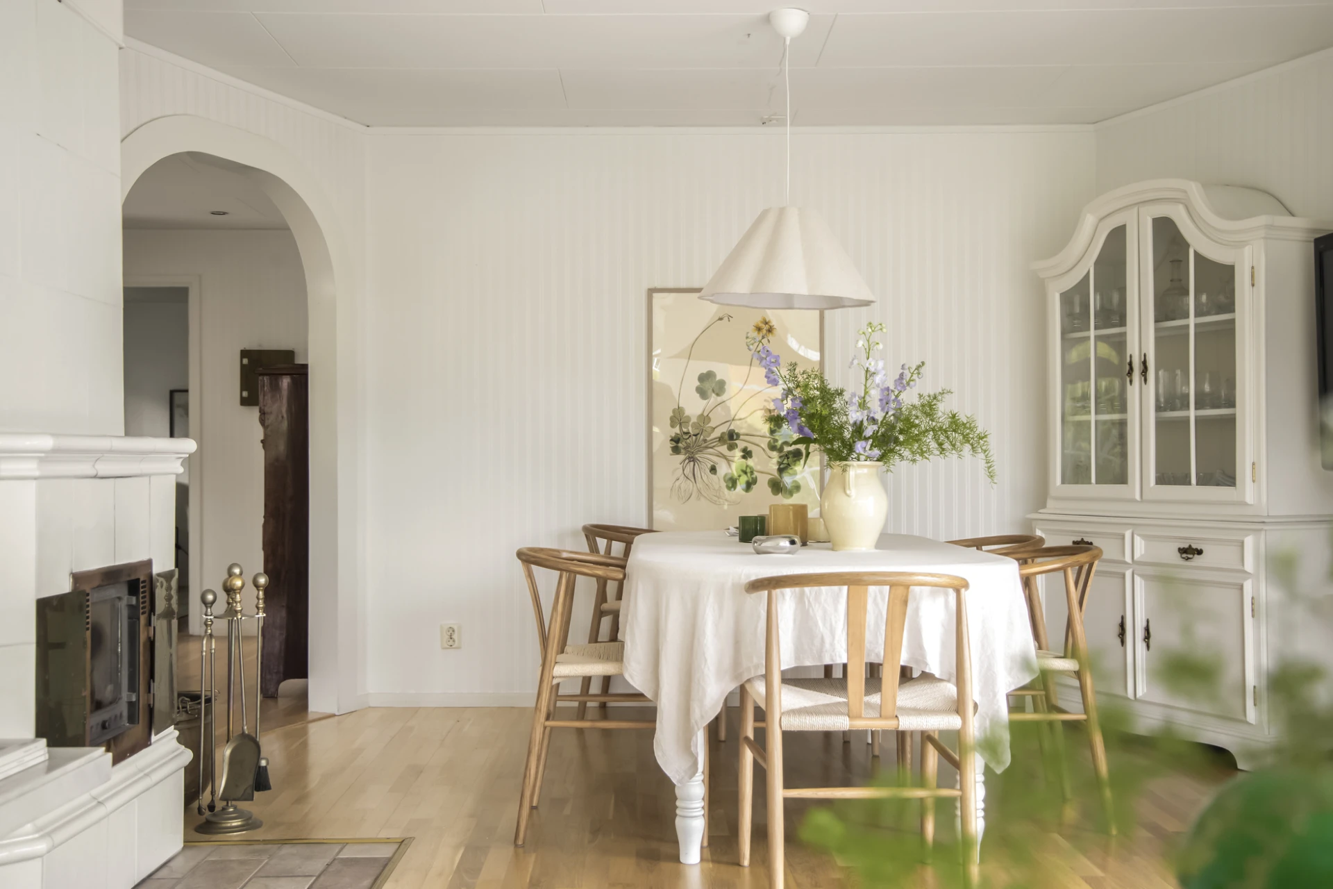 Ekparkett och väggar tapetserade i vitt. Rummet erbjuder plats för en stor soffgrupp med tillhörande möblemang samt ett matbord. Härliga ljusinsläpp från två burspråk och en kakelugn som sprider värme. Härifrån når man bostadens altan i söder.