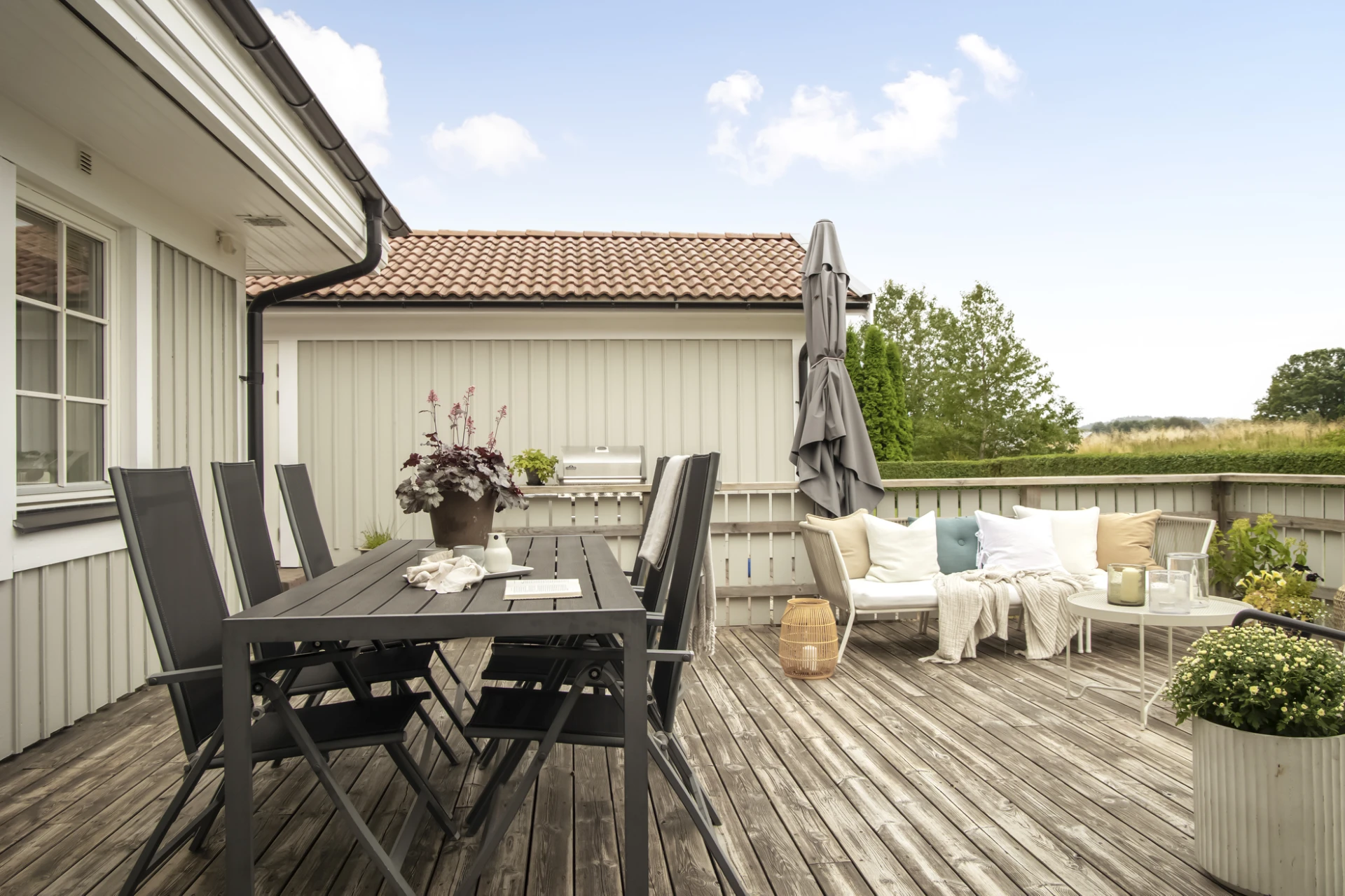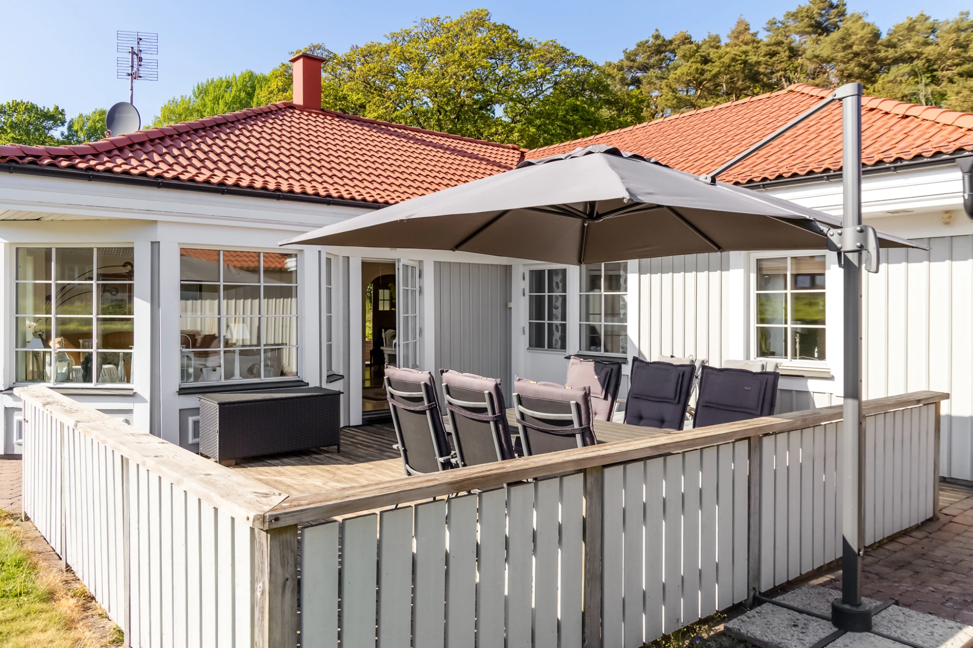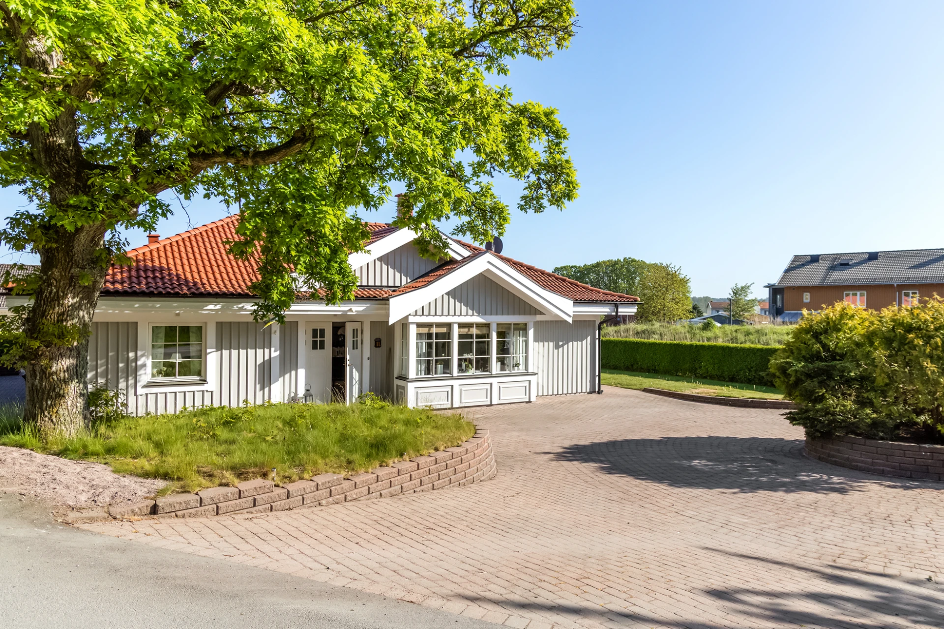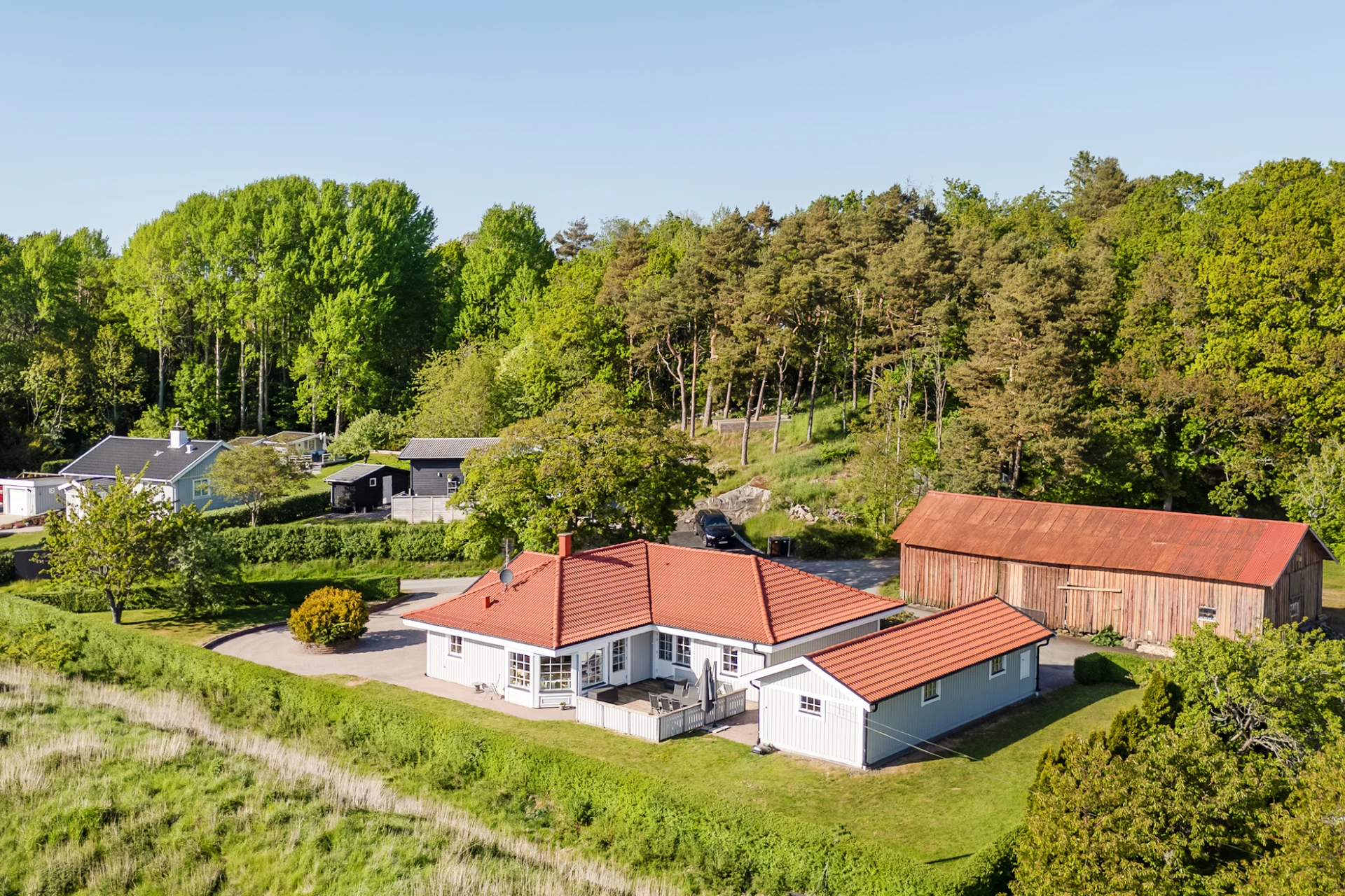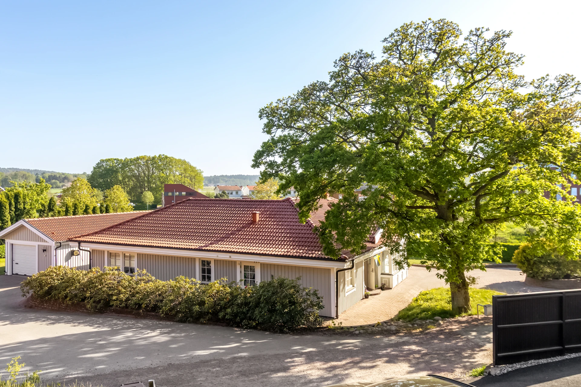 Ekparkett och väggar tapetserade i vitt. Rummet erbjuder plats för en stor soffgrupp med tillhörande möblemang samt ett matbord. Härliga ljusinsläpp från två burspråk och en kakelugn som sprider värme. Härifrån når man bostadens altan i söder.