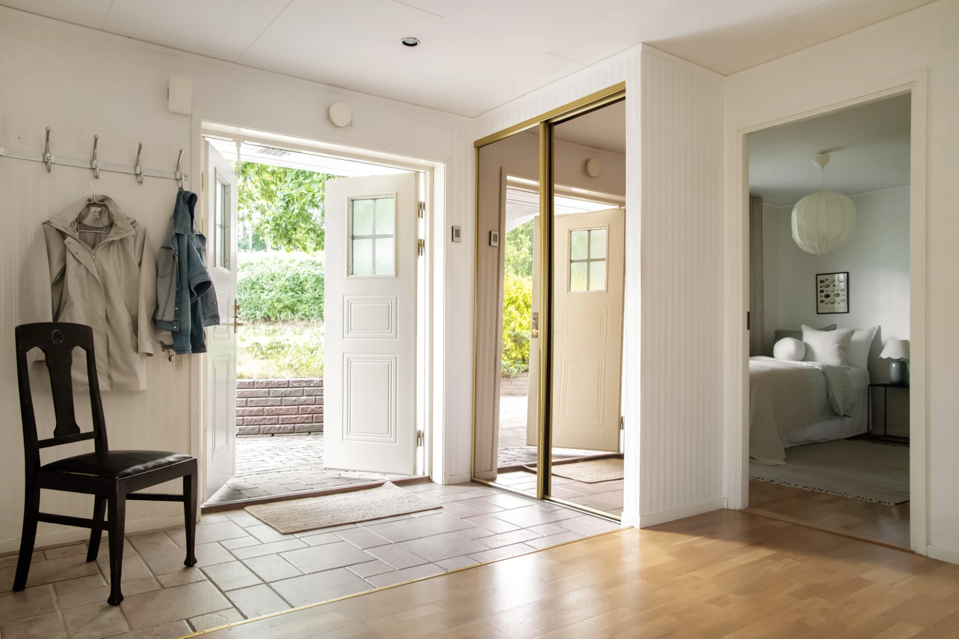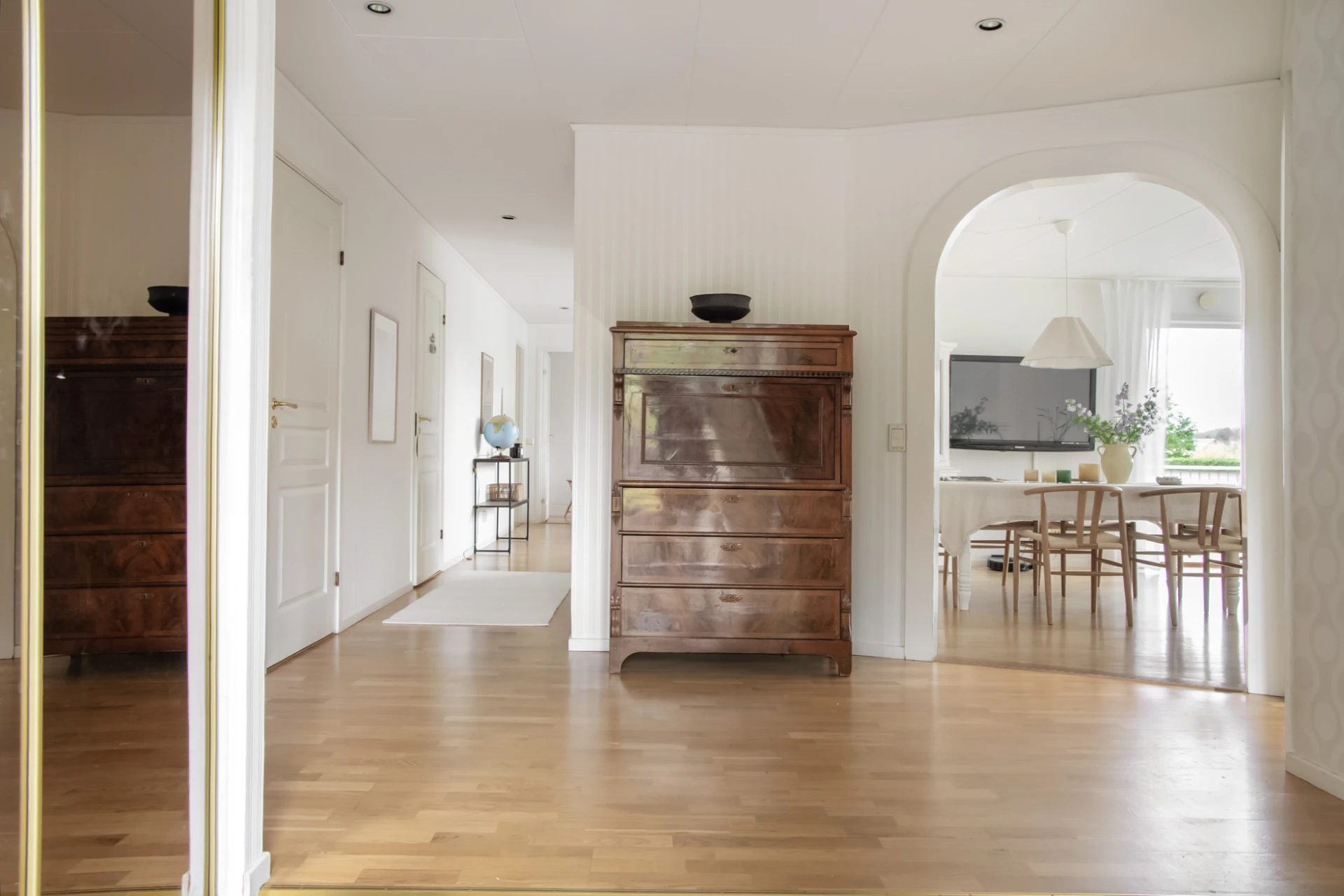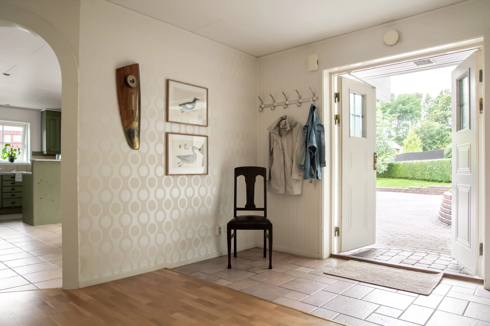 Ekparkett och klinker samt vitmålade väggar. Förvaringen och avhängningen består av en platsbyggd skjutdörrsgarderob och i klädkammare.