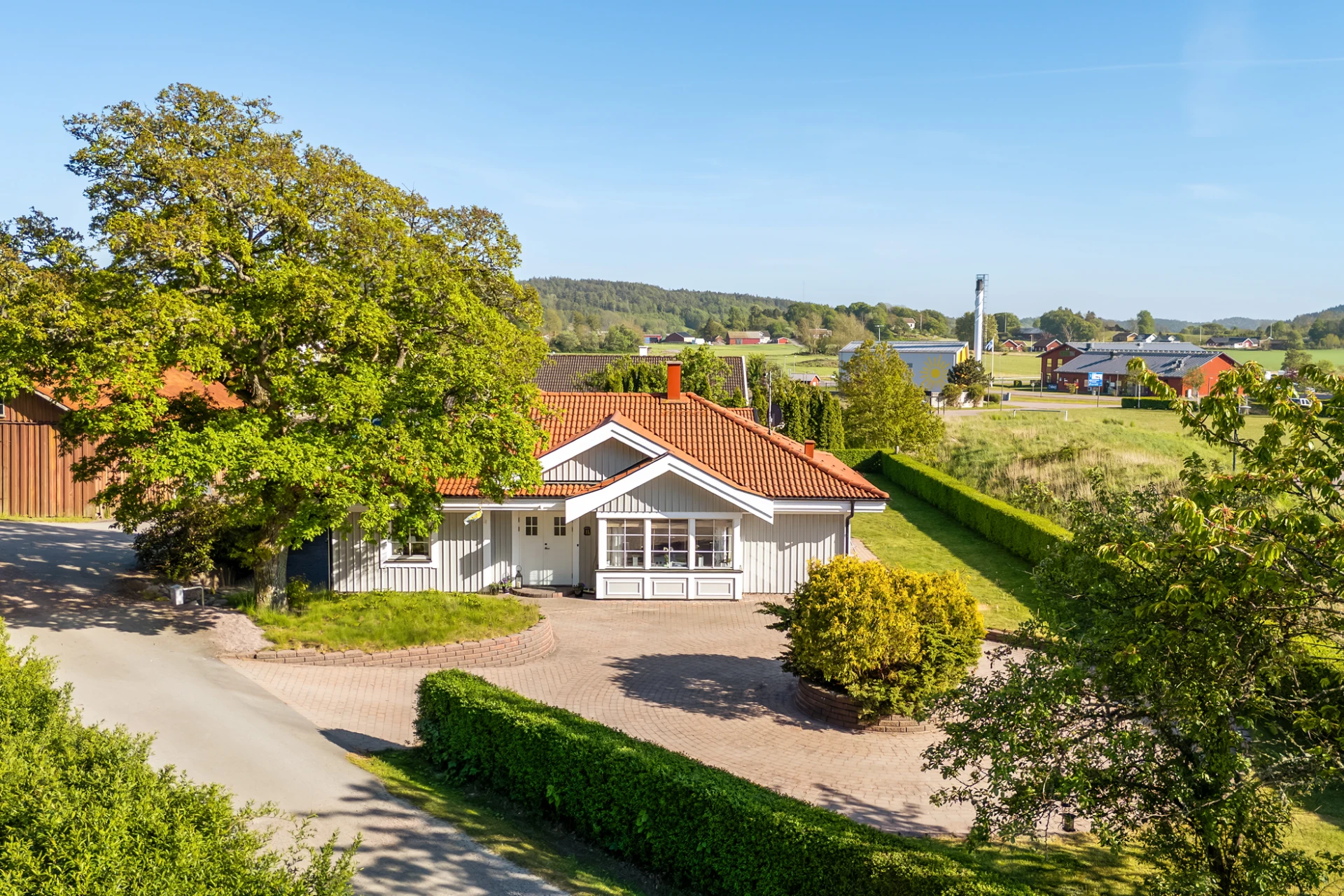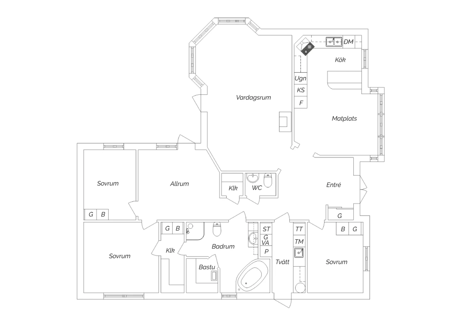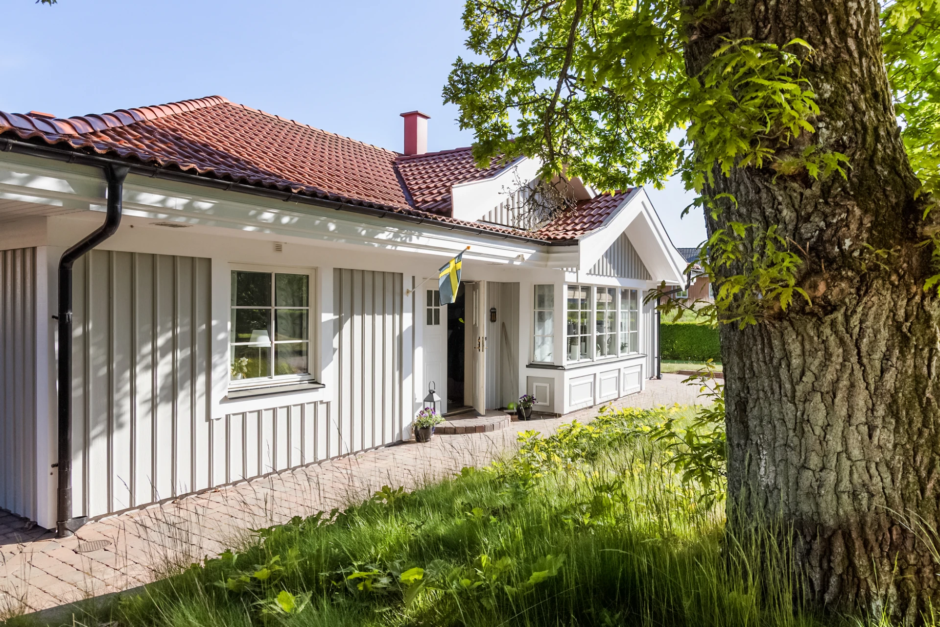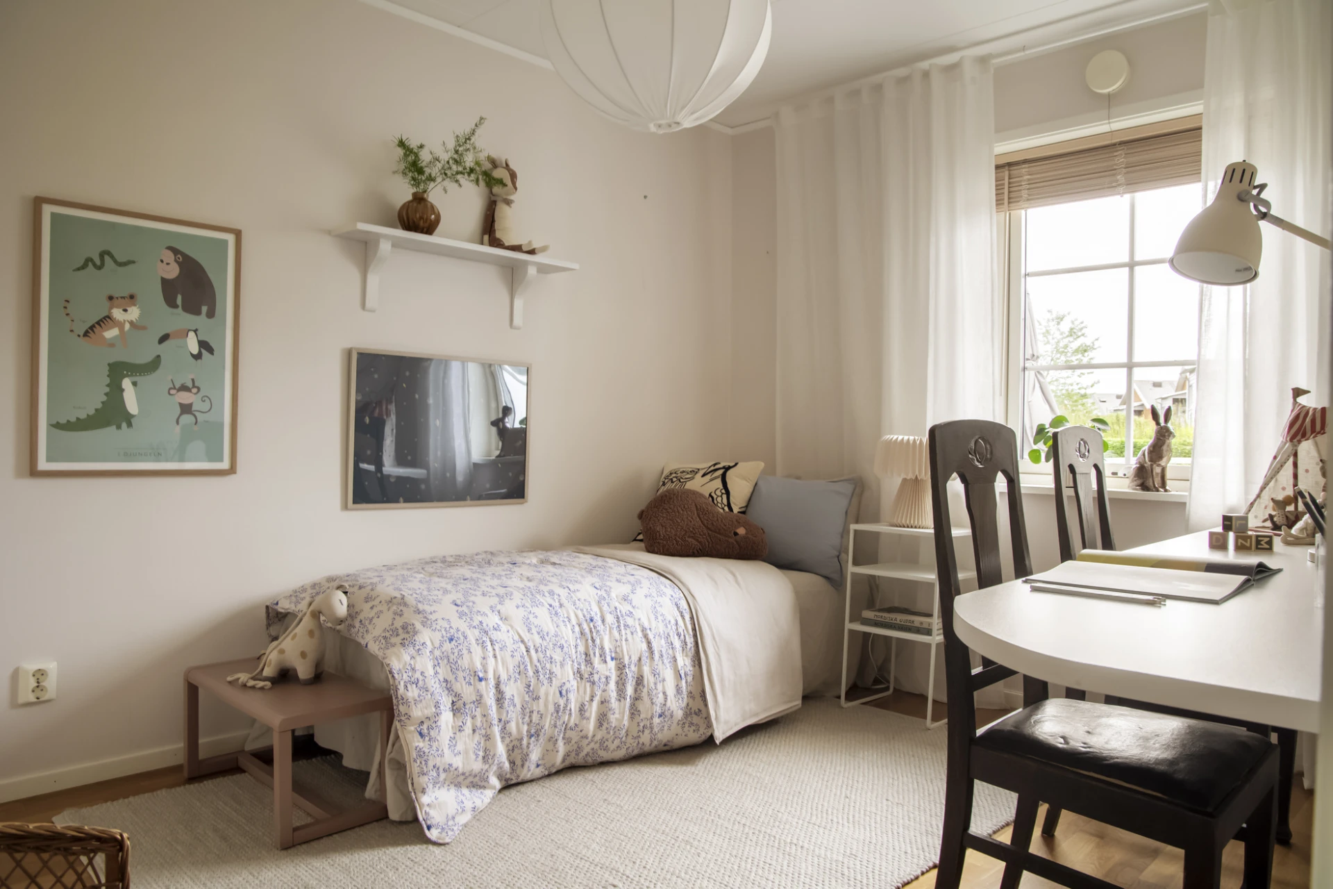 Ekparkett och klinker samt vitmålade väggar. Förvaringen och avhängningen består av en platsbyggd skjutdörrsgarderob och i klädkammare.
